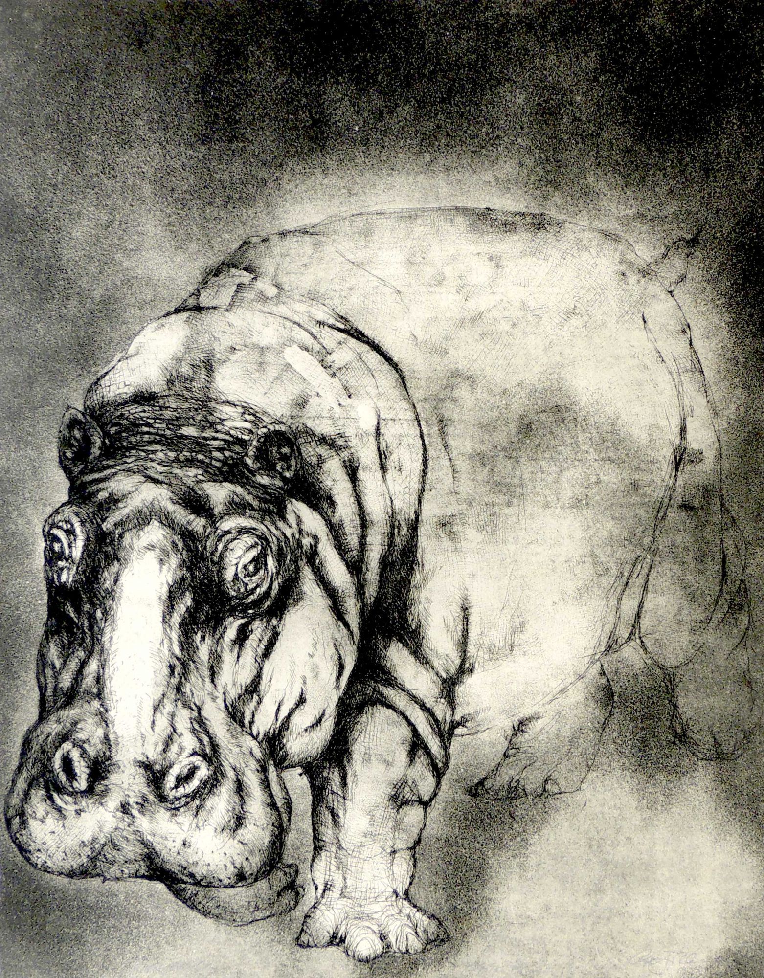 n.p.: Cheloniidae, n.d.. Fine. State Proof. This marvelous black and white etching of a walking hippopotamus is a one of a kind print signed by renowned artist and printer Alan James Robinson, particularly well known for his depiction of animals, birds, and nature. He founded the Cheloniidae Press in 1979, and his work can be found in many public and private collections around the country. The hippo appears to be walking toward the viewer with his head done in particular detail. In fine condition. 22 x 28.5 inches. PRINTS/072517.
