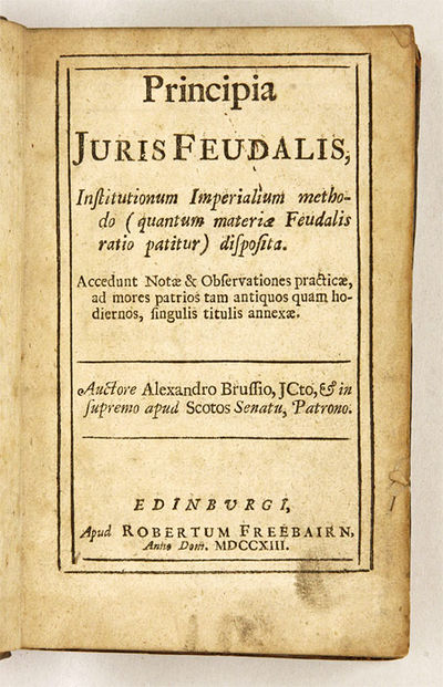 1713. Edinburgh: Apud Robertum Freebairn, 1713. Edinburgh: Apud Robertum Freebairn, 1713. A Treatise on Scots Feudal Law Patterned on Justinian Bruce, Alexander [d. 1729]. Principia Juris Feudalis, Institutionum Imperialium Methodo (Quantum Materiae Feudalis Ratio Patitur) Disposita. Accedunt Notae & Observationes Practicae, ad Mores Patrios Tam Antiquos Quam Hodiernos, Singulis Titulis Annexae. Edinburgh: Apud Robertum Freebairn, 1713. [viii], xix, [5], 352 pp. 12mo. (6" x 4"; 15.2 x 10.2 cm). Contemporary calf, blind rules to board, blind fillets along joints. A few minor nicks and worm holes to boards, moderate rubbing to extremities, joints just starting, chipping to spine ends, corners bumped and somewhat worn, front hinge cracked, later private-library bookplate to front pastedown. Very light browning to text, faint dampstaining in places, light foxing to some leaves, light soiling and a few finger smudges to title page. $450. * Only edition. Intended for students and laymen, this is a summary of Scottish customary law in the manner of Justinian's Institutes. OCLC locates 13 copies in North American law libraries. English Short-Title Catalogue T116092.