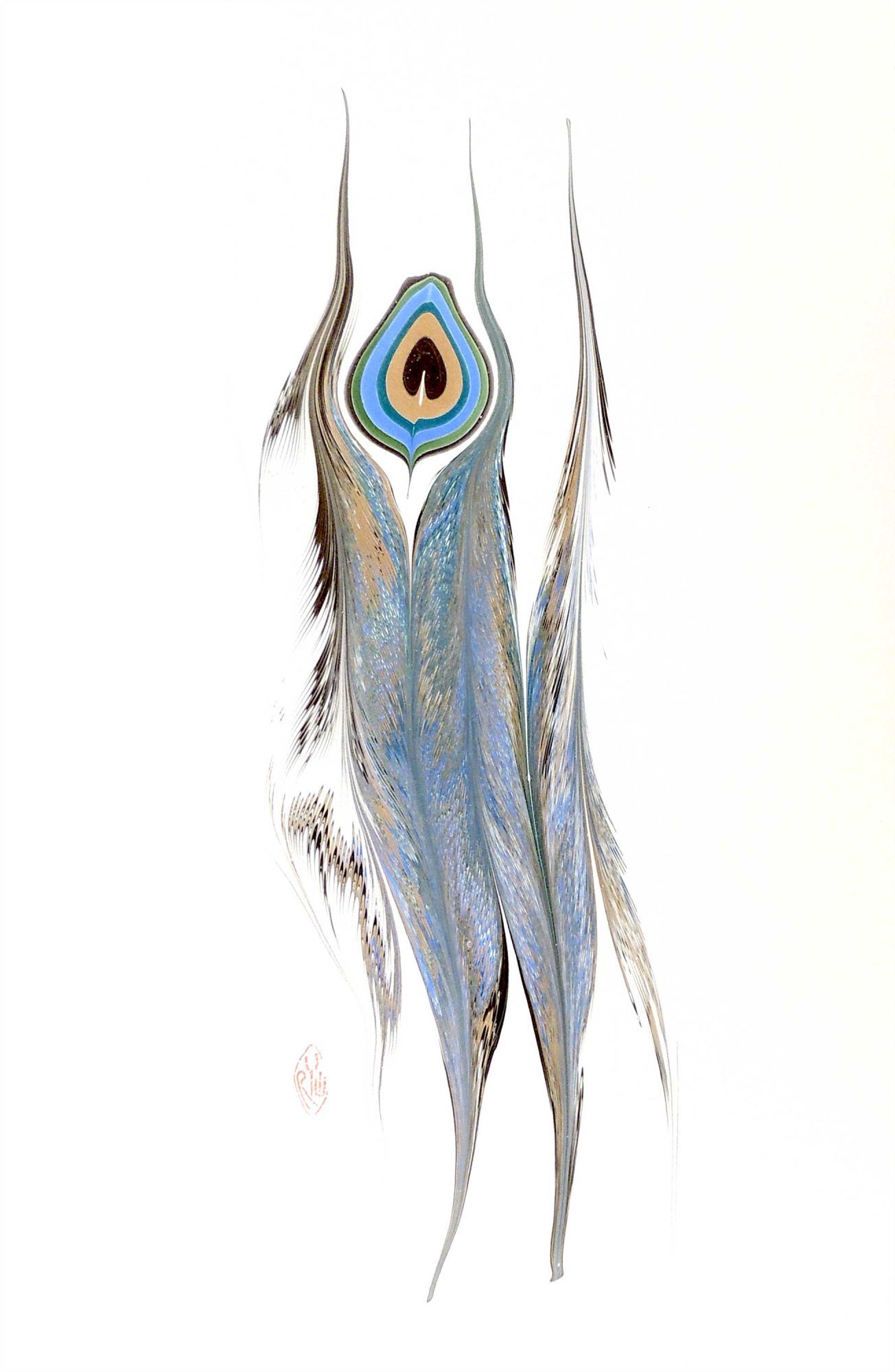 Toronto: Studio Robert Wu, n.d.. Fine. An exquisite hand marbled sheet by master marbler Robert Wu depicting a peacock feather. As the sheets are done individually, each varies slightly and is unique. Wu has been experimenting with paper marbling for many years and has developed a unique take on this traditional art form which he calls “marbled graphics.”