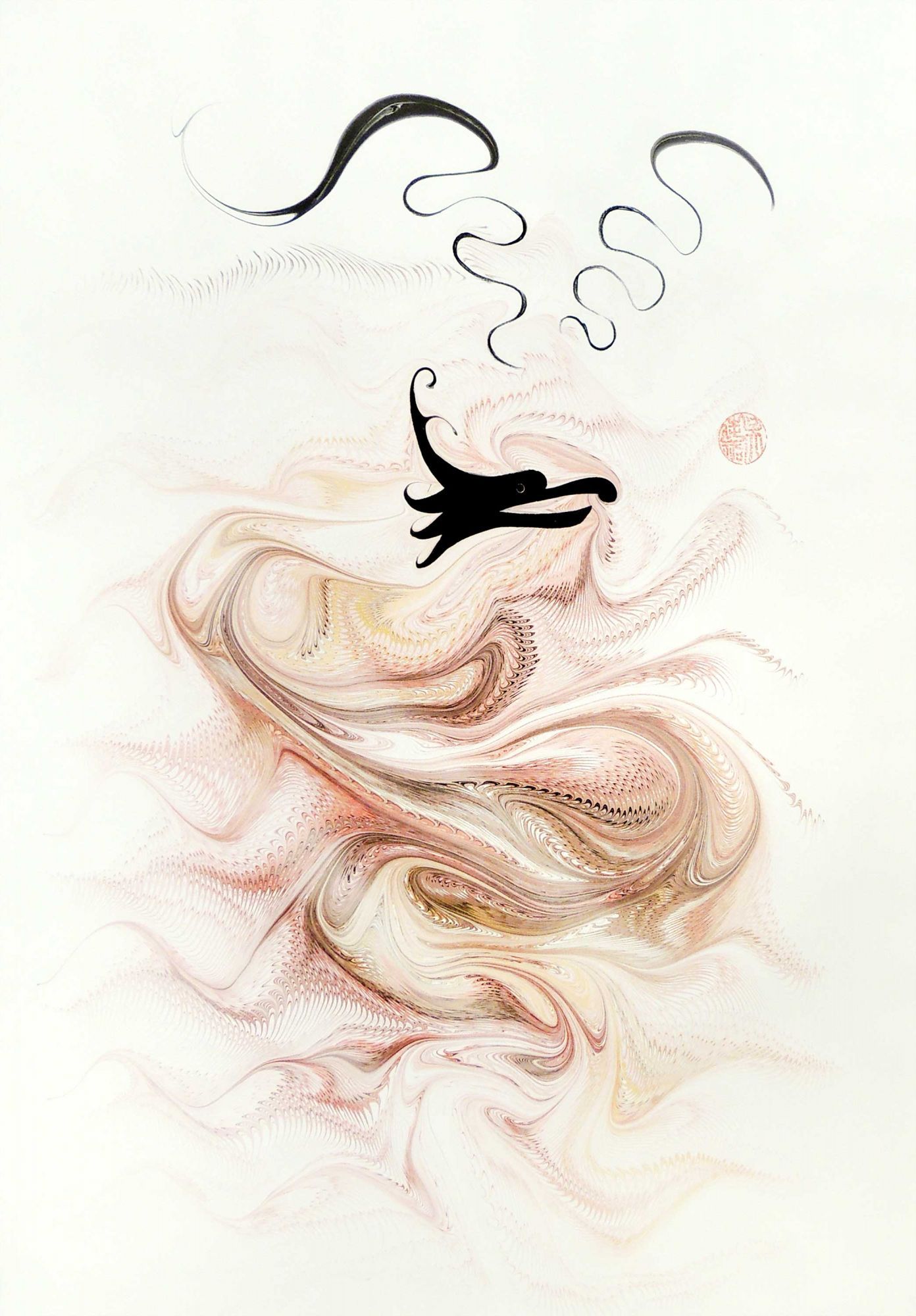 Toronto: Studio Robert Wu, n.d.. Fine. An exquisite hand marbled sheet by master marbler Robert Wu depicting a Dragon. As the sheets are done individually, each varies slightly and is unique. Wu has been experimenting with paper marbling for many years and has developed a unique take on this traditional art form which he calls “marbled graphics.”
