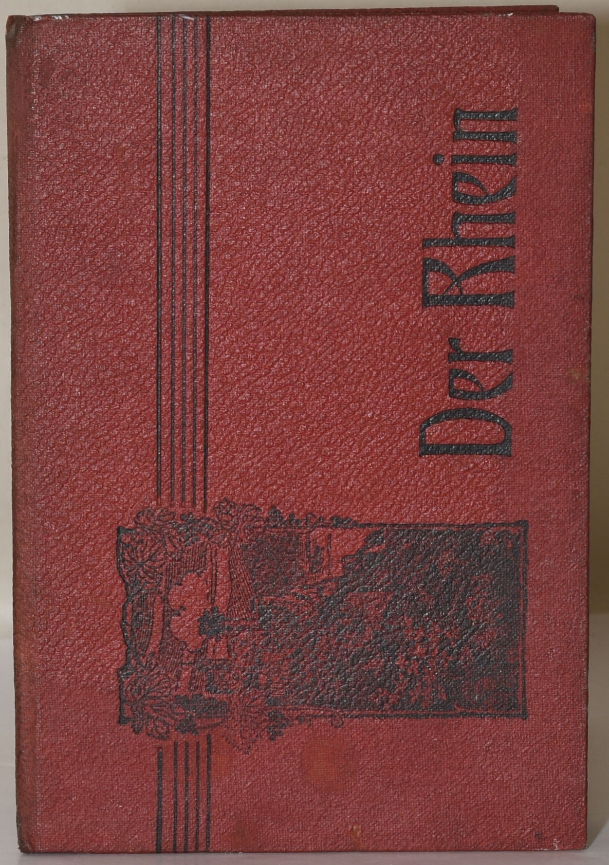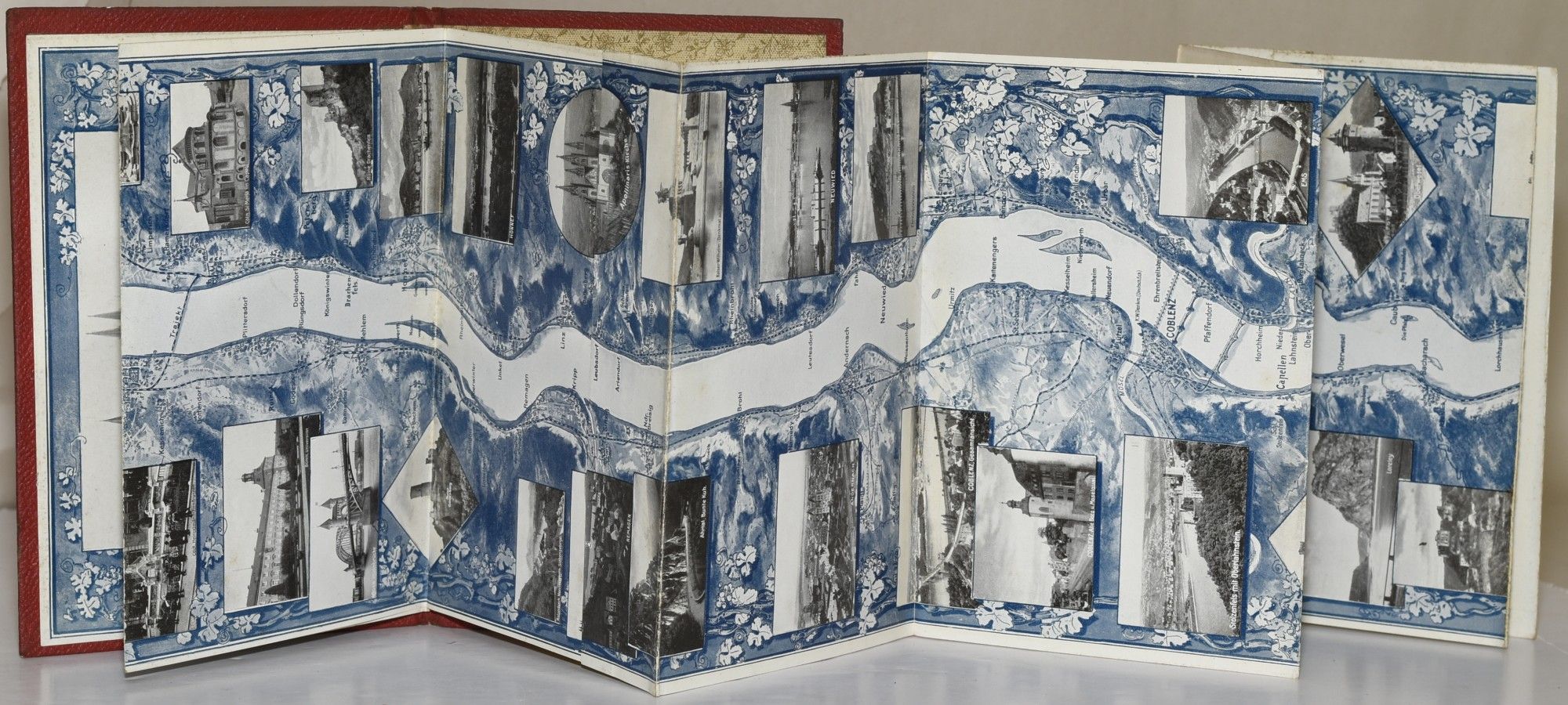 Koln: H. Siebenhar, 1900. Perhaps from the turn of the century, a Rheinpanorama, printed in blue with black and white, postcard-like photographic images of sites along the course of the Rhine. The Rhine Valley was a tourist mecca, and the river made for leisurely touring. The map is 6 1/2" wide and over 4' long, folded accordion style and bound up on in book form. There is a small chip at the end of one fold; otherwise intact with no repairs. In red pebbled cloth stamped in black.