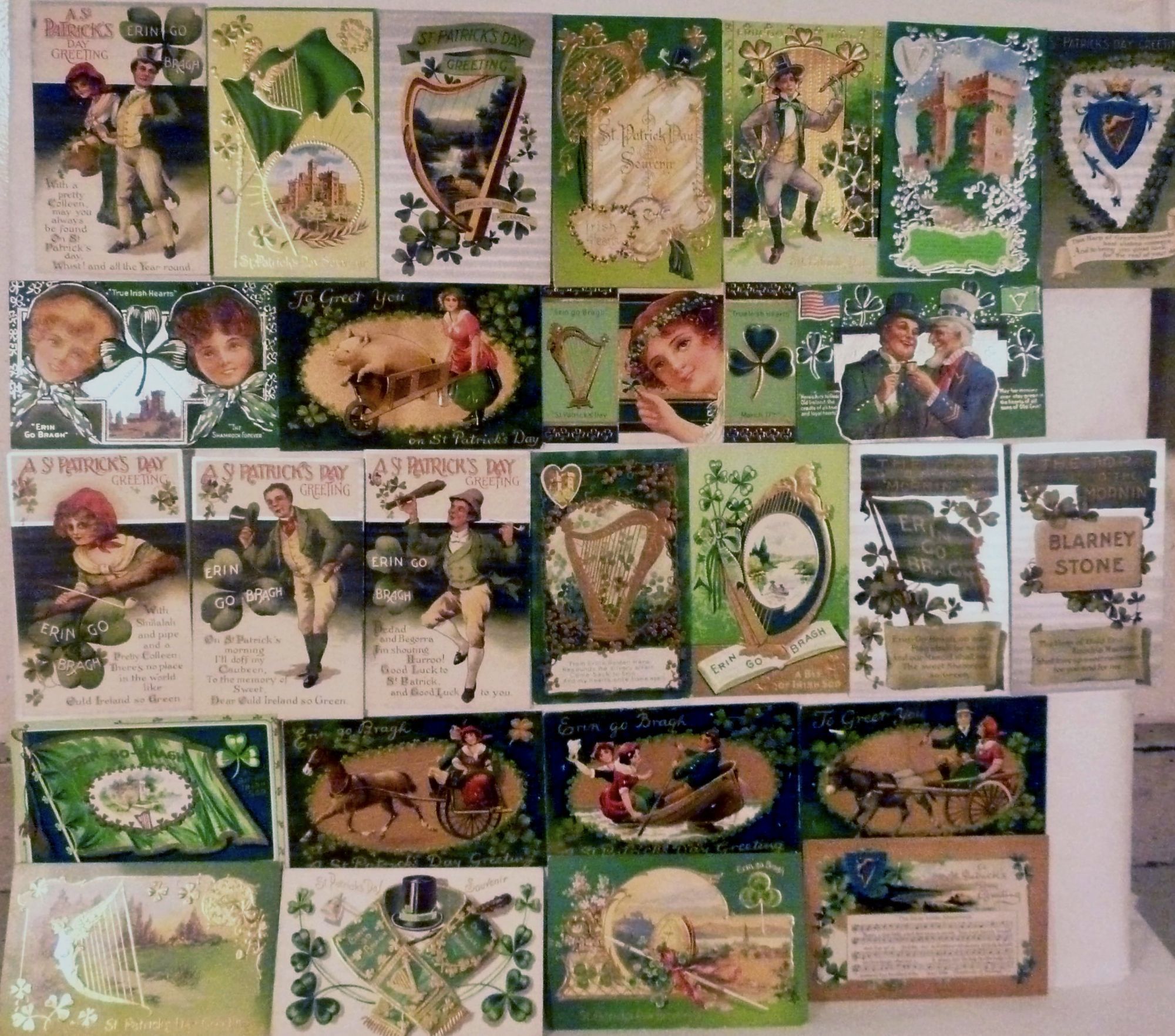 14 x 9 cm. [5 1/2 x 3 1/2 inches]. Total of 68 unduplicated, early 20th century St. Patrick's Day postcards, 57 embossed chromolithographs, and 11 color lithographs, many presenting views of local landmarks -- Dublin, Waterford, Blarney Castle, Old Weir Bridge, Upper Lake (Killarney) and Lakes of Killarney. All in fine condition.