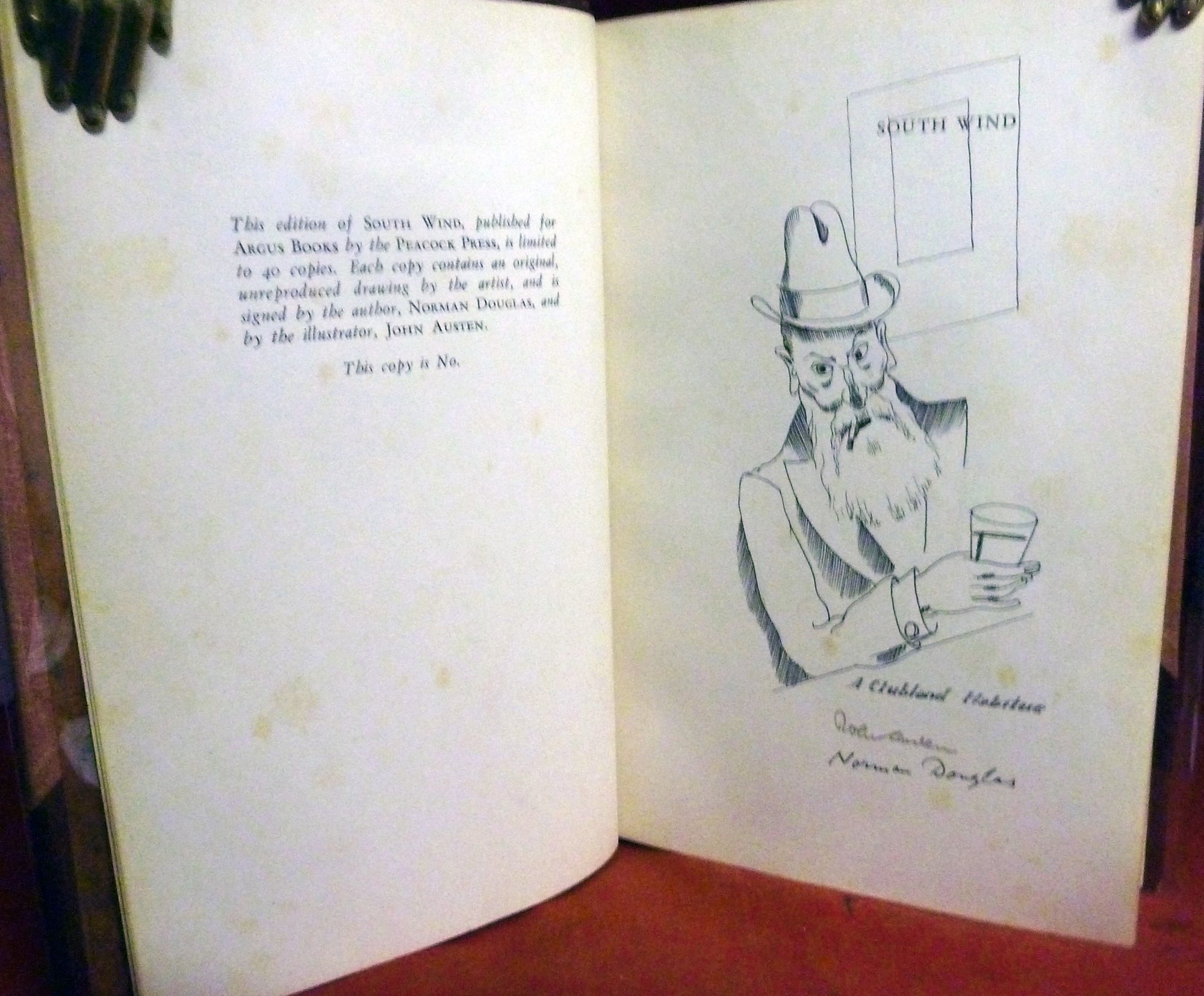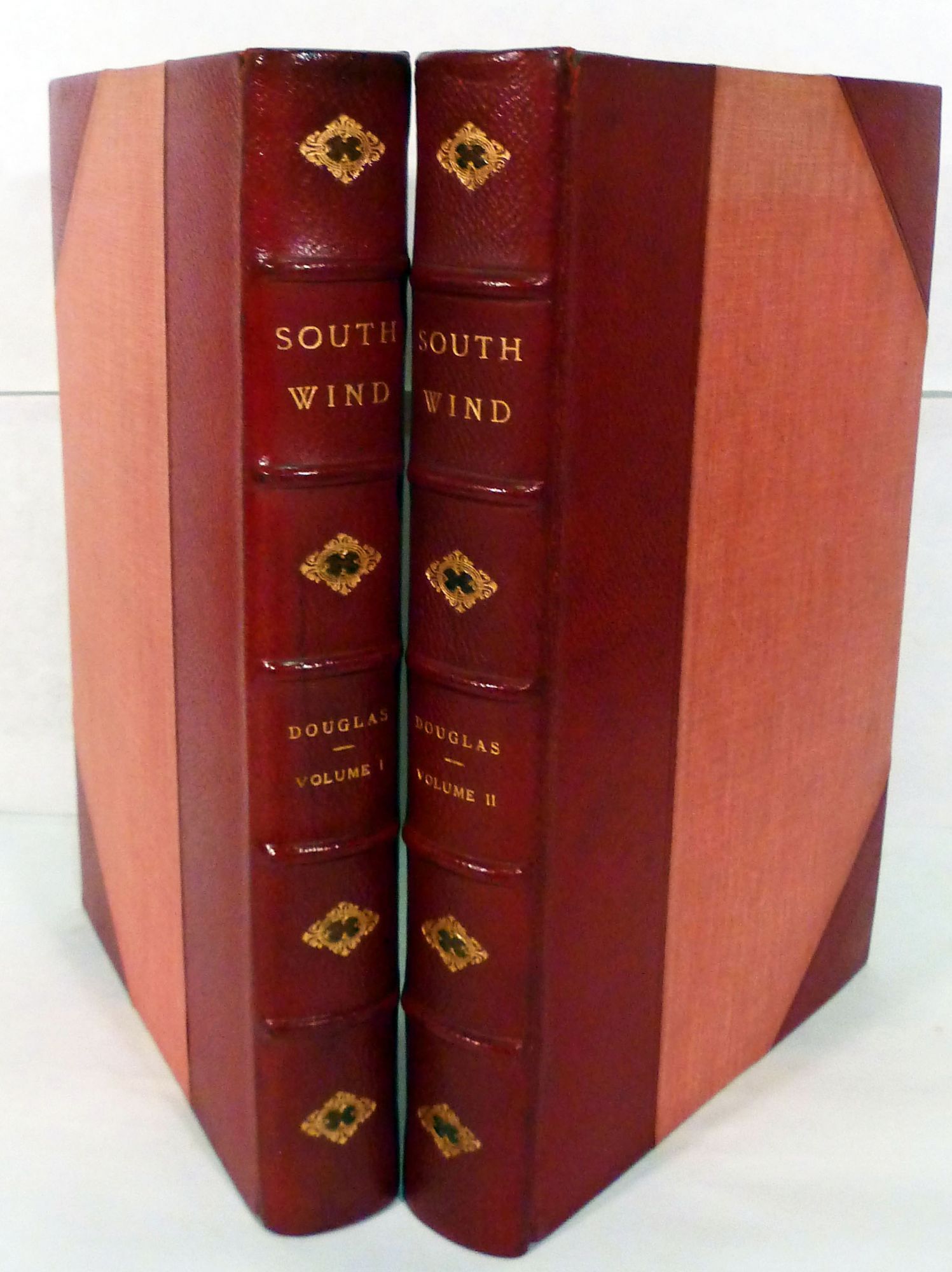 Chicago: Argus Books, 1929. First illustrated edition. Hardcover. Three quarter red morocco and red cloth. Teg. Near fine. 2 vols. Austen, John. 288, 300 pages. 24 x 16 cm. Limited edition, one of 40 copies (this copy out of series) signed by Austen and Douglas with an original ink drawing, "A Clubland Habitué," signed by John Austen. Illustrated by Austen, 15 plates of which 5 are colored. Nepenthe, the Italian island is the fictional setting of South Wind, or Capri in light disguise. Norman was perhaps more well known for his scatological limericks rather than his Mediterranean travel works. One commentator noted, that in his day Douglas was regarded as one of the smartest things going. Part of that smartness was his keeping, for the whole of his long depraved life, one jump ahead of the law. Bright, sharp set, raised bands, spine panels lettered and decorated in gilt, marbled endapers.