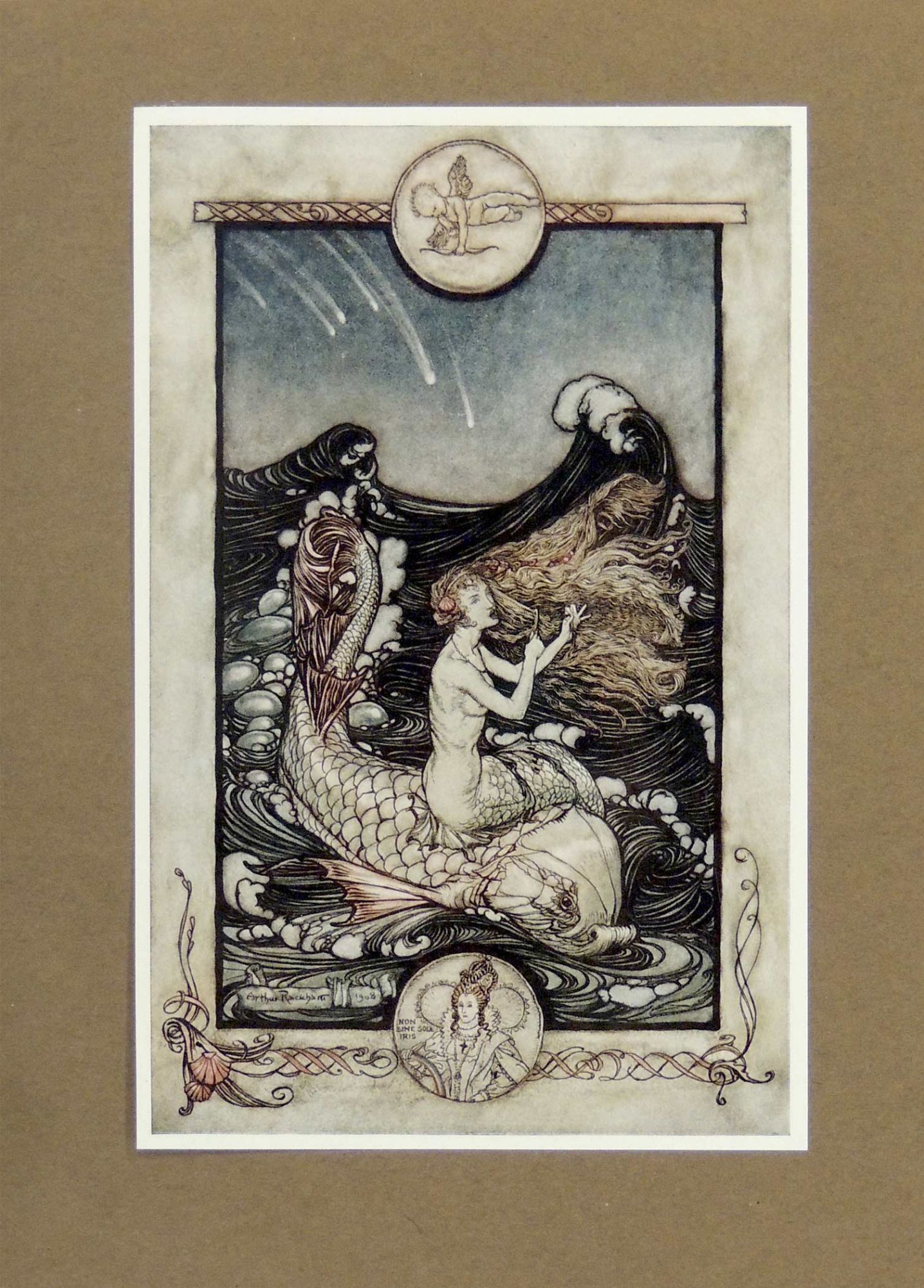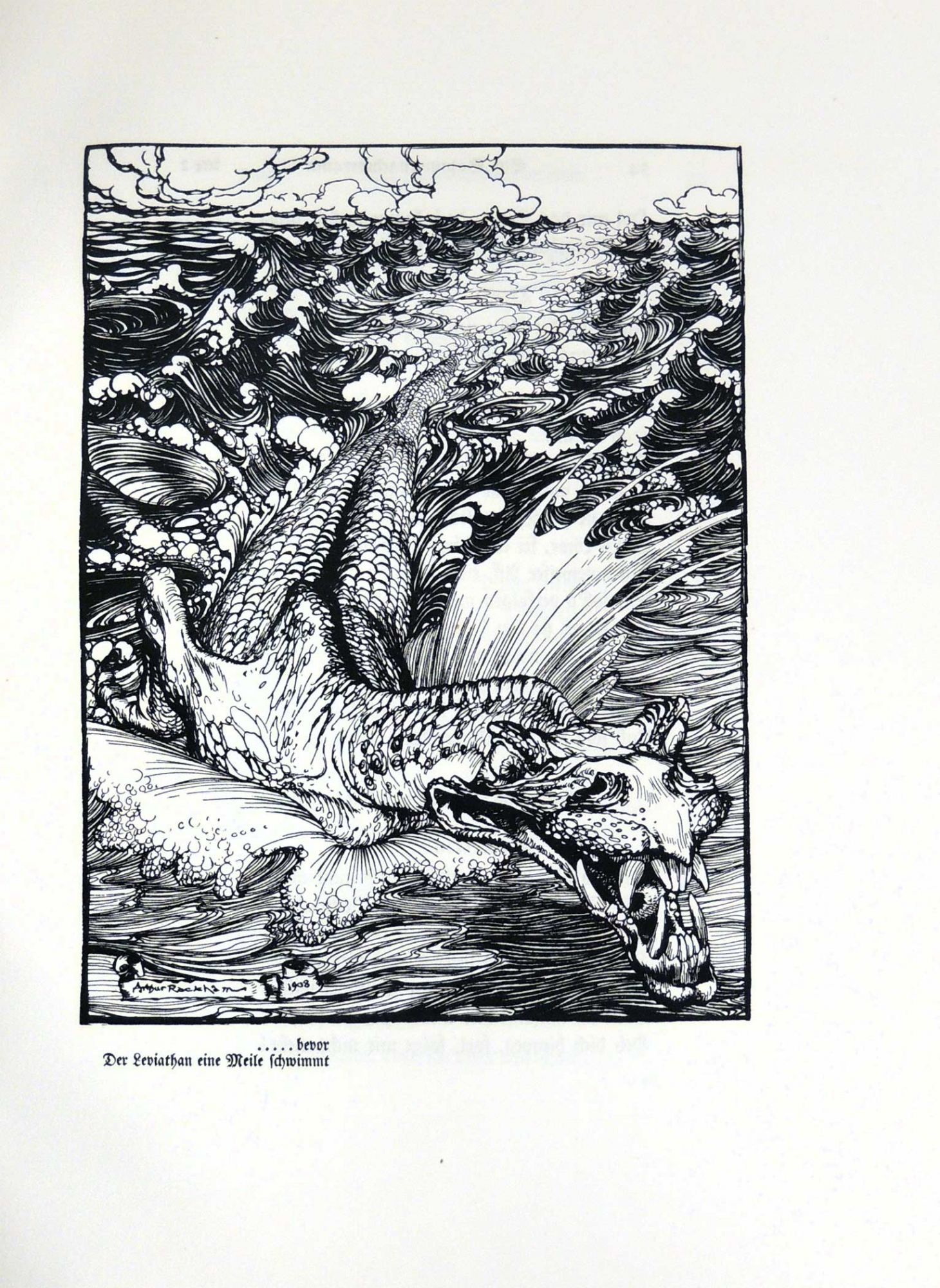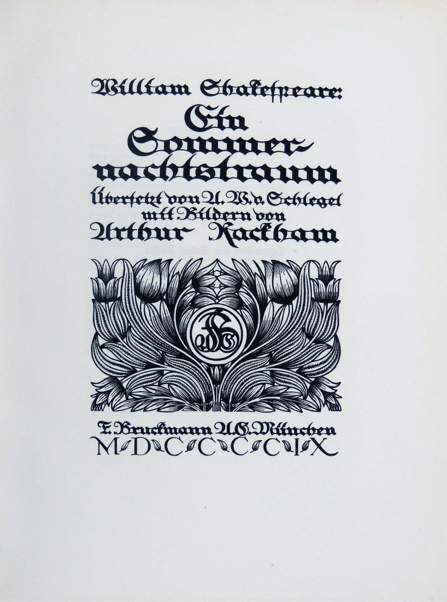Munich: F. Bruchmann, 1909. Hardcover. Very Good. Hardcover. First German Edition. Number 24 of 1001 copies. Includes 40 full color illustrations by Arthur Rackham, each mounted on brown cardstock with captioned tissue guards. Also includes numerous black and white illustrations, some full page and some within the text. Bound in the original vellum boards with gilt title and floral decoration to spine and small emblem of Shakespeare to front cover. The spine design is by Ottomar Starke. Rubbing and light soiling to covers, edges of boards, and spine, as is common. There is a three inch split to the vellum along the bottom of the front hinge; however, the split only affects the top layer and the board remains firmly attached. Light dampstain to top edges of both covers, which also affects the top edges (top margins only) of multiple interior pages. Lacks ribbon ties. Text in German. A few pages have small spots of soiling or finger smudge marks and a few have chips to the edges, but the book remains very clean and bright overall. A beautiful book despite the noted condition issues. 132 pages plus plates. LIT/081717.