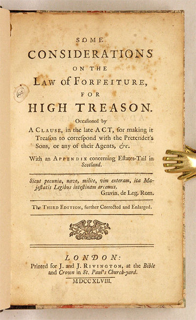 1778. Forfeiture for High Treason [Yorke, Charles (1722-1770)]. Some Considerations on the Law of Forfeiture, For High Treason. Occasioned by a Clause, In the Late Act, For Making it Treason to Correspond with the Pretender's Sons, Or Any of Their Agents, &c. With an Appendix Concerning Estates-Tail in Scotland. Further Corrected and Enlarged. London: Printed for J. And J. Rivington, At the Bible and Crown in St. Paul's Church-Yard, 1778. viii, [6], 190 pp. Octavo (7-3/4" x 4-3/4"). Recent period-style quarter calf over marbled boards, lettering piece, raised bands and gilt ornaments to spine, endpapers renewed. Moderate toning, occasional light foxing. "48" in tiny hand to title page, some leaves have notes in pencil to margins. An attractive copy. $250. * Third edition. First published in 1745, Yorke's essay argues that corruption of blood and forfeiture are justifiable consequences of treason. This work was a response to the cases of treason that followed the Jacobite Rebellion of 1745 and a defense of treason legislation introduced by Yorke's father, the Earl of Hardwicke, who was then lord chancellor. Going beyond the common law, Yorke draws on examples from Athenian, Roman, Jewish and feudal sources. The final edition of this book, designated the fourth, was published in 1795. All editions are scarce. No copies of this edition located on OCLC. The ESTC locates 2 copies, both in North America (Harvard University, Harvard Law School). English Short-Title Catalogue T16276.