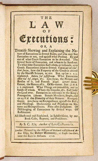 1706. Scarce Eighteenth-Century Treatise on Executions C[arter], S[amuel]. The Law of Executions: Or, A Treatise Shewing and Explaining the Nature of Executions in Several Rules, And Who May Sue Execution or Not, And Against What Persons. By and Out of what Court Execution to be Awarded. The Several Sorts of Execution, And When to be Sued Out. To What Time Execution Shall Relate, As to Lands, As to Goods. Executions Joint or Several. Capias ad Satisfac.' Fiori Facias, How the Property of the Goods is Altered by the Sheriffs Seizure, Or Not. Stat. 29 Car. 2 c. 3. Explained. Habere fac' Possessionem. What Execution After Ca' Sa', Elegit, &c. Scire-Facias, the Nature and Reason of It, And Process. Elegit. Levari Facias. Extent, The Nature of It. Of Re-Extent. Stat. 32 H.8. C. 5. Explained. What Things are Extendible, And in Hands of Whom. Where the Conusee, &c. Shall Hold the Land Over. Execution in Reference to the King's Prerogative. Liberate. Statute Merchant, Staple, And on 23 H. 6. The Diversity of Their Natures. Recognisances. Scire Facias on Recognisance Against the Bail; And Pleadings. Declarations and Pleadings on Statutes and Recognisances. Pleas after Judgment. Of Discharging of Executions by Several Ways. Of Restitution. All Illustrated and Explained, In Subdivisions, By Our Book Cases, Reports, And Presidents. By S. C. Esq; Author of Lex Custumaria. London: Printed by the Assigns of Richard and Edward Atkins, 1706. [xvi], 323, [21] pp. Includes two-page publisher catalogue. Octavo (7" x 4-1/4"). Contemporary calf, blind rules to boards, blind fillets along joints, raised bands and recent lettering piece to spine, gilt tooling to board edges. A few minor nicks and scuffs to board, corners bumped and lightly worn, light rubbing to extremities, small chips to head and lower section of spine, later repair to upper two inches of joint, hinges cracked. Some toning to text, light foxing to a few leaves, early owner signature to front free endpaper. $750. * Only edition. Carter was the author of two notable treatises: The Infants Lawyer (1697), the first English treatise on laws concerning infants, and Lex Custumaria, Or, A Treatise of Copy-Hold Estates (1696). As indicated by the title, The Law of Executions addresses the various ways (non-criminal) judicial decisions are carried out. OCLC locates 9 copies in.