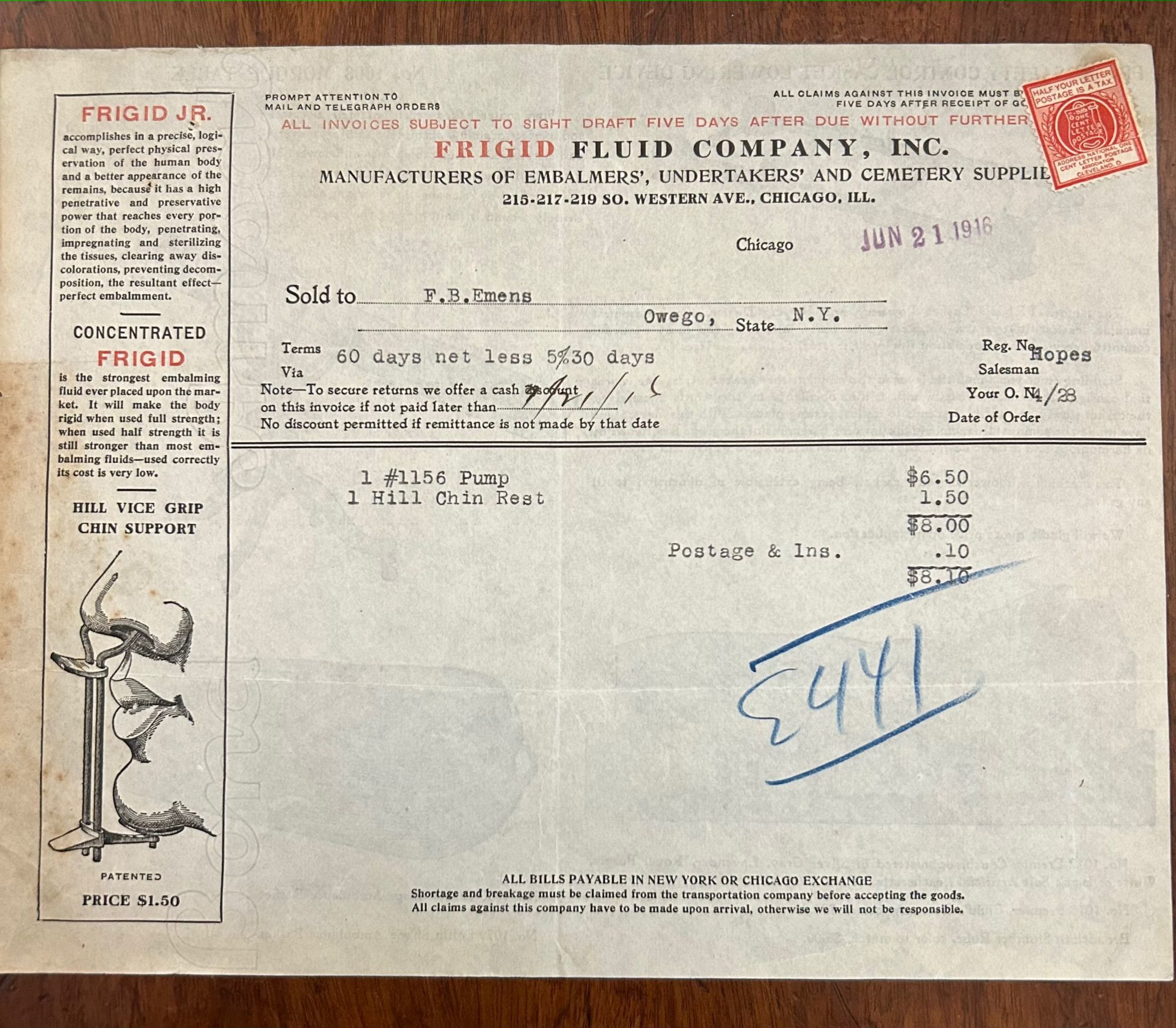 Chicago, IL, 1916. Unique. Very Good+. Unique. Frigid Fluid Company is a manufacturer of embalmers', undertakers' and cemetery supplies since 1892. The invoice includes ads and images for casket lowering devices, morgue table, viewing couch, ambulance baskets, and more notably, the Hill vice grip chin support for embalming processes. Death ephemera. Single double-sided invoice and advertisement, unmarred and in original condition. Illustrated and annotated. Scarce and unique.