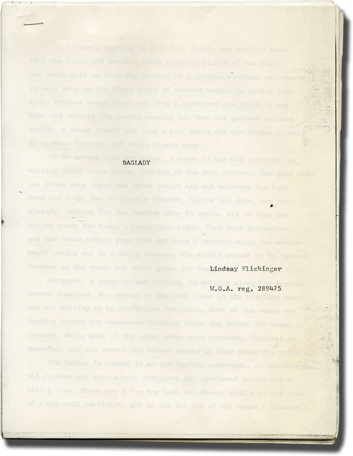 Title page present, with credits for screenwriter Lindsay Flickinger. 19 leaves, with last leaf of text numbered 18. Xerographically duplicated. Pages Near Fine, lacking wrapper bound with a staple.