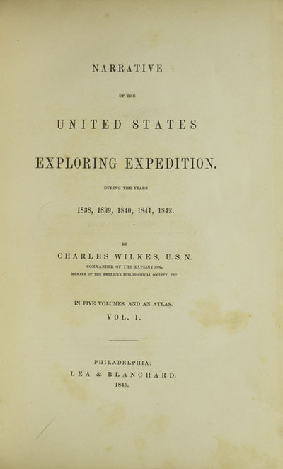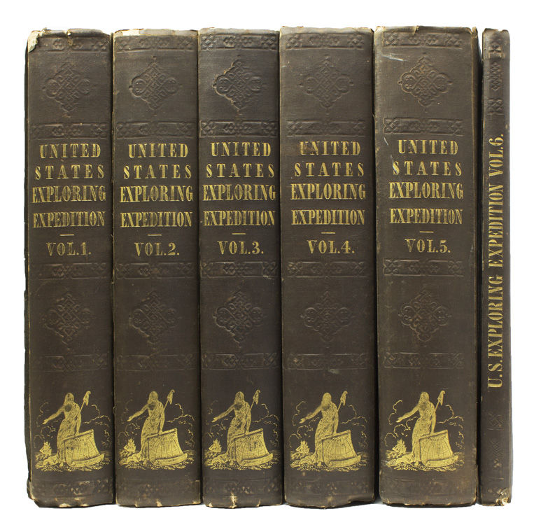 Philadelphia: Lea and Blanchard, 1845. First trade edition, limited to 1000 copies. 63 (of 64) engraved plates (engraved portrait of Wilkes from later edition laid-in to vol. I, not original to this issue) and 47 steel-engraved vignettes, 14 engraved maps (1 hand-colored), numerous woodcuts. 6 vols. 8vo. Publisher's brown embossed cloth with gilt-stamped vignettes to covers. Spine ends and tips frayed, cloth torn at rear joint of vol. I, plates foxed, 1 plate in vol. I loose, open tear to Oregon Territory map. First trade edition, limited to 1000 copies. 63 (of 64) engraved plates (engraved portrait of Wilkes from later edition laid-in to vol. I, not original to this issue) and 47 steel-engraved vignettes, 14 engraved maps (1 hand-colored), numerous woodcuts. 6 vols. 8vo. A landmark of 19th-century exploration: the voyages led by Wilkes were the most ambitious scientific undertaking to that date and encompassed the Antarctic, the Pacific islands, and the American northwest coast. Extensive exploration of the Antarctic proved impossible due to the state of the ships. Wilkes sailed southwards in 1839 without scientific staff. Despite charting a series of land-falls and appearances of land in the Antarctic, what Wilkes actually saw remains open to conjecture. The scientific work of the expedition was extremely successful. The Smithsonian Institute was founded to house and study the expedition's collections, and the Naval Observatory established to continue the scientific work. Howes W414; Streeter Sale 3324; Tweney 89, 83; Hill 1867; Sabin 103994; Taxonomic Literature 17646; Haskell 2b; Rosove 353.B1; Ferguson 4209; Forbes 1574