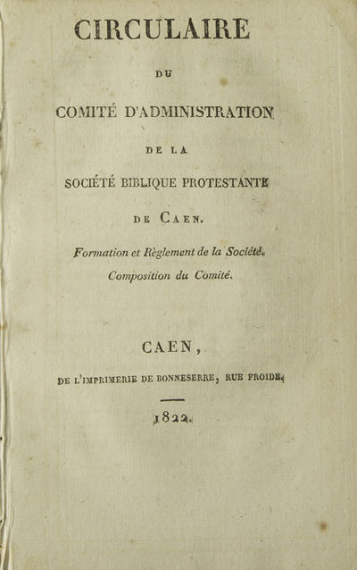 Caen: de l’Imprimerie de Bonneserre, Rue Froide, 1822. 24 pp. 1 vols. 8vo. Disbound. 24 pp. 1 vols. 8vo. Foundation document of the Sociéte Biblique Protestante de Caen, an auxiliary of the national Society in Paris, with constitution (17 articles), members of the administrative committee, and a priced catalogue of Bibles and New Testaments available.