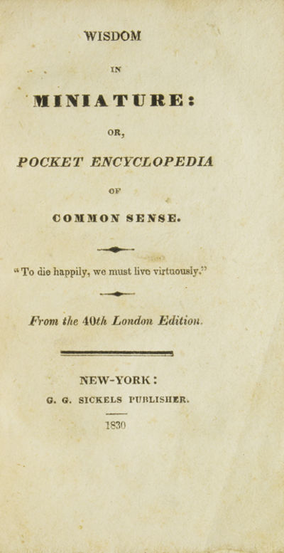 New York: G.G. Sickels Publsiher, 1830. From the 40th London edition. Hand-coloured frontis. (tipped back in facing the front pastedown) 106 pp. Original blue paper over boards with "Wisdom in Miniature" on upper cover. From the 40th London edition. Hand-coloured frontis. (tipped back in facing the front pastedown) 106 pp. Not an uncommon title, but unknown with this imprint.