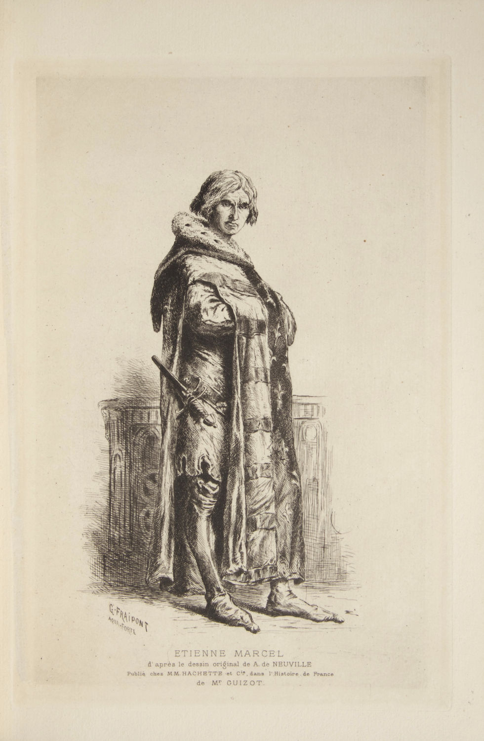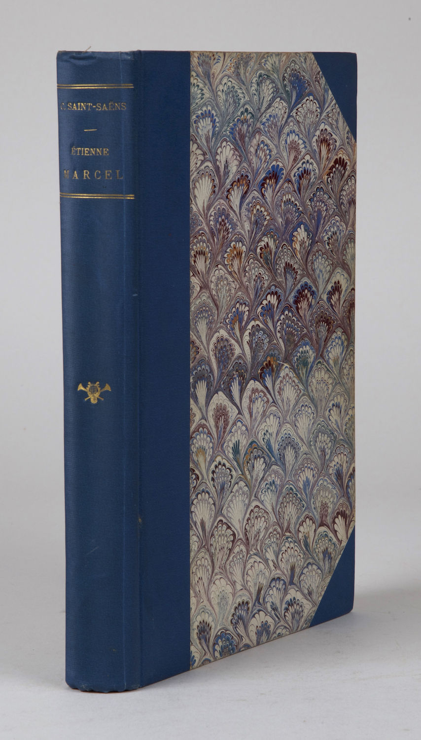 Paris: Durand Schoenewerk [PN D.S. & Cie. 2551], 1879. Large octavo. Half mid-blue cloth with marbled boards, speckled edges, marbled endpapers. 1f. (dedication), 1f. (decorative title printed in red and blue), 1f. (engraved frontispiece portrait of Etienne Marcel by G. Fraipont after A. de Neuville), 1f. (named cast list), 1f. (table of contents), 365, [i] (blank) pp.