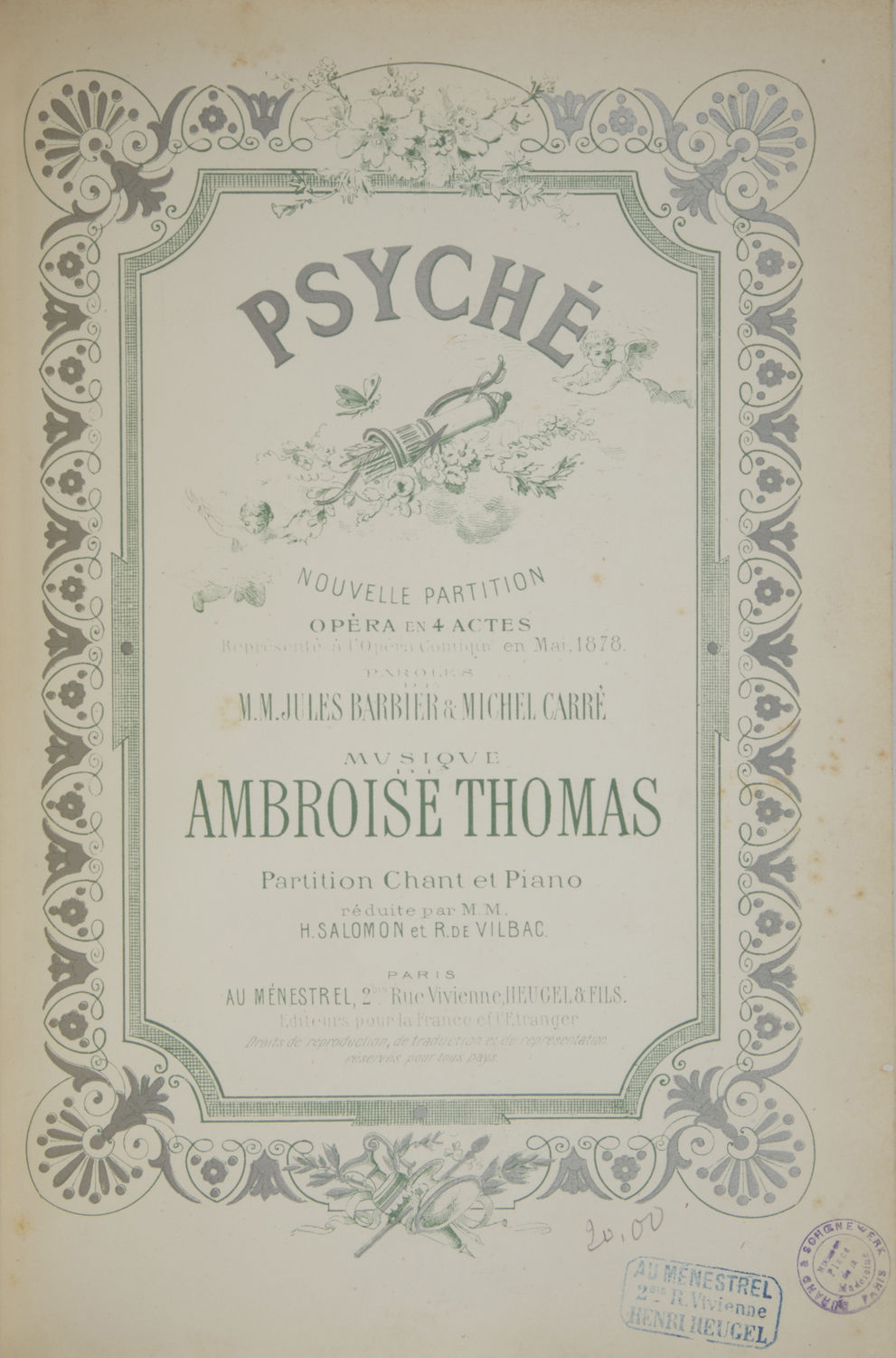 Psyché Nouvelle Partition Opéra en 4 Actes Représenté à l'Opéra Comique en Mai, 1878. Paroles de M.M. Jules Barbier & Michel Carré ... Partition Chant et Piano réduite par M.M. H. Salomon et R. de Vilbac. [Piano-vocal score]