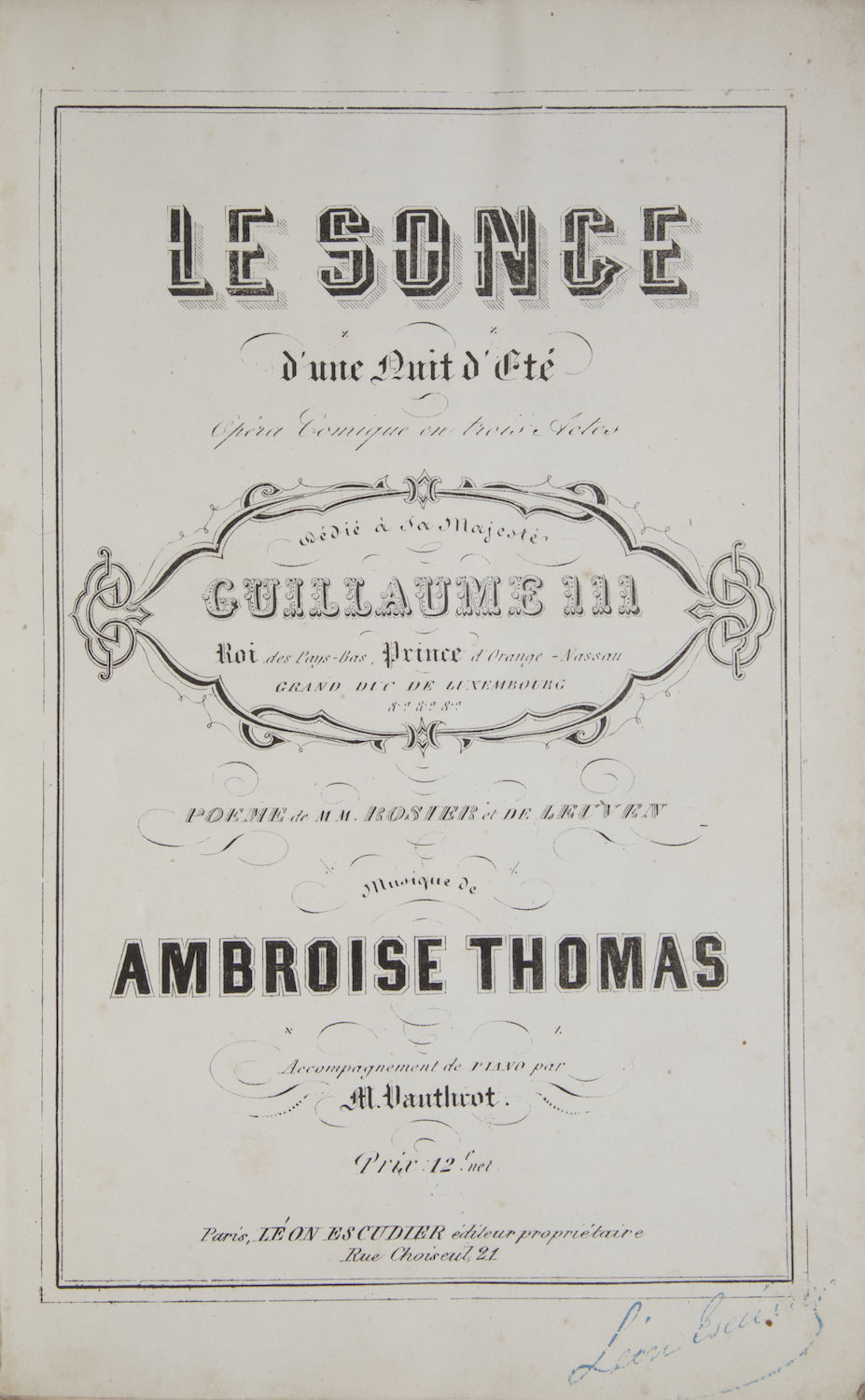 Le Songe d'une Nuit d'Eté Opéra Comique en trois Actes dédié à sa Majesté Guillaume III Roi des Pays-Bas, Prince d'Orange-Nassau Grand Duc de Luxembourg ... Poeme de MM. Rosier et de Leuven... Accompagnement de Piano par M. Vauthrot. Prix: 12f. net. [Piano-vocal score]
