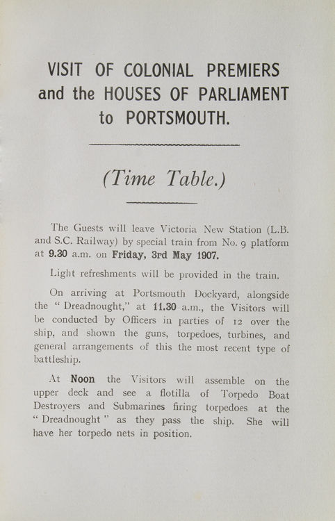 [London]: (Not for Publication), 1907. Illus. with 8 mounted photos and a folding plan. 17 pp. 8vo. Bound in full blue morocco, with gilt rule, with the Royal arms and lettering "Visit to Portsmouth, May, 1907" on upper cover, a.g.e., withwatered silked endpapers. About fine. Illus. with 8 mounted photos and a folding plan. 17 pp. 8vo. Visit of Colonial Premiers and The Houses of Parliament To Portsmouth, in May 1907 starting at Victoria Station to Portsmouth docks, primarily to see the "Dreadnought" under construction. The mounted photographs depict the "Dreadnought", and various submarines.