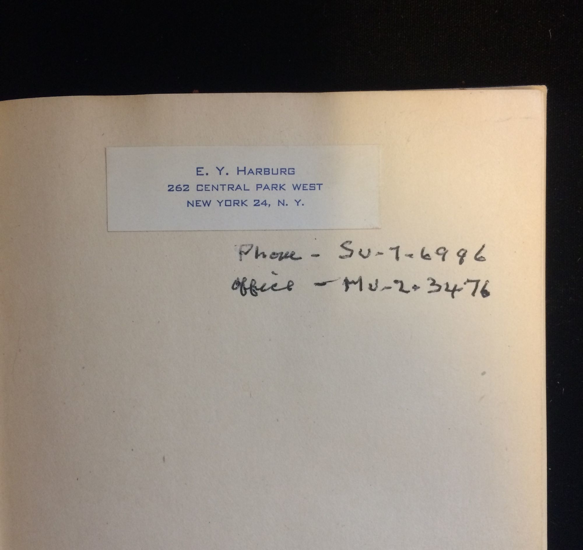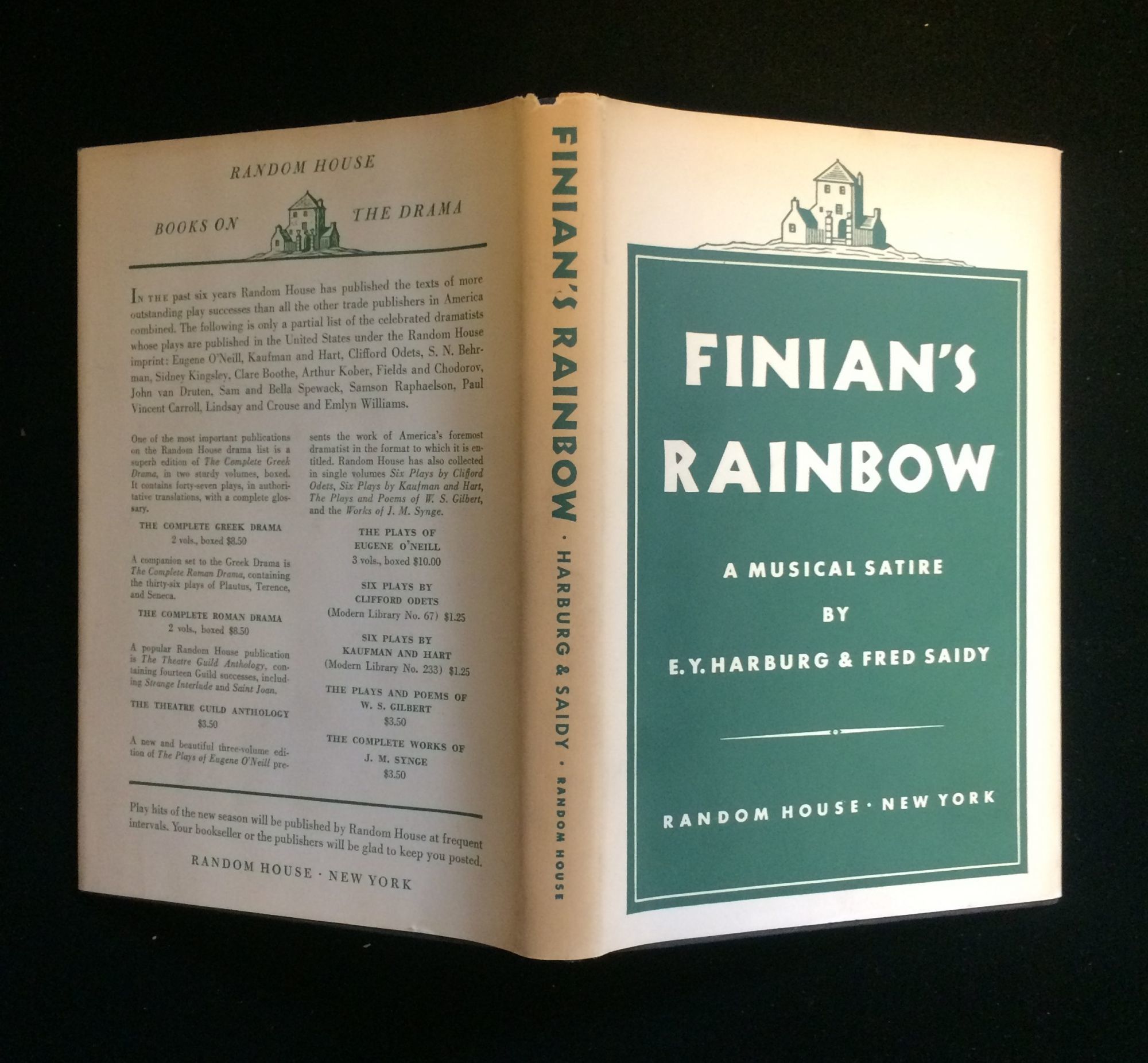 NY: Random House, 1947. 1st Edition. Hardcover. Near Fine/Good. Playwright and lyricist E. Y. Harburg's personal ownership copy of one of the most beloved American musicals of mid-20thC for which he co-wrote the book, along with Fred Saidy, and alone the lyrics for the songs, music by Burton Lane. With Harburg's address sticker on the ffe - "E. Y. Harburg/ 262 Central Park West/ New York 24, N. Y." and beneath it in black ink his phone numbers: "Phone SU-7-6986/ office - MU -2-3476" Most famously, Harburg wrote the lyrics to Over The Rainbow, music by Harold Arlen for which they received the Oscar for Best Song. Book near fine, dustjacket very nice, just slightly toned at spine with a tiny chip spine head.