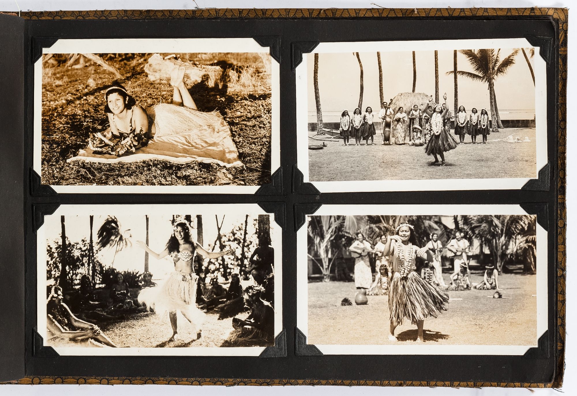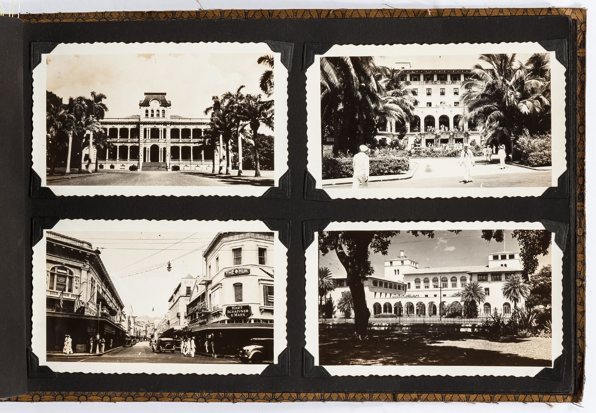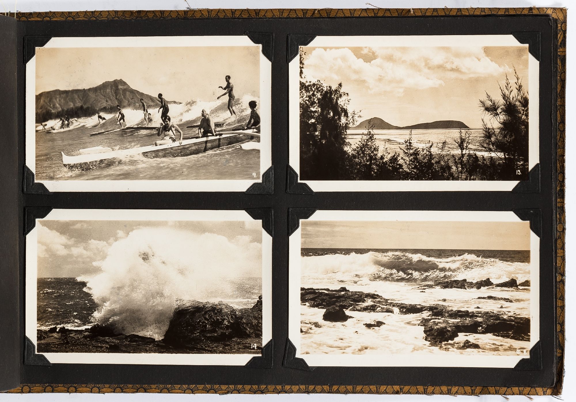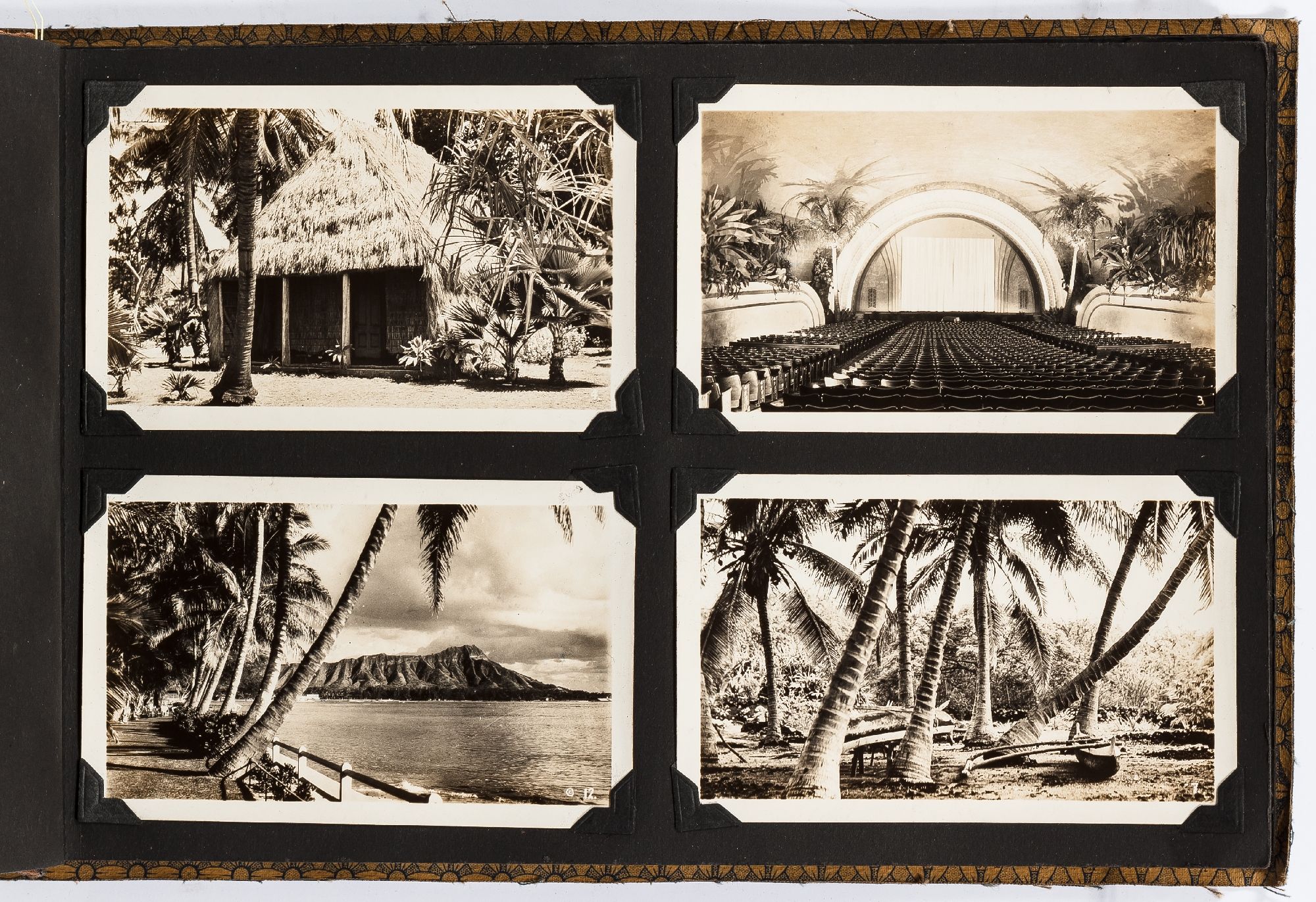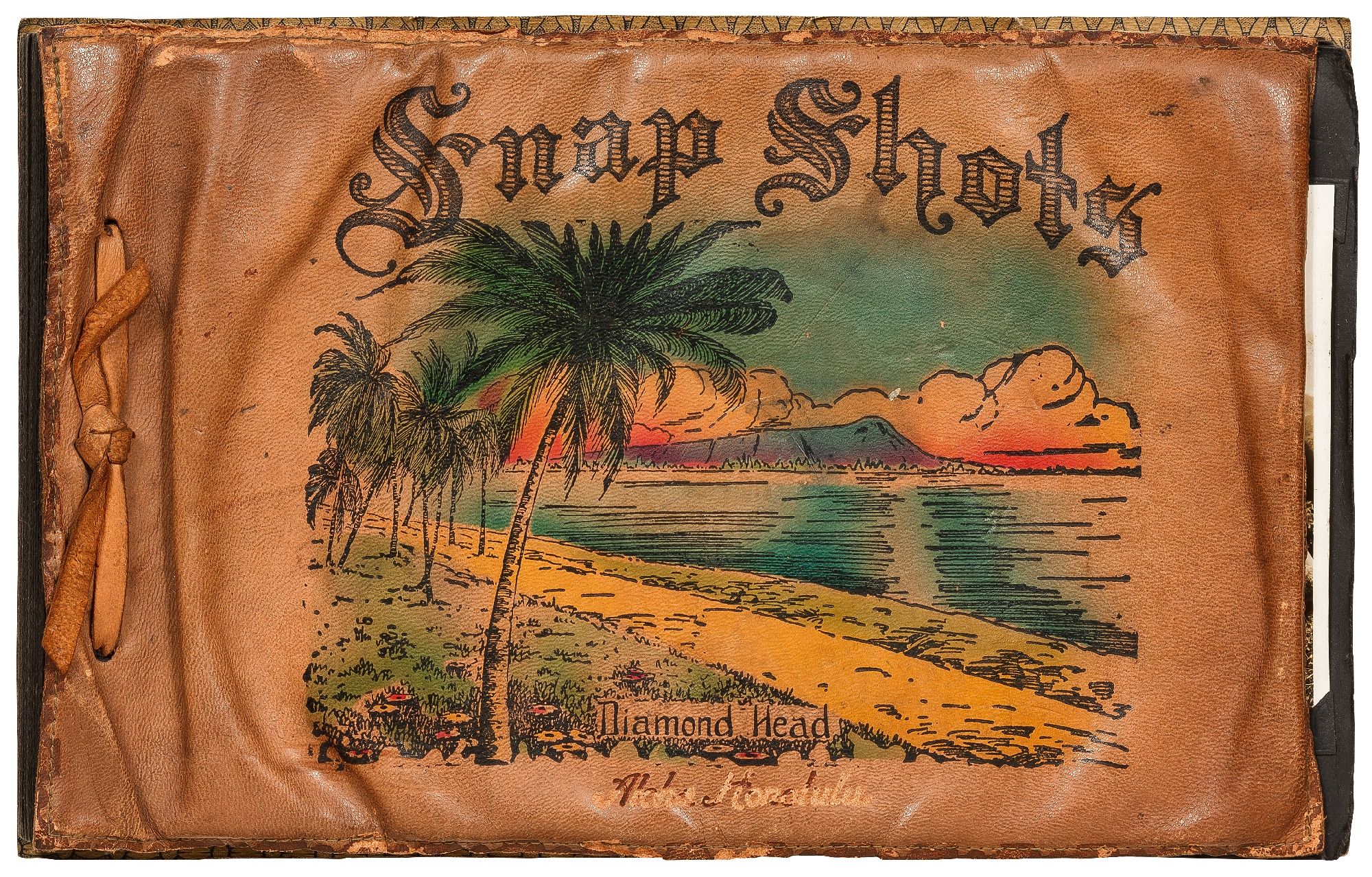 Hawaii, 1940. Softcover. Very Good. Oblong small quarto measuring 11" x 7". String-tied brown leather over stiff paper boards with "Snap Shots Diamond Head Aloha Honolulu" and a beach illustration on the front board. Contains 49 sepia-toned or black and white gelatin silver photographs measuring between 2.75" x 4.5" and 5" x 7" without captions. Very good album with waviness and edgewear with fine photographs.