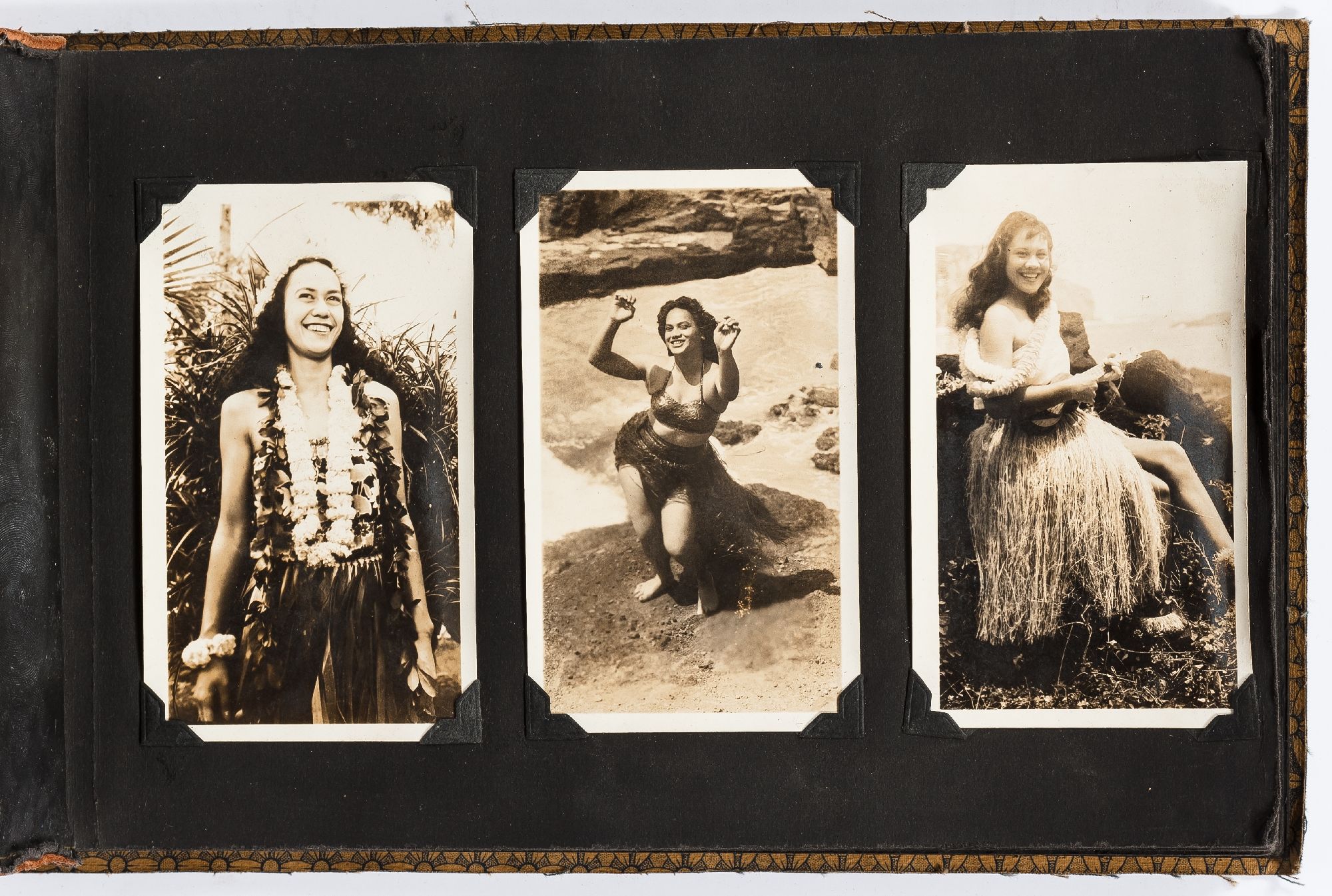 A photo album compiled by an amateur photographer who appears to have been stationed in Hawaii and California during World War II. The album is a mix of commercial photography and the compiler's beginning with images of young Hawaiian women in traditional dress posed in pin-up style poses some with ukuleles and others with leis and grass skirts. These are followed by action shots of Hawaiian women dancing and luaus. Other images show palm trees, sunsets, surfers, beach scenes, and other quintessential Hawaii imagery. A later photo shows a Pan American Airlines plane docked with a formation of aircraft flying overhead, another photo shows men in Navy uniforms walking on a street. Also featured are local fisherman working and people picking bananas. One photo towards the end shows a topless Hawaiian woman in a grass skirt and lei.