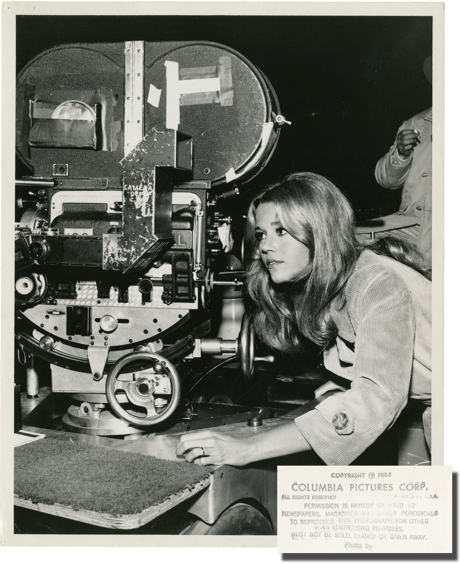 Culver City, CA: Columbia Pictures, 1966. Vintage photograph on Jane Fonda taking a peek through a camera during shooting on the set of the 1966 film. With a Columbia Pictures stamp on the verso.
