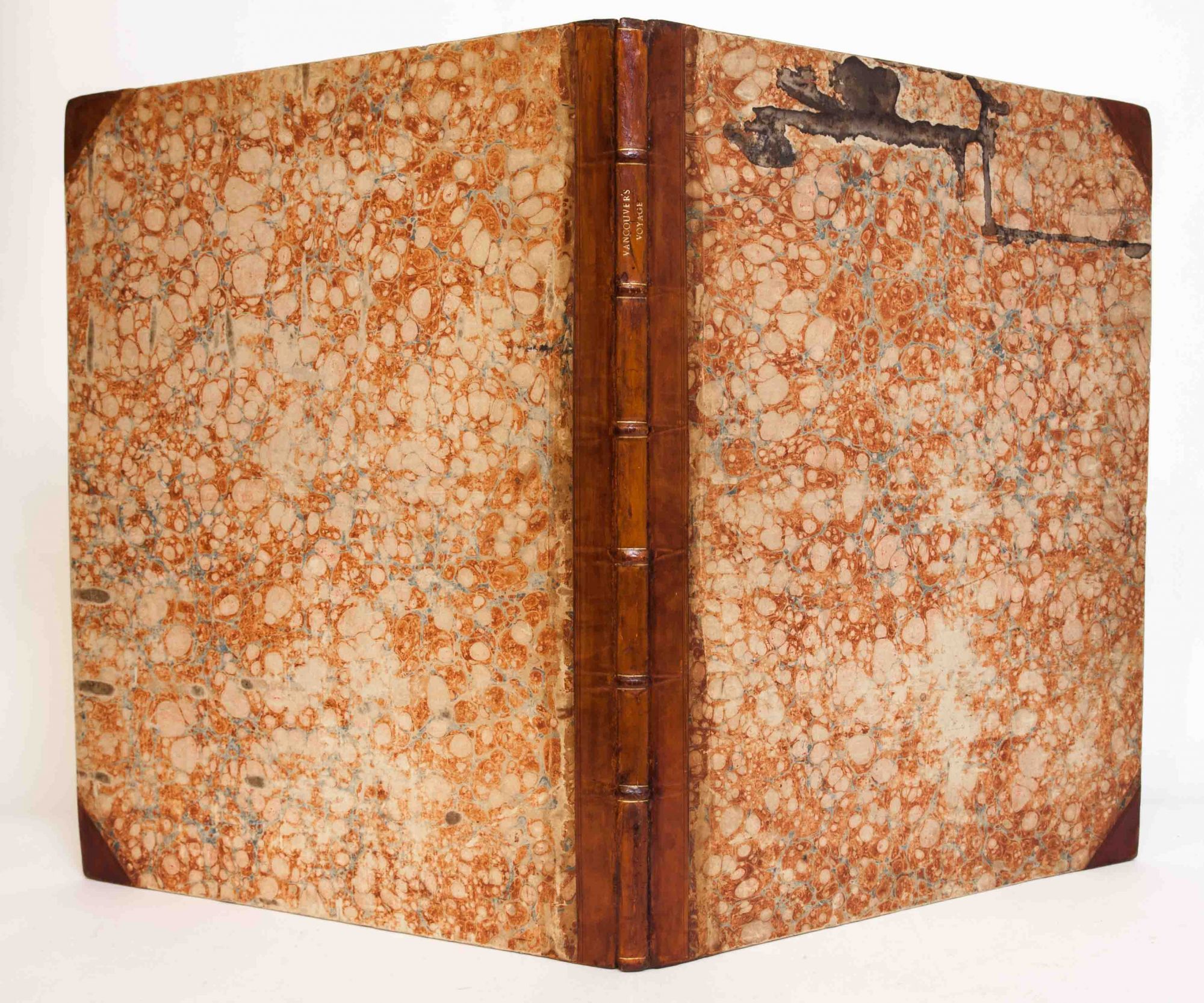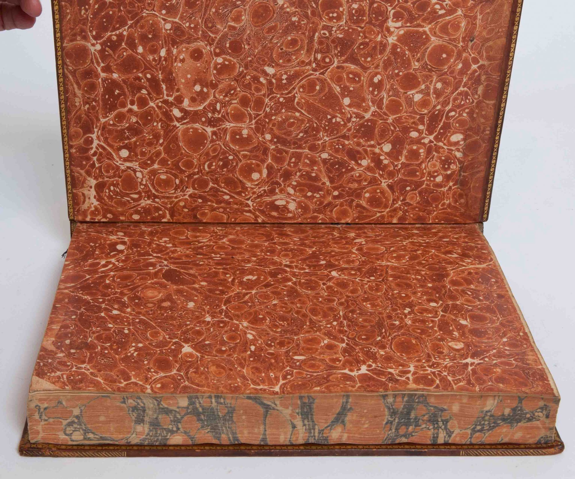 Text volumes bound in contemporary brown polished calf with double gilt borders. Spines stamped in blind and lettered in gilt. Gilt board edges and dentelles. Marbled endpapers. All edges marbled. Blue silk place markers. Atlas bound to match in contemporary half calf over marbled boards. Outer hinges as well as heads and tails of spines of text volumes professionally repaired. Some light flaking to calf at outer hinges. Plates with some light foxing and toning. Small marginal repair to leaf Pp of volume III and small corner torn to one plate of volume III, no loss of text or engraving. Atlas with some ink staining to top edge of front board. Some foxing and toning to plates of atlas, mainly to the edges. Overall, an excellent set; tall, clean and complete.
