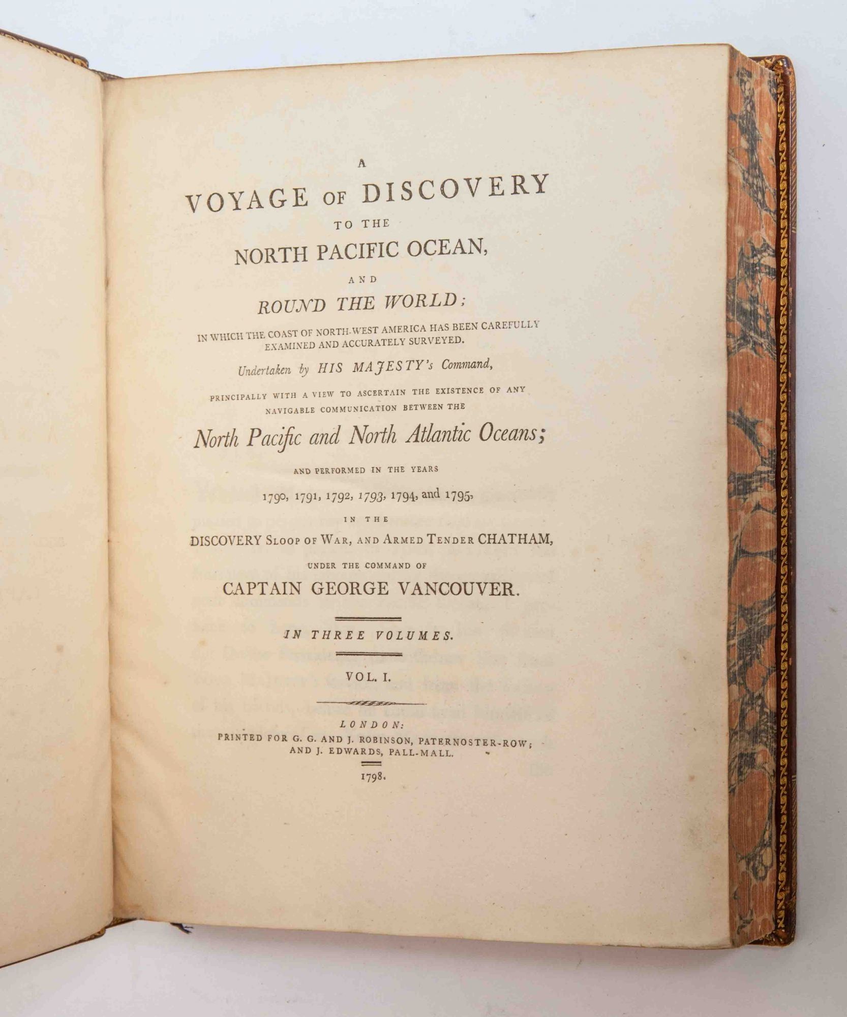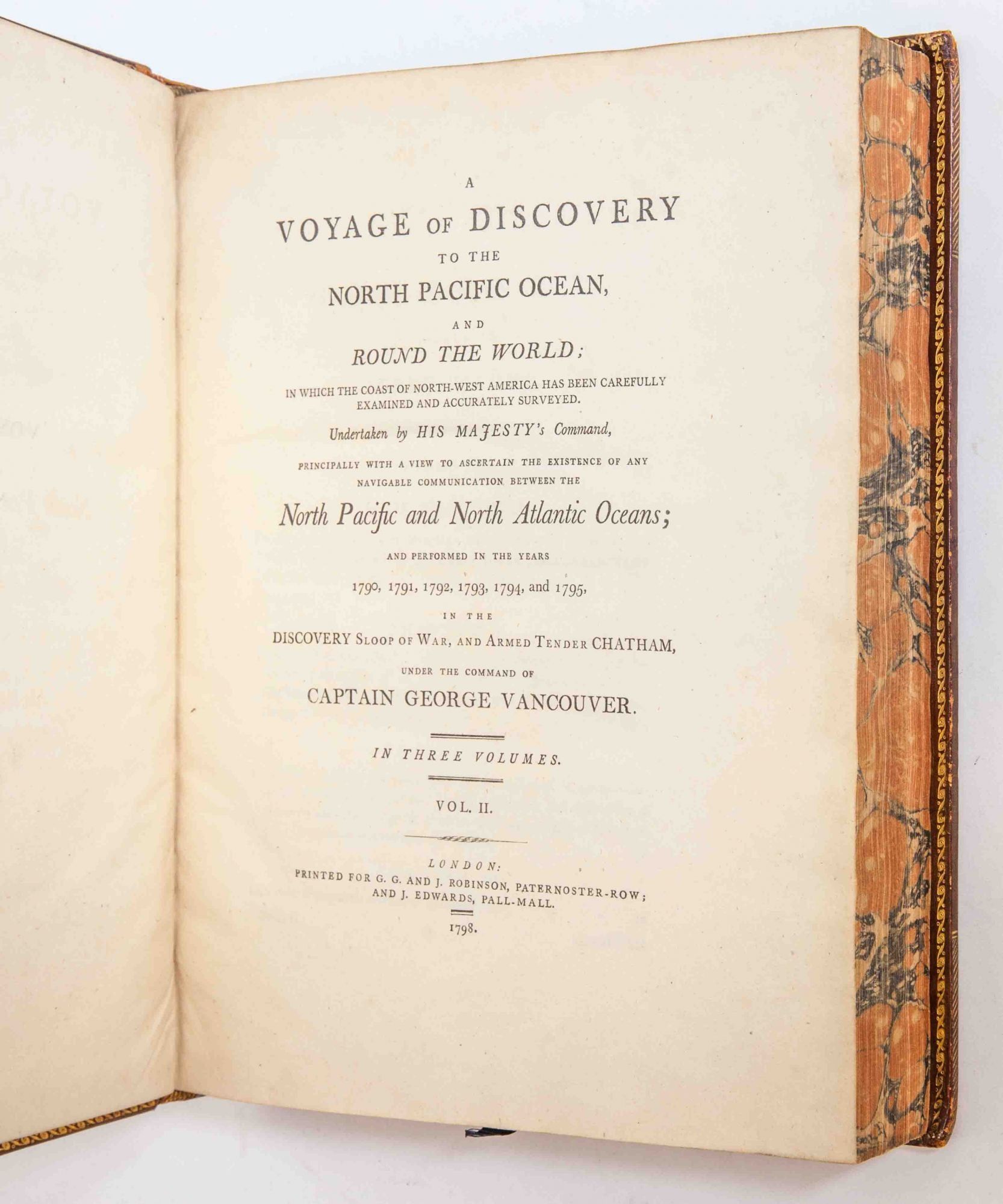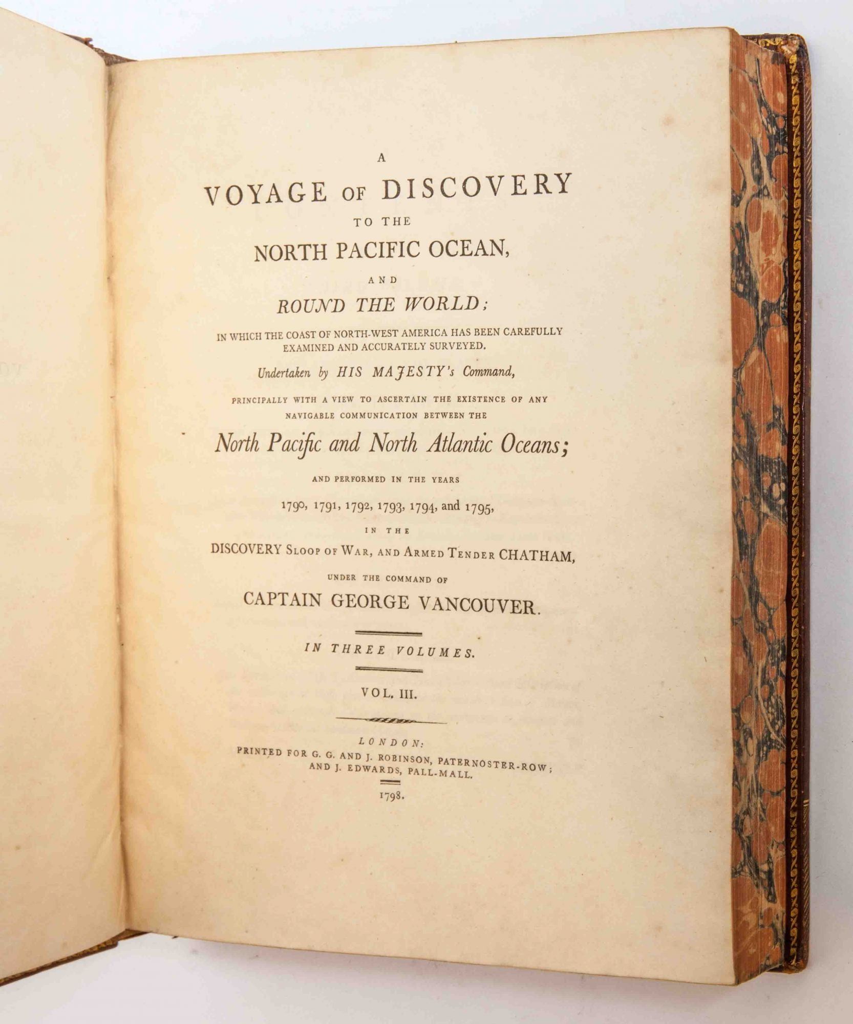 "Vancouver, who had served on Cook's third voyage, was made commander of an expedition whose express purpose was to reclaim wherever possible British rights to the Northwest Coast of America. Vancouver sailed to the Pacific via Australia, where he discovered and charted King George Sound and Cape Hood, passed Van Deiman's Land, and visited New Zealand, Hawaii and the Northwest Coast. During the course of three seasons, he surveyed Alaska and the Northwest Coast, investigated the Strait of Juan de Fuca, discovered the strait of Georgia, and circumnavigated Vancouver Island. He visited San Francisco, Monterey, and other Spanish settlements in Alta California” (Graff).
