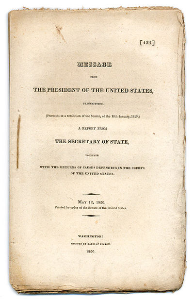 1820. Washington: Gales & Seaton, 1820.. Washington: Gales & Seaton, 1820. Cases on the Federal Dockets in 1819 [Adams, John Quincy (1767-1848)]. Message from the President of the United States, Transmitting, (Pursuant to a Resolution of the Senate, Of the 18th January, 1819,) A Report from the Secretary of State, Together with the Returns of Causes Depending in the Courts of the United States. May 12, 1820. Printed by order of the Senate of the United States. Washington, DC: Printed by Gales & Seaton, 1820. 88 pp. Octavo (9-1/2" x 6"). Stab-stitched pamphlet in self-wrappers. Light browning, light soiling to exterior. $150. * This report includes tables of all cases pending in the Federal district and circuit courts as of 1 October 1819, "together with a statement of the fees and emoluments of the marshals, district attorneys, clerks, and other officers, of the district and circuit courts, for the last two years, and the tables or rules by which such fees have been taxed" (5). Signed in type by President Adams.