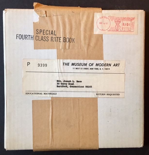 New York: The Museum of Modern Art, 1967. Original wraps. Near Fine/Near Fine. Bruno Munari. Another brilliant Bruno Munari design in book form, in this case a clever, wordless artist's book issued in 1967 by MoMA New York. "This is a unique book designed by Bruno Munari especialy for the Museum of Modern Art. It is one of a group of books in which a visual discourse, rather than a text composed of words, carries the thread of the story" (from the rear dustjacket flap). A very sharp copy to boot: Tight and Near Fine to Fine in its stapled, dark wrappers. And in a crisp, Near Fine laminate dustjacket, with just a touch of very light creasing along the front panel's top-edge. Square octavo, the explanatory text on the rear dustjacket flap in both English and Italian. #102 of an unspecified (but undoubtedly very small) number printed. Also includes a sturdy, very sharp example of MoMA's labeled, original shipping carton, which has protected the book well and undoubtedly accounts for its superb condition.