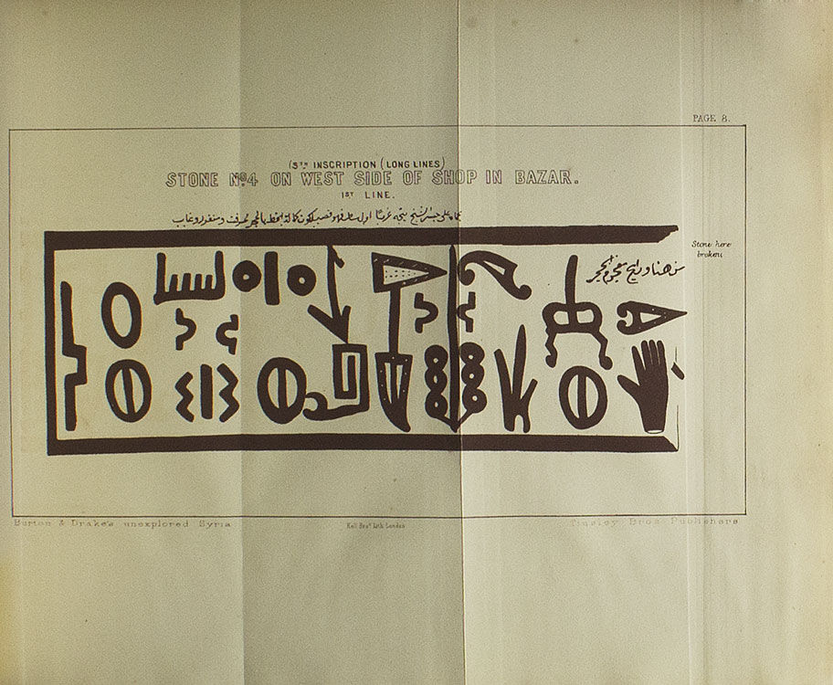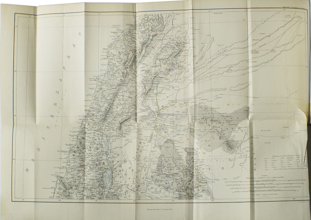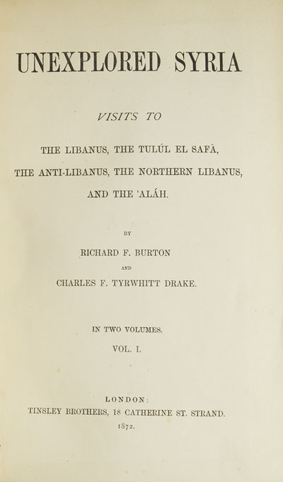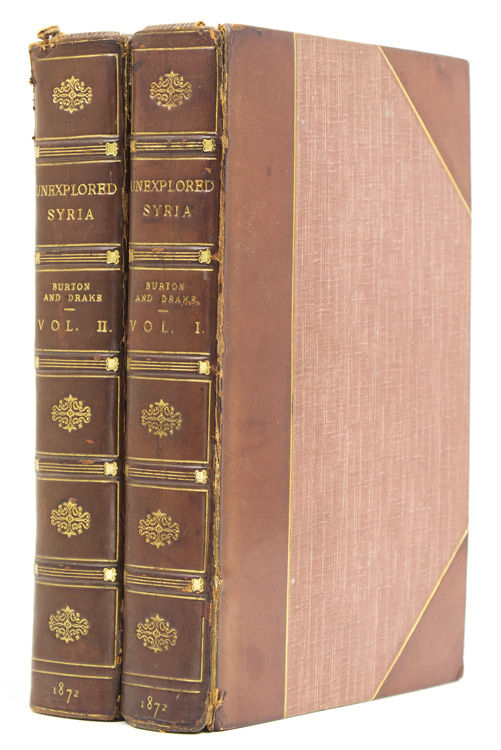 London: Tinsley Brothers, 1872. First edition. Lithographic frontispiece to each vol., folding map, 25 other lithographic plates (11 of which are) folding. 2 vols. 8vo. Contemporary half brown morocco and cloth sides, t.e.g. Front joint of vol. I tender, headcap and joints of vol. II rubbed; short tape repair to verso of one fold of map, still a very good set. First edition. Lithographic frontispiece to each vol., folding map, 25 other lithographic plates (11 of which are) folding. 2 vols. 8vo. Account of the lands and tribes of Syria, written by Burton and Drake while Burton was British consul in Damascus. Drake had walked from the Sinai through desert Palestine with Edward Palmer on the first surveying expedition of the Palestine Exploration Fund. Burton was dismissed from his post because of opposition to him from the Ottoman governor of Syria and high level intrigue in the British consular service. Penzer pp. 85-88; Blackmer 247; Casada 68