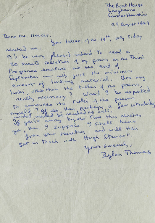 The Boat House, Laugharne, Carmarthenshire, [Wales], 1949. 1 p., docketed with date "31 Aug 1949" as receipt on verso by BBC. 8vo. Old folds. 1 p., docketed with date "31 Aug 1949" as receipt on verso by BBC. 8vo. Thomas accepts an invitation to appear on BBC Radio. In part: "… I'll be very pleased indeed to read a 20 minute selection of my poems on the Third Programme sometime at the end of September — with just the minimum amount of linking material. Are any links, other than the titles of the poems, really necessary? Would I be expected to announce the titles of the poems myself? If so, then perhaps a few introductory words would be needed as well …."