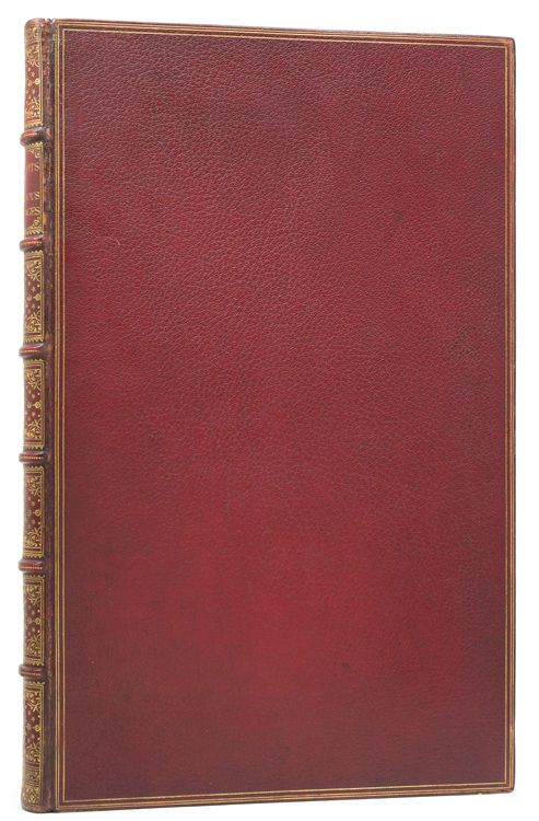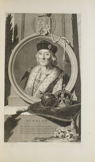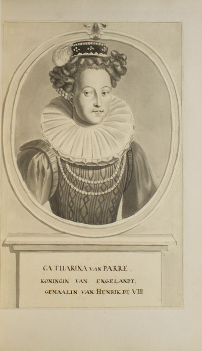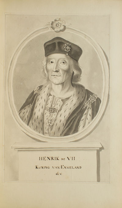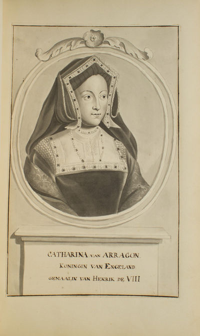 np, 1700. With 23 monochrome watercolor portraits attributed to Adrian van der Werff; each followed by an engraved portrait of the subject by Peter van Gunst, et al. Watercolor portraits approx. 12 1/4 x 7 7/8 inches (310 x 200 mm) on sheets measuring 15 1/2 x 9 7/8 inches (393 x 250mm). Portraits: Henry VII [England]; Henry VIII [England]; Catherine d'Arragon; Anne Boleyn; Jane Seymour; Catharine Parre, Edward VI [England]; Mary Stuart; Jane Grey; Queen Mary [Bloody Mary]; Thomas Crammer; William Laud; Charles V [Don Carlos I]; Charles I [Great Britain]; Henrietta Marie de France; James I [Great Britain]; Anne Hyde [Wife of James II]; George Villiers, Duke of Buckingham; Maurice Prince of Orange; James IV [King of Scotland]; Marguerite [Queen of James IV of Scotland]; Guillaume Premier Prince d'Orange; Hamilton Count of Aran. Watercolors & engravings clean & attractive. Folio. 19th-Century full gilt-paneled scarlet morocco, richly gilt floral spine compartments, a.e.g. by Bedford; joints rubbed, other occasional edge wear. Small crimson leather bookplate of John L. Dudley, Jr. With 23 monochrome watercolor portraits attributed to Adrian van der Werff; each followed by an engraved portrait of the subject by Peter van Gunst, et al. Watercolor portraits approx. 12 1/4 x 7 7/8 inches (310 x 200 mm) on sheets measuring 15 1/2 x 9 7/8 inches (393 x 250mm). Portraits: Henry VII [England]; Henry VIII [England]; Catherine d'Arragon; Anne Boleyn; Jane Seymour; Catharine Parre, Edward VI [England]; Mary Stuart; Jane Grey; Queen Mary [Bloody Mary]; Thomas Crammer; William Laud; Charles V [Don Carlos I]; Charles I [Great Britain]; Henrietta Marie de France; James I [Great Britain]; Anne Hyde [Wife of James II]; George Villiers, Duke of Buckingham; Maurice Prince of Orange; James IV [King of Scotland]; Marguerite [Queen of James IV of Scotland]; Guillaume Premier Prince d'Orange; Hamilton Count of Aran. Watercolors & engravings clean & attractive. Folio. The engravers represented are : Peter van Gunst (8); Cornelius Vermeulen (5); B. Audran (2); Charles Simonneau (3); Gerard Valck (5).