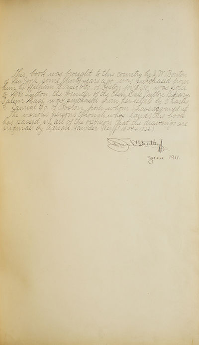 With a fascinating note "This book was brought to this country by J.W. Bouton of New York some thirty years ago was purchased from him by William H. Piper & Co. of Boston (Publishers) for $250; was sold to Mrs Sutton the founder of the Eben Dale Sutton Library (of the Peabody Institute) salem Mass; was purchased from the estate by Charles Lauriat Co. of Boston whom I have acquired it from.