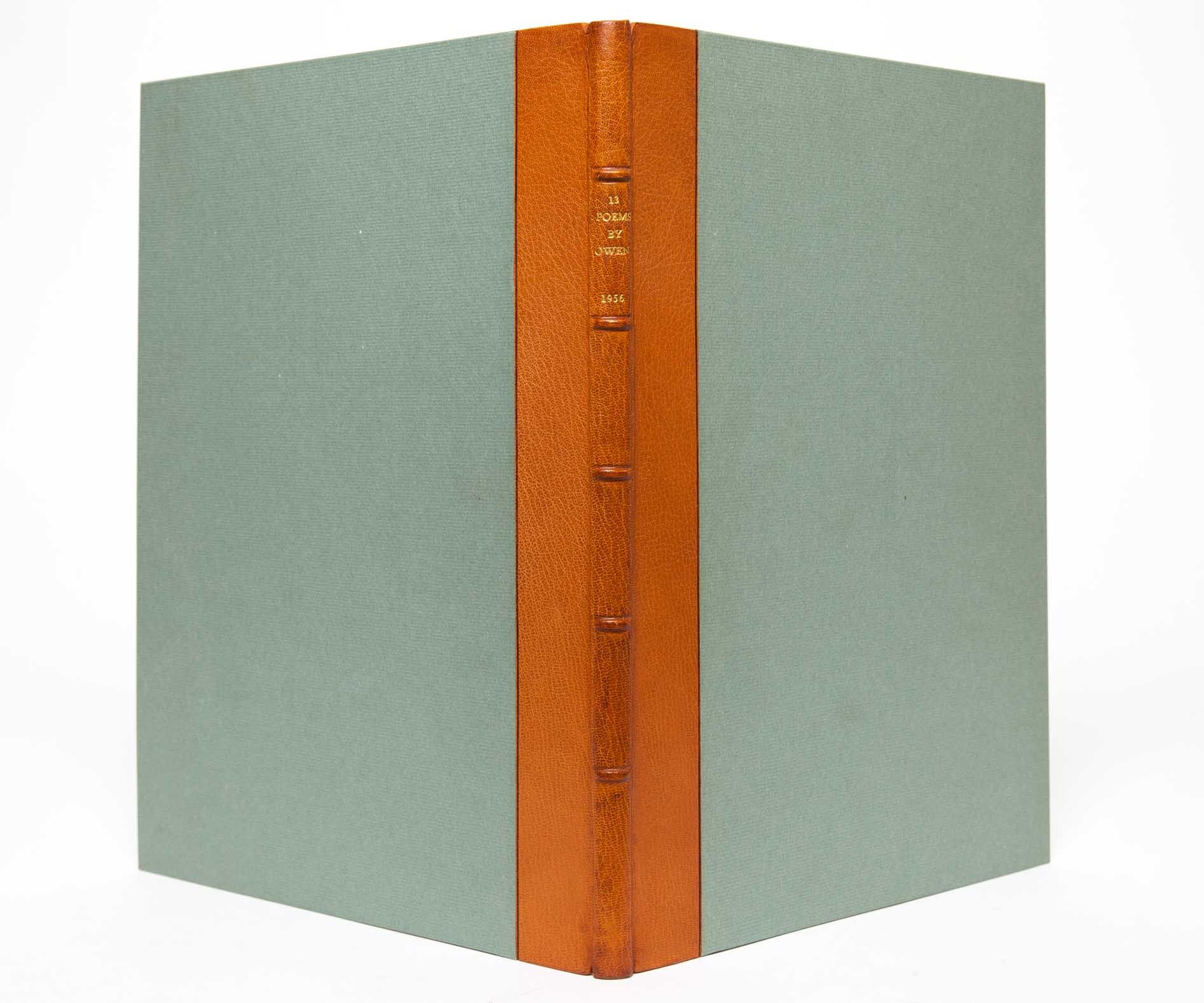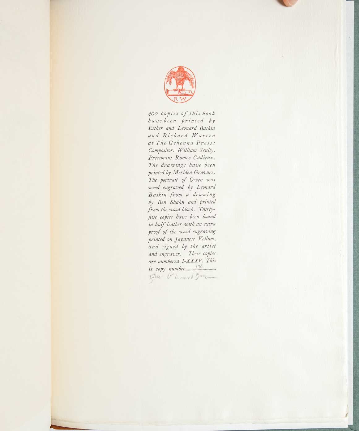 Wilfred Owen, a British soldier and poet, is best remembered for his verse about World War I. Killed in battle in 1918, most of Owen’s poetry was published posthumously. Owen, along with his mentor Siegfried Sassoon, departed from the wartime verse of earlier poets who celebrated the patriotic glories of conflict. Owen and Sassoon, instead, documented the terror, destruction, and horrors of modern warfare. This edition is published by the Gehenna Press, founded by Leonard Baskin in 1942. Thirteen Poems by Wilfred Owen marks the first collaboration between Baskin and Richard Warren of The Metcalf Printing and Publishing Company. Drawings by Ben Shahn complement this superbly produced edition. Fine in Very Good + dust jacket.