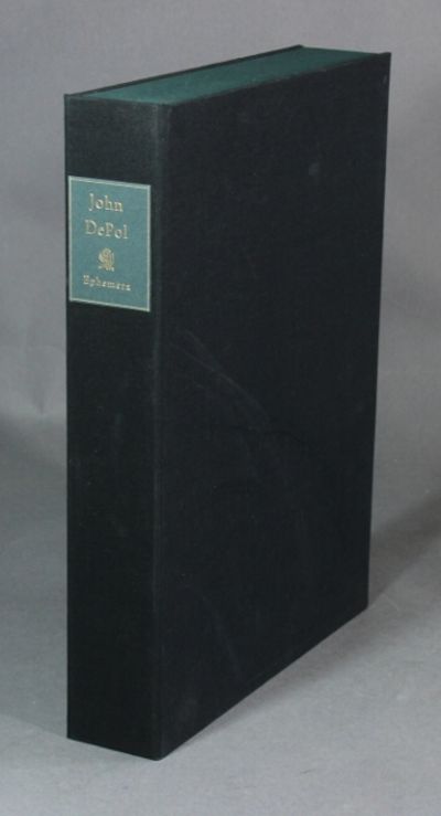 v.p., v.d., 1990. Large quarto clamshell box containing approx. 60 items, including California Flora, Book Club of California, 1995 with 12 wood engravings by DePol; eight 8½" x 11" wood engravings by DePol, all but one numbered, signed and titled by him; two 9" x 5¾" wood engravings, each titled, dated, and signed by DePol; seven 8½" x 11" holiday letters from DePol, most with a reproduction of a DePol wood engraving, 2 with postscripts in ink addressed to Greg Campbell; three other holiday cards for others with wood engravings by DePol; two bifolia printed by The Stone House Press for The Typophiles with wood engravings by DePol; 4 invitations with DePol wood engravings; proof of the covers for the journal Bookways, Nos. 13-14, Oct. 1994 - January 1995 containing a signed proof of the cover wood engraving by DePol, inscribed to Greg Campbell; a large folio printed leaf of the 42-line Bible, inscribed at the bottom in pencil by DePol: "For Greg Campbell, printed on the Gutenberg Press at the Pierpont Morgan Library by Neil Shaver and John DePol on 27 April 1994"; a wood engraving approx. 9¾" x 7", "The Falls at Deepdene," signed by DePol; an 8½" x 11" proof of a wood engraving of The Gutenberg Press, dated and signed by DePol, "The Church of St. Luke in the Fields," a new wood engraving by DePol with commentary by Don Wesely; numerous printed samples of DePol wood engravings on cards, postcards, bookplates, invitations, announcements, printed samples of wood engraved pressmarks; etc., as collected by Greg Campbell.