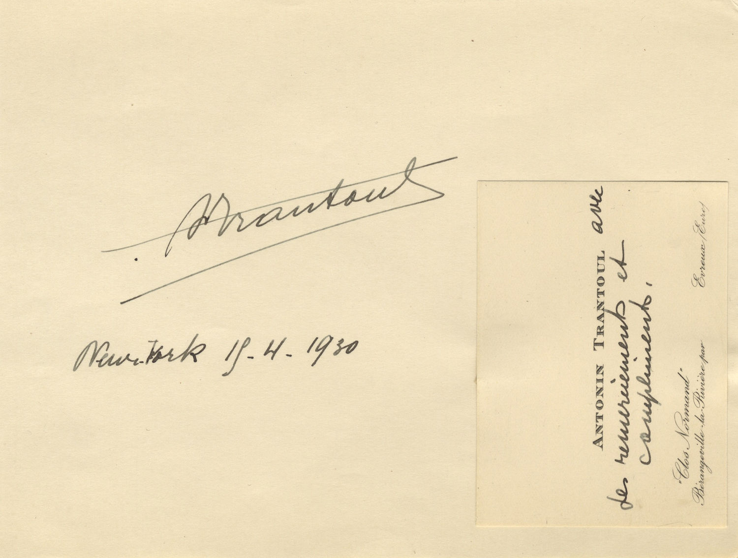 Printed visiting card with autograph sentiment (unsigned). Laid down to mounting sheet with signature ("A. Trantoul) and date "New York 19-4-1930