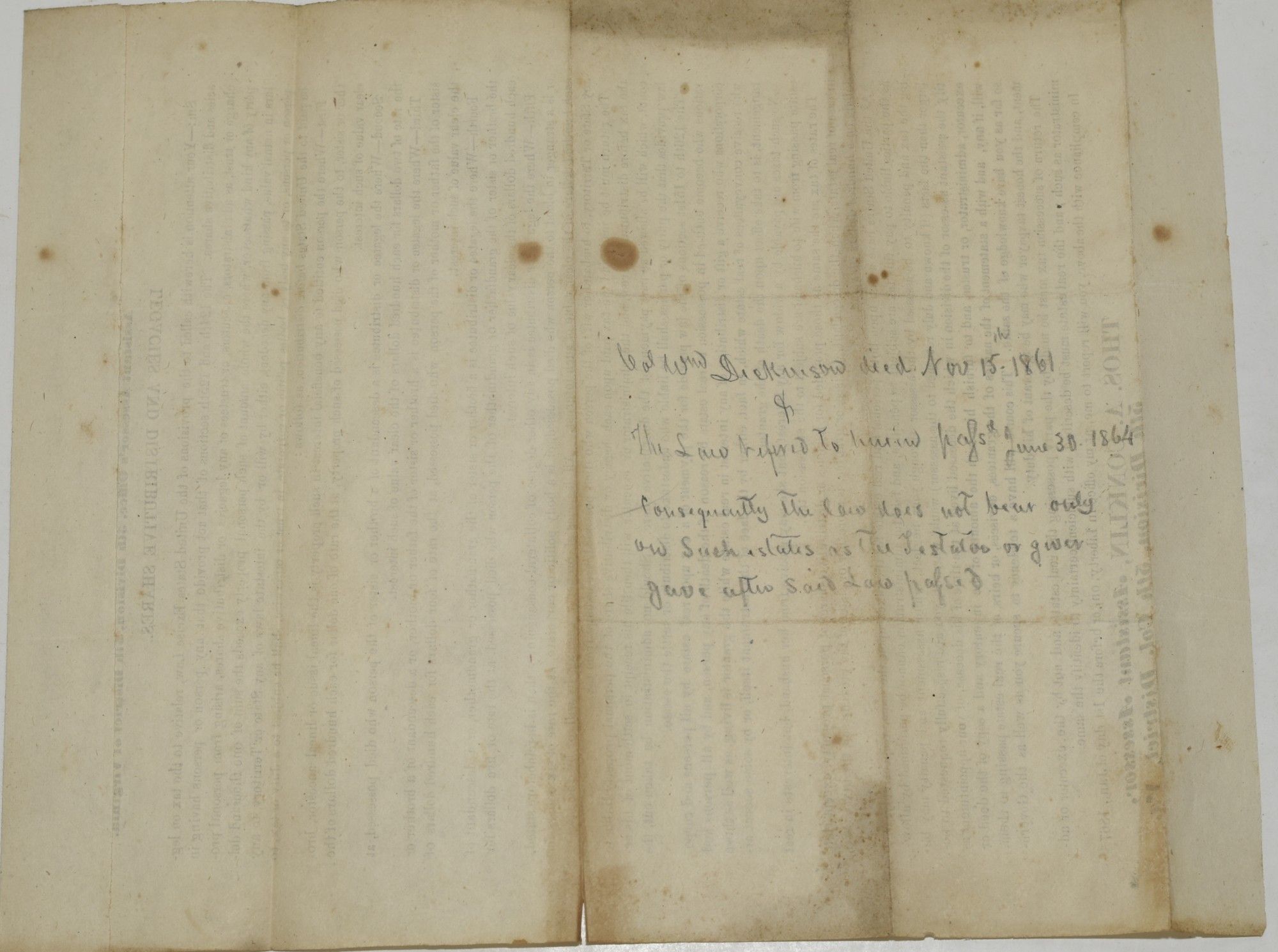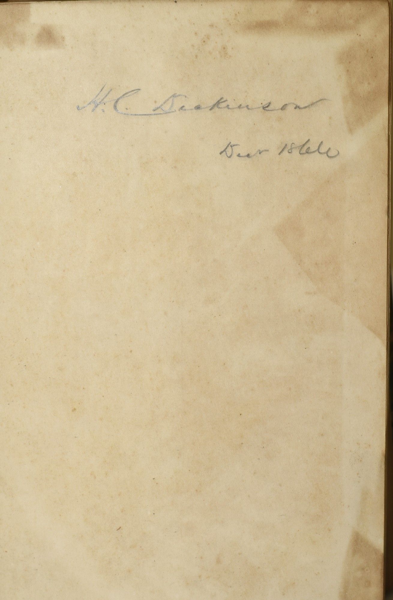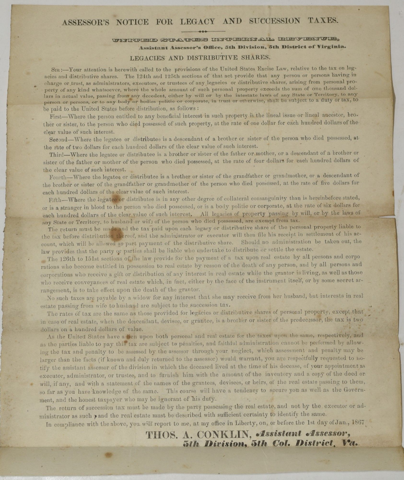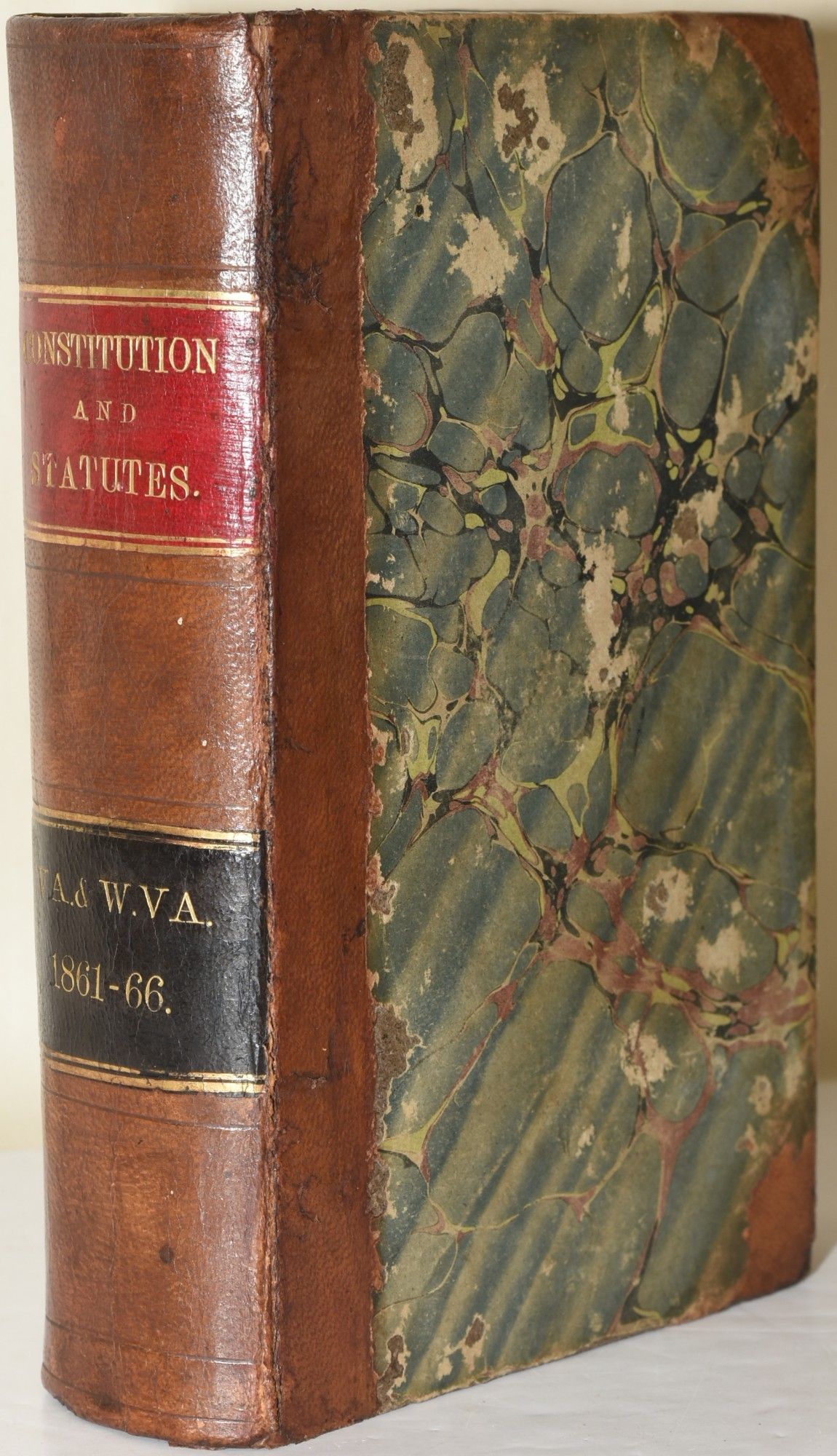 Wheeling: John Frew, 1866. First Edition. Half Leather. Very Good binding. [WITH] CONSTITUTION OF WEST VIRGINIA; [WITH] ACT OF THE LEGISLATION OF WEST VIRGINIA, 1863 ... etc.~This copy with the signature of Henry C. Dickinson of Bedford County, Virginia, Captain in Company A, Second Virginia Cavalry. Dickinson was captured and incarcerated in Federal prisons at Morris Island, Pulaski and Point Lookout. Laid in is a broadside: "Assessor's Notice for Legacy and Succession Taxes" printed up for the "United States Internal Revenue", Assistant Assessor's Office, 5th Division in Virginia by order of Thos. A. Conklin, Assistant Assessor of that Office. There is a pencilled note on the back regarding the death of Col. Wm. Dickinson and the applicability, or not, of the law passed June 30, 1864. Assistant Assessor Conklin directs the recipient to report to his office on, or before the 1st day of Jan., 1867. An interesting artifact from the early days of Reconstruction.~In contemporary calf over marbled boards, with morocco labels. [850] pages, with eight leaves of pink paper inserted and not included in the pagination. The acts are separately paginated. Very Good binding.