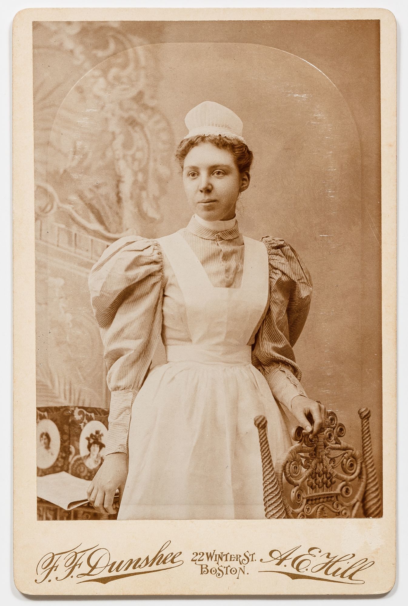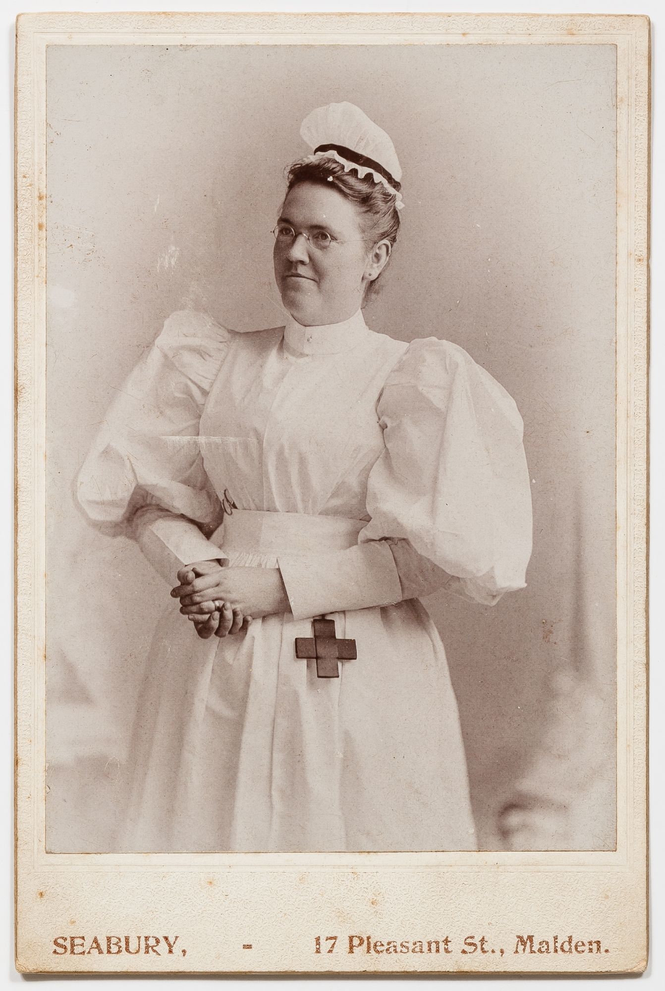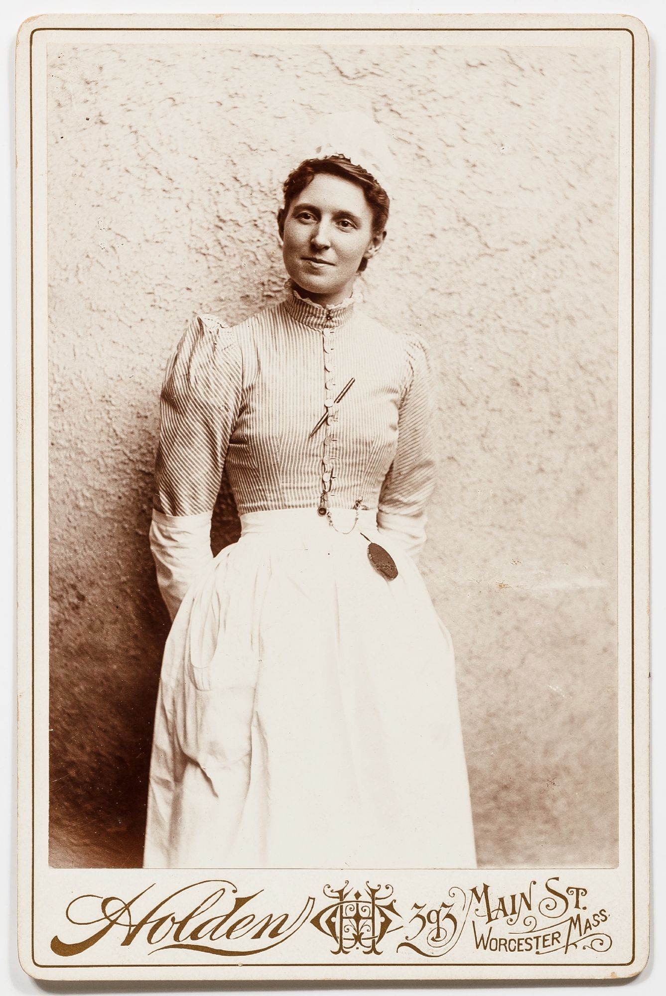 Massachusetts, 1890. Unbound. Very Good. A collection of 6 sepia-toned cabinet cards measuring 4.25" x 6.5". Some slight abrasions and rubbing thus very good. A small assemblage of cabinet cards depicting uniformed nurses from Massachusetts in the 1890s. The women are from Pittsfield, Boston, Worcester, and Malden, and the photos include the stamp of photography studios from those towns. The studios include F.E. Seabury, Rice, Holden, C.R. Hollis, Nowell, and F.F. Dunshee. Three of the photos have captions written in pencil on the verso one of which simply reads "Lynch - Lovingly Luna." The other two captions read, "House of Mercy - Nettie Wise R.N.;" and "Rhoda Lawson Mt. Desert Island, Maine 3-31-1893." Although this second photo is captioned in Maine the photo itself bears the stamp of a Massachusetts photography studio in Worcester. Each womanly is seen smartly dressed in her uniform, Rhoda Lawson has a pen tucked into the buttons of her blouse and many of them are seen with pocket watches. One of the photos shows two nurses, one standing, and one seated, the standing nurse is holding a pen.