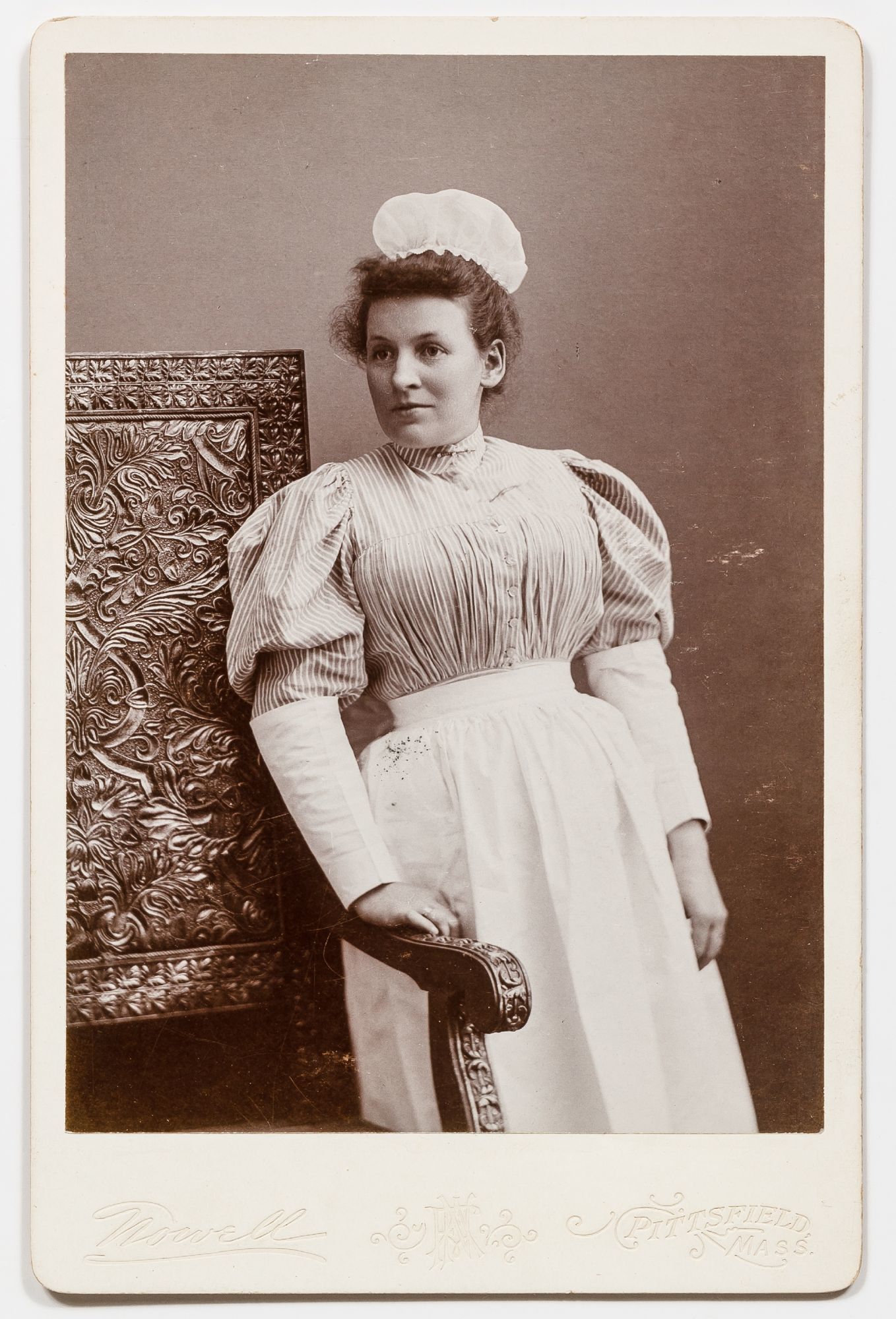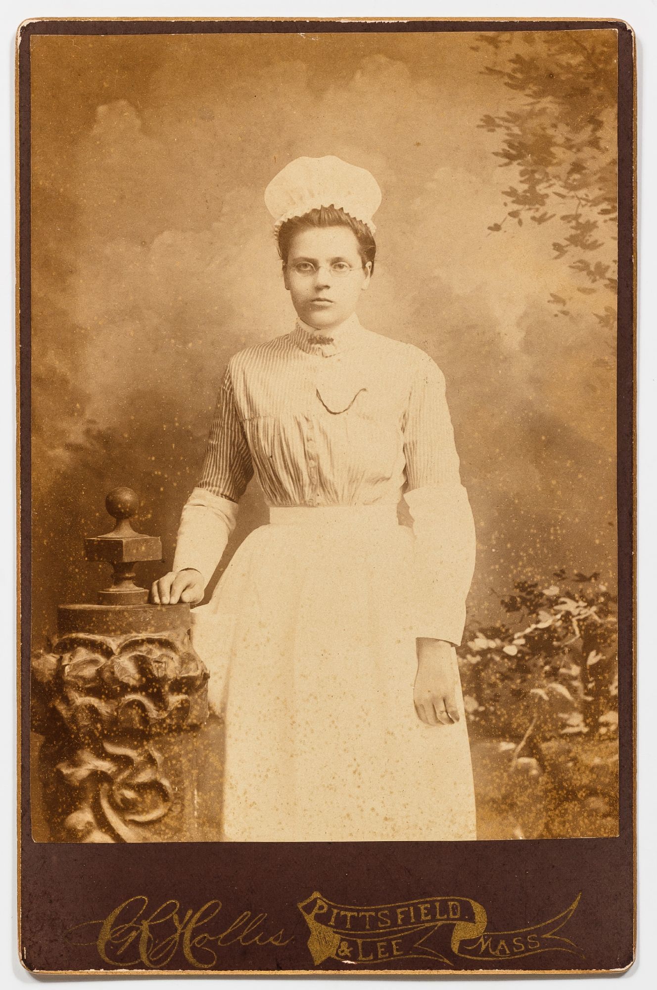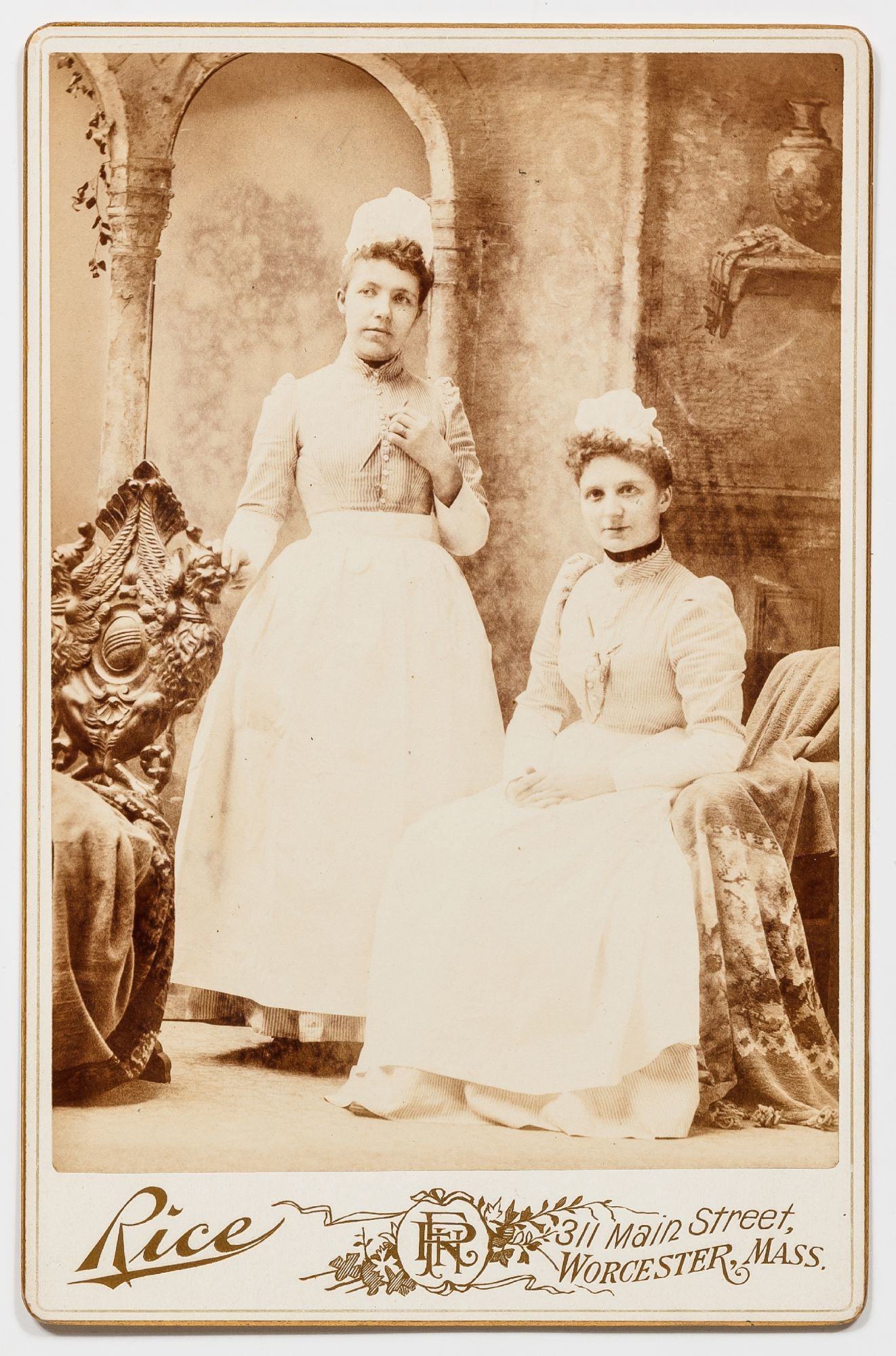 Massachusetts, 1890. Unbound. Very Good. A collection of 6 sepia-toned cabinet cards measuring 4.25" x 6.5". Some slight abrasions and rubbing thus very good. A small assemblage of cabinet cards depicting uniformed nurses from Massachusetts in the 1890s. The women are from Pittsfield, Boston, Worcester, and Malden, and the photos include the stamp of photography studios from those towns. The studios include F.E. Seabury, Rice, Holden, C.R. Hollis, Nowell, and F.F. Dunshee. Three of the photos have captions written in pencil on the verso one of which simply reads "Lynch - Lovingly Luna." The other two captions read, "House of Mercy - Nettie Wise R.N.;" and "Rhoda Lawson Mt. Desert Island, Maine 3-31-1893." Although this second photo is captioned in Maine the photo itself bears the stamp of a Massachusetts photography studio in Worcester. Each womanly is seen smartly dressed in her uniform, Rhoda Lawson has a pen tucked into the buttons of her blouse and many of them are seen with pocket watches. One of the photos shows two nurses, one standing, and one seated, the standing nurse is holding a pen.