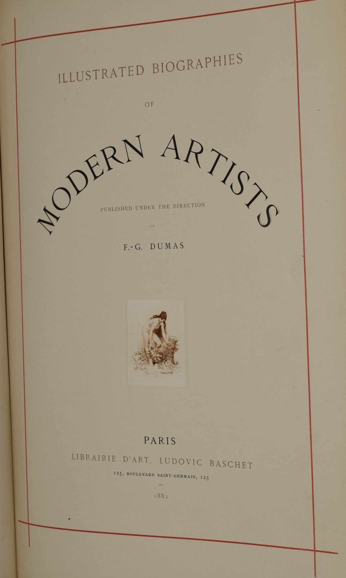 Paris: Librairie d'Art | Ludovic Baschet, 1882. Full Leather. Very Good binding. A sumptuously bound folio volume, in full navy blue levant with titling in gilt to the front board and the spine; with white watered silk doublures, and turn-ins with dentelles; all edges gilt. There are twelve sections bound together: Sir Frederick Leighton; John Everett Millais; Hubert Herkomer; Paul Jacques Aime Baudry; Josef Israels; Adolf F. E. Menzel; Carl von Piloty; Hans Makart; James Clarke Hook; Alexandre Cabanel; and Jean Louis Meissonier. The front board has been discreetly reattached and the silk endsheets have been reglued. A very handsome book. Very Good binding.