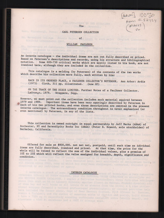 Berkeley: Serendipity Books. Original printing. Paperback. Very good. Quarto [28 cm] Xeroxed pages in a velo binding. A massive interim catalogue offering the Faulkner collection amassed by his bibliographer, Carl Petersen. From the cover page- "An interim catalogue- the individual items are not yet fully described or priced. Based on Petersen's descriptions and records, using his structure and bibliographical notation...This catalogue is a melding (by Petersen) of the contents of the two works which describe his collection more fully, each written by him: EACH IN ITS ORDERED PLACE, A FAUKLNER Collector's Notebook... ON THE TRACK OF THE DIXIE LIMITED." With a section titled "Qualifications of the Appraiser," which lists Peter B. Howard's educational background, Serendipity Books' average annual sales, and regular clients seeking appraisal services.