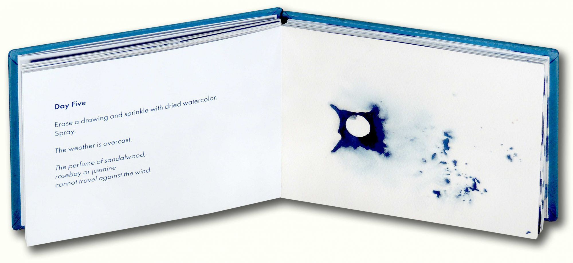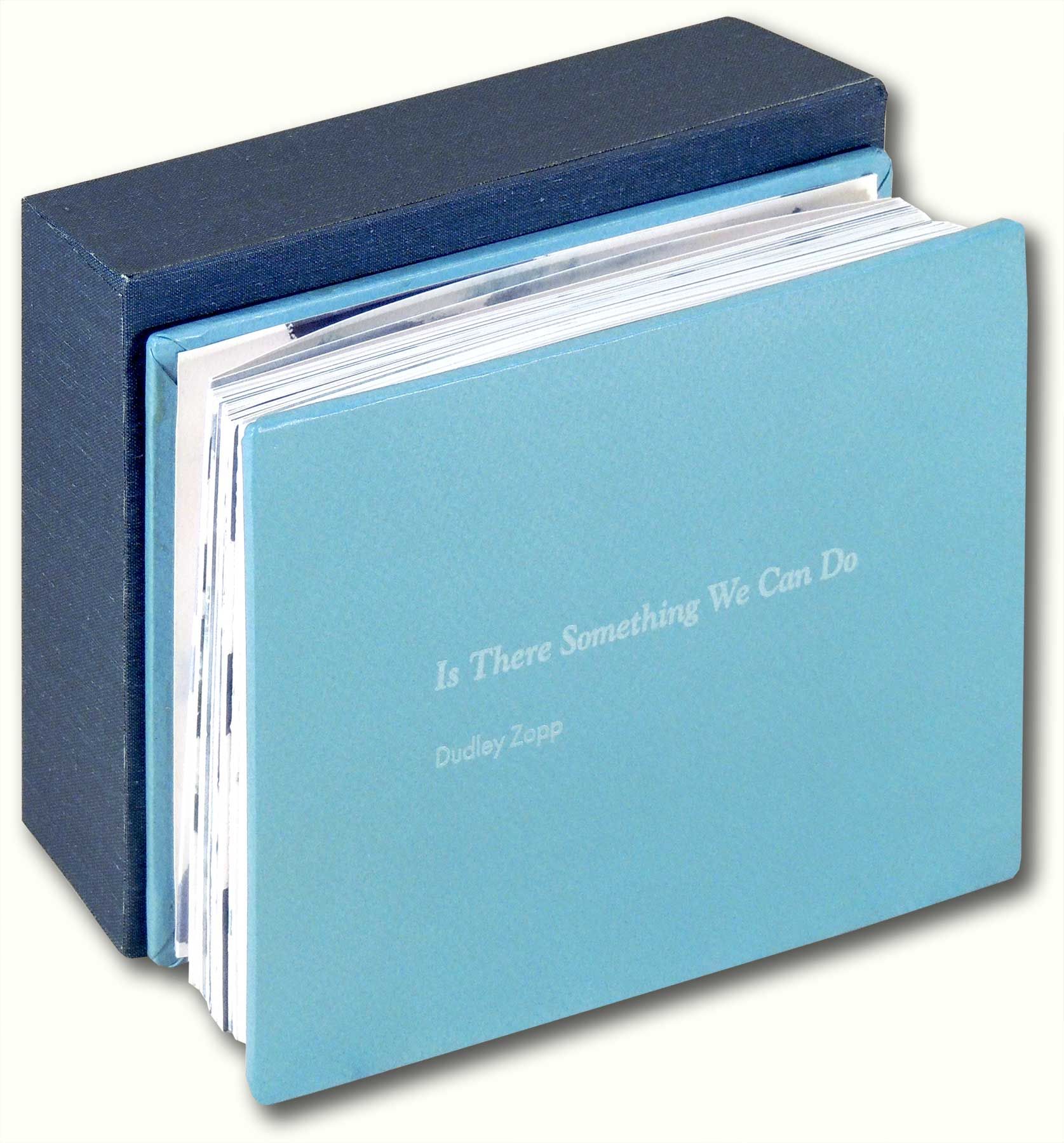 Design, typography, and assembly of books and cases are by Richard Reitz Smith. Text and images are printed as offset lithography by Penmore Lithographers. Typeset inFutura on Cougar Opaque Smooth paper. Covers are blue Dover book cloth.The book is presented in an accordion format and can be read in the round or displayed as sculpture. The book is housed in a dark blue cloth slipcase with an archival pigment print of the drawing for Day Sixteen. Book measures 5 x 7 inches. 82 pages. In fine condition.
