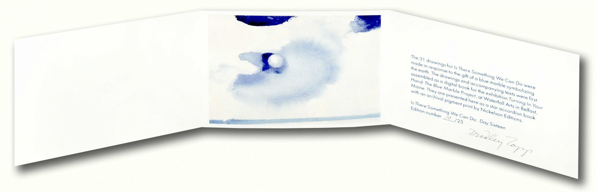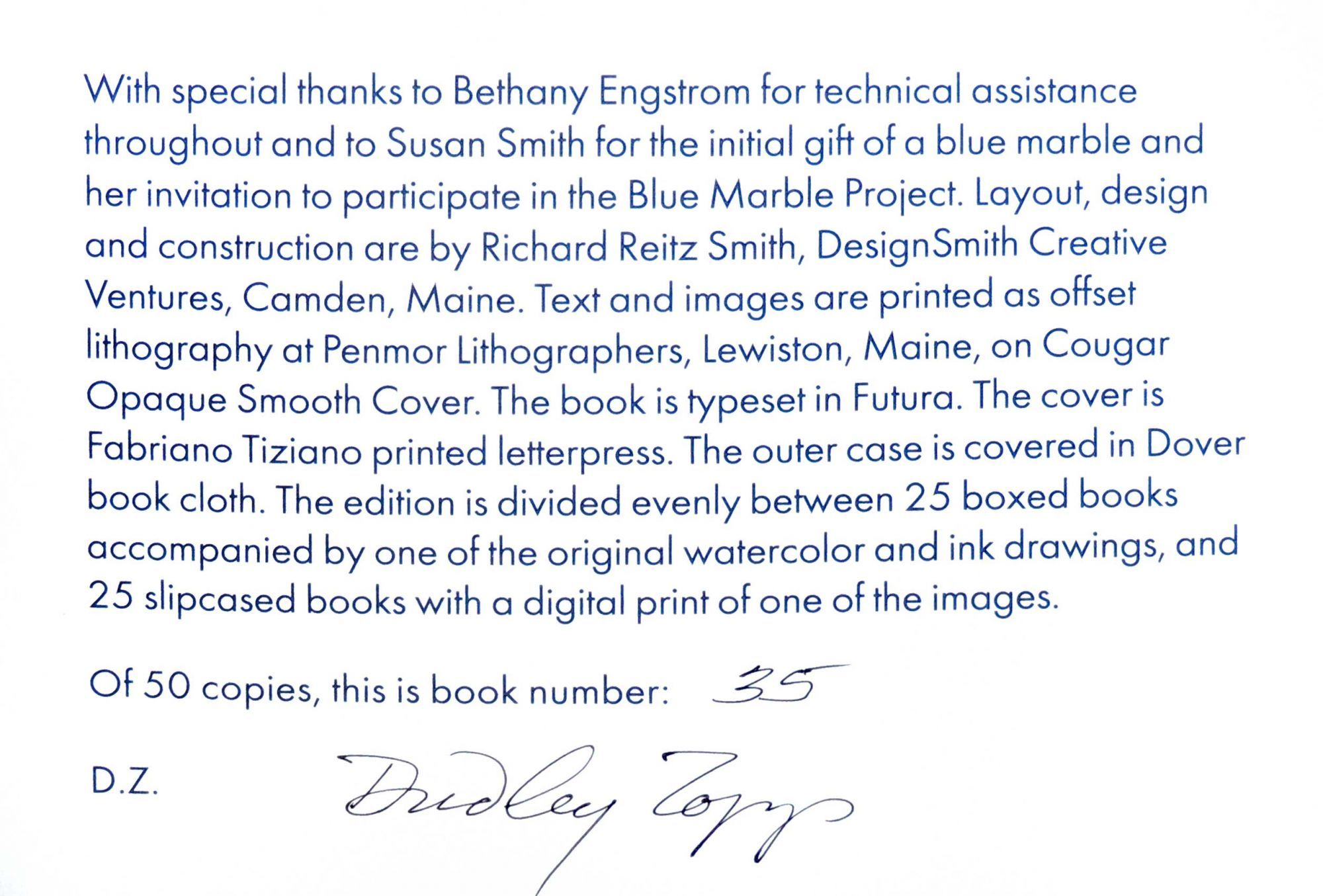 Lincolnville, ME: Dudley Zopp, 2017. Hardcover. Fine. Hardcover. Number 10 of 25 standard copies, issued with an archival pigment print in a slipcase. There is also a deluxe edition of 25 copies. Signed and numbered by the book artist. This book considers our relationship to the Earth in a sequence of annotated watercolors. It was originally presented digitally for a 2014 exhibition "Turning in Your Hand: The Blue Marble Project,” at Waterfall Arts in Maine. Twenty artists were given a blue marble and asked to respond to the pale blue dot we call home. Dudley's images and notations provide a unique look into the oldest of concerns: our place in this world (artist's statement). The illustrations began with a month-long daily ritual of erasing an earlier charcoal drawing and, using watercolor and ink, creating a new drawing in its place. As part of this Dudley noted the weather and the color of the ocean as seen from her studio. She also added a few lines adapted from ancient Buddhist texts that relate to human interactions with the earth. A few examples include: "As a mother watches over her child, so with a boundless heart should one cherish all living beings, suffusing the whole world with loving kindness", "All beings tremble before violence", and "You too shall pass away." The resulting 31 watercolors were collected in a mystical and magical book that beautifully captures Dudley's artistic consideration of our place in the world.