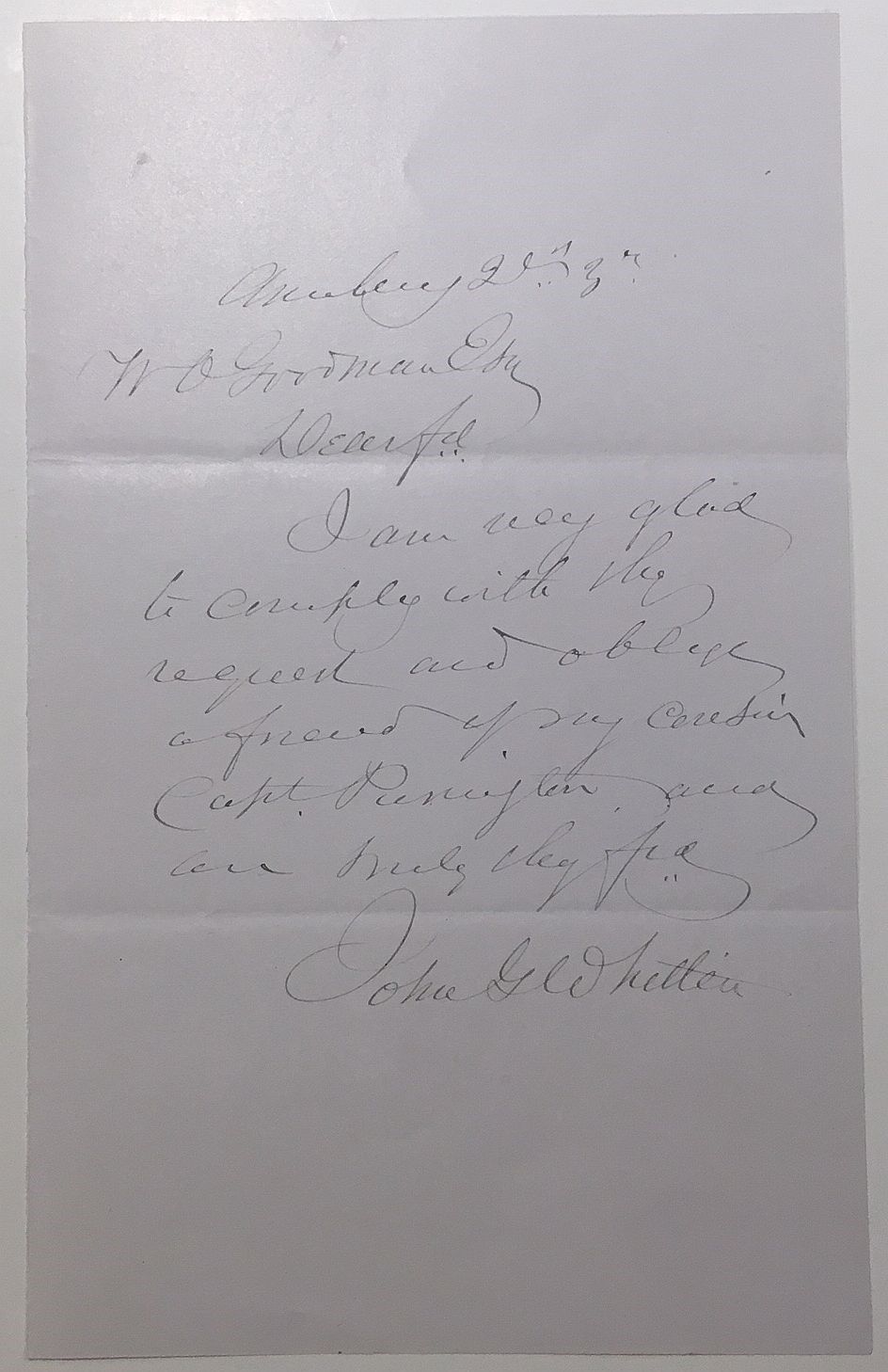 1883. unbound. near fine. 1 page, 8 x 5 inches, Monday 21st, 1883, responding to a request, in full: "I am very glad to comply with the request and oblige a friend of my cousin Captain Pennington, an am truly..." Natural folds and in near fine condition.