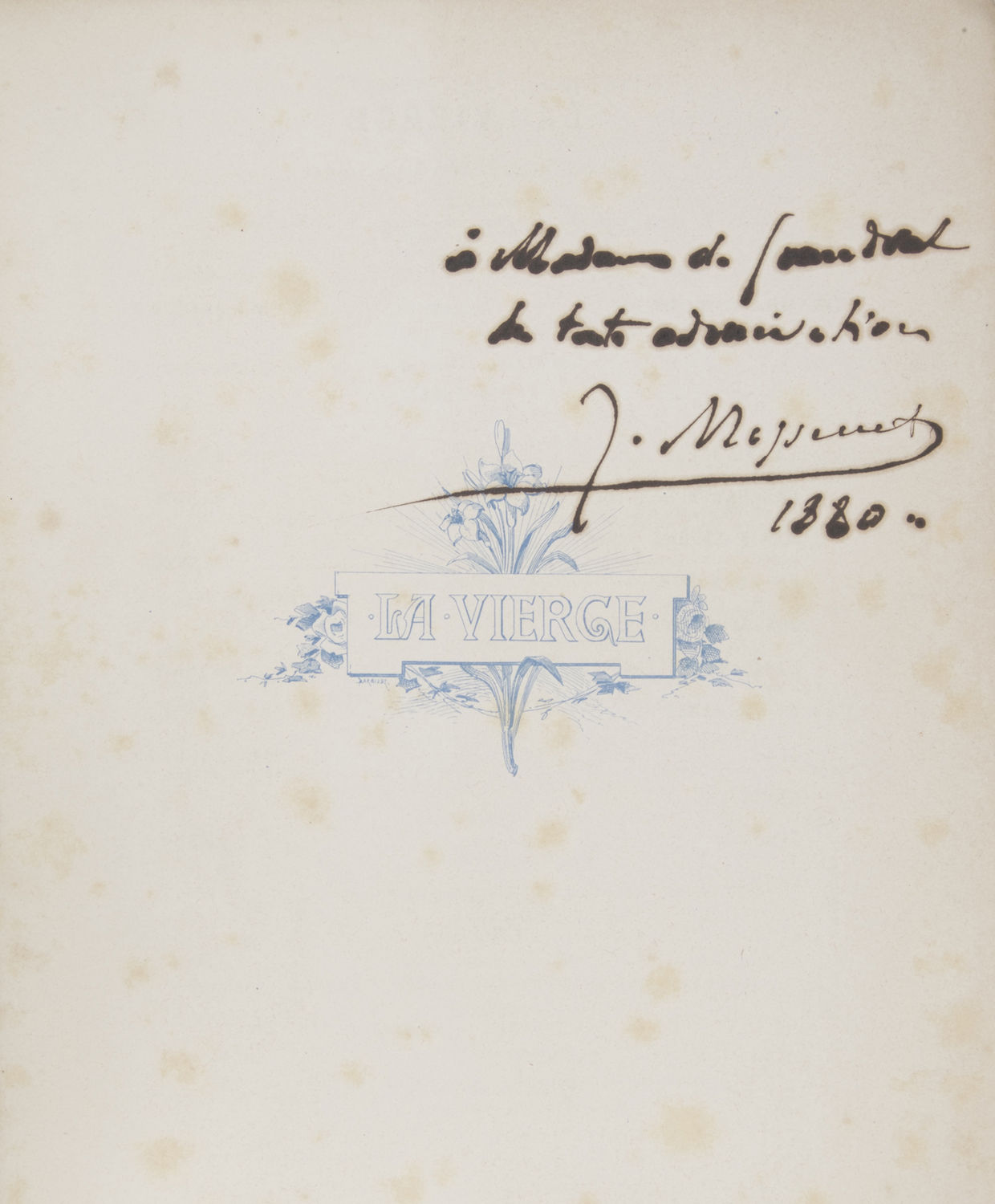 With an autograph inscription signed by the composer ("J. Massenet") to Madame de Grandval (the composer Marie-Félicie Clémence de Reiset 1828-1907) and dated 1880 to upper outer corner of half-title.