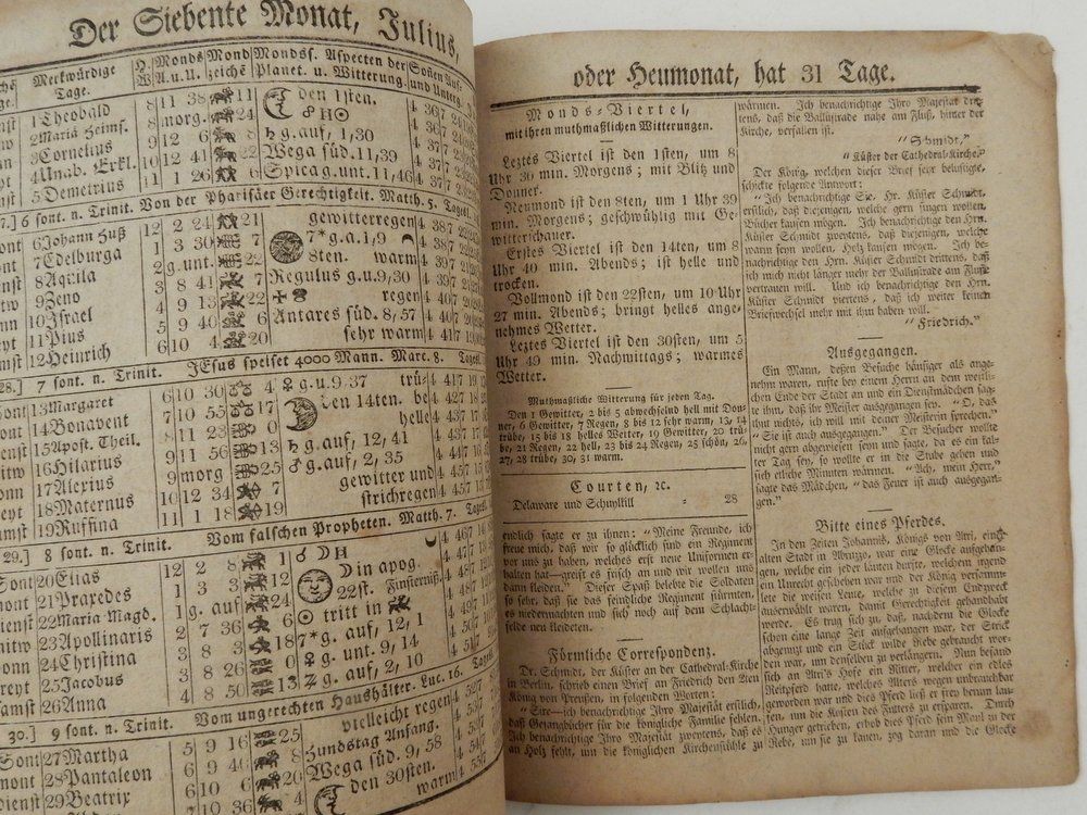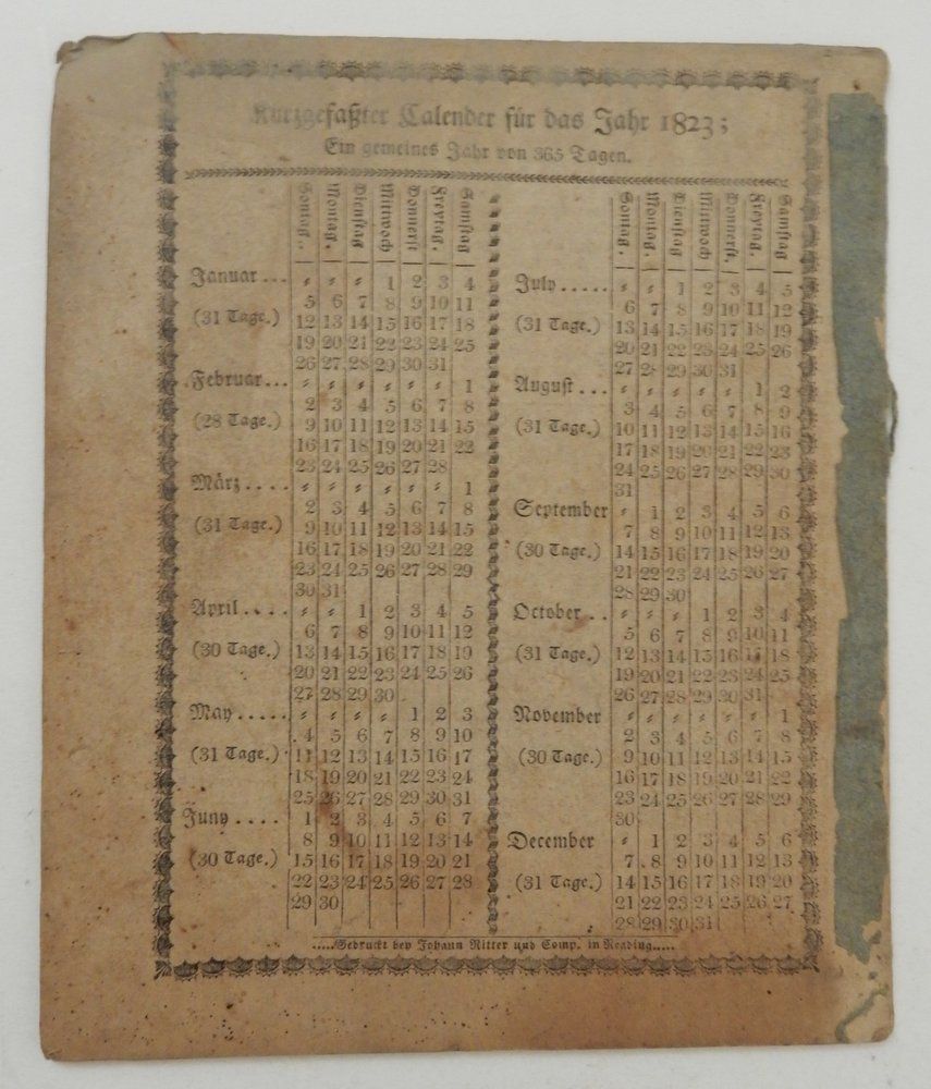 Reading, (Penn.): Gedruckt und zu haben bey Johann Ritter und Comp. Wie auch bey unterschiedlichen Stohrhaltern und andern zu finden, 1822. First Edition. Wraps. Very Good. First Edition. [36] pages. 6 3/4 x 8 inches. Buff printed self wrappers. Cover title: Der Neue Readinger Calender. Signatures: A-C . Illustrated cover and one other cut internally (other than small cuts of moon on calendars). Portions of original blue spine paper still present. Upper right corners with some loss (no loss text). Wraps. Illustrated cover is signed in cut "W. Schöner fec. Rea.