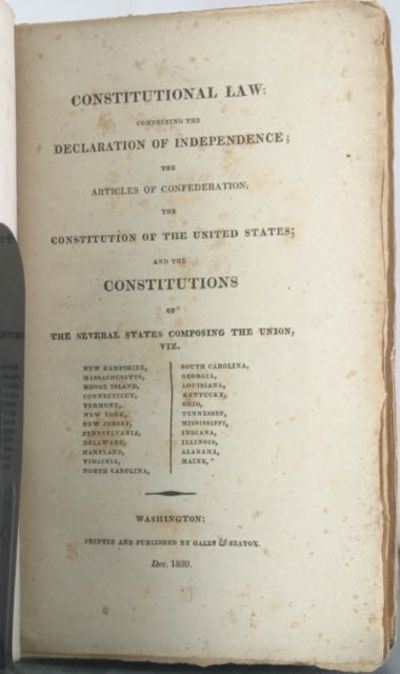 Gales and Seaton, 1820. Second Edition. Hardcover. Good. Washington, 1820. 12mo, [iv], 409 pp. Contemporary paper covered boards. Expanded to include 23 states, including Alabama and North Carolina. The first edition, published a year earlier, included just 21 states. A good copy with fraying and chipping to paper at spine, foxing to contents and contemporary ownership marks to endpapers. Contents complete. Please contact us for additional pictures or information. Seven copies in OCLC. Cohen, Bibliography of Early American Law 3014.