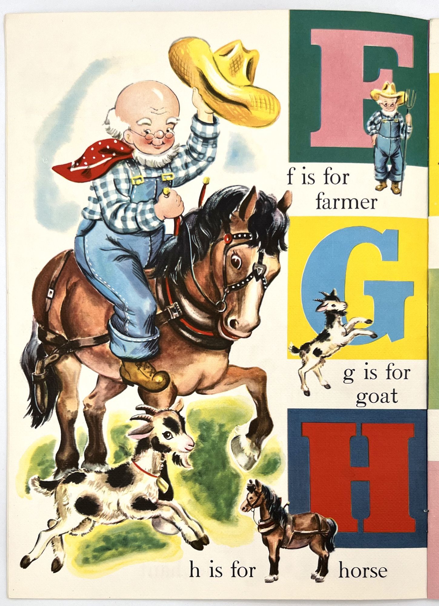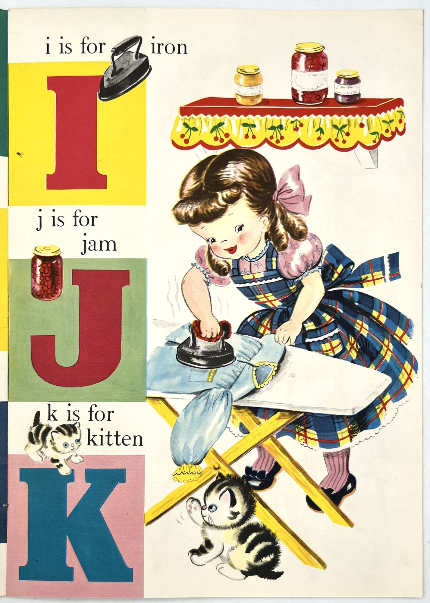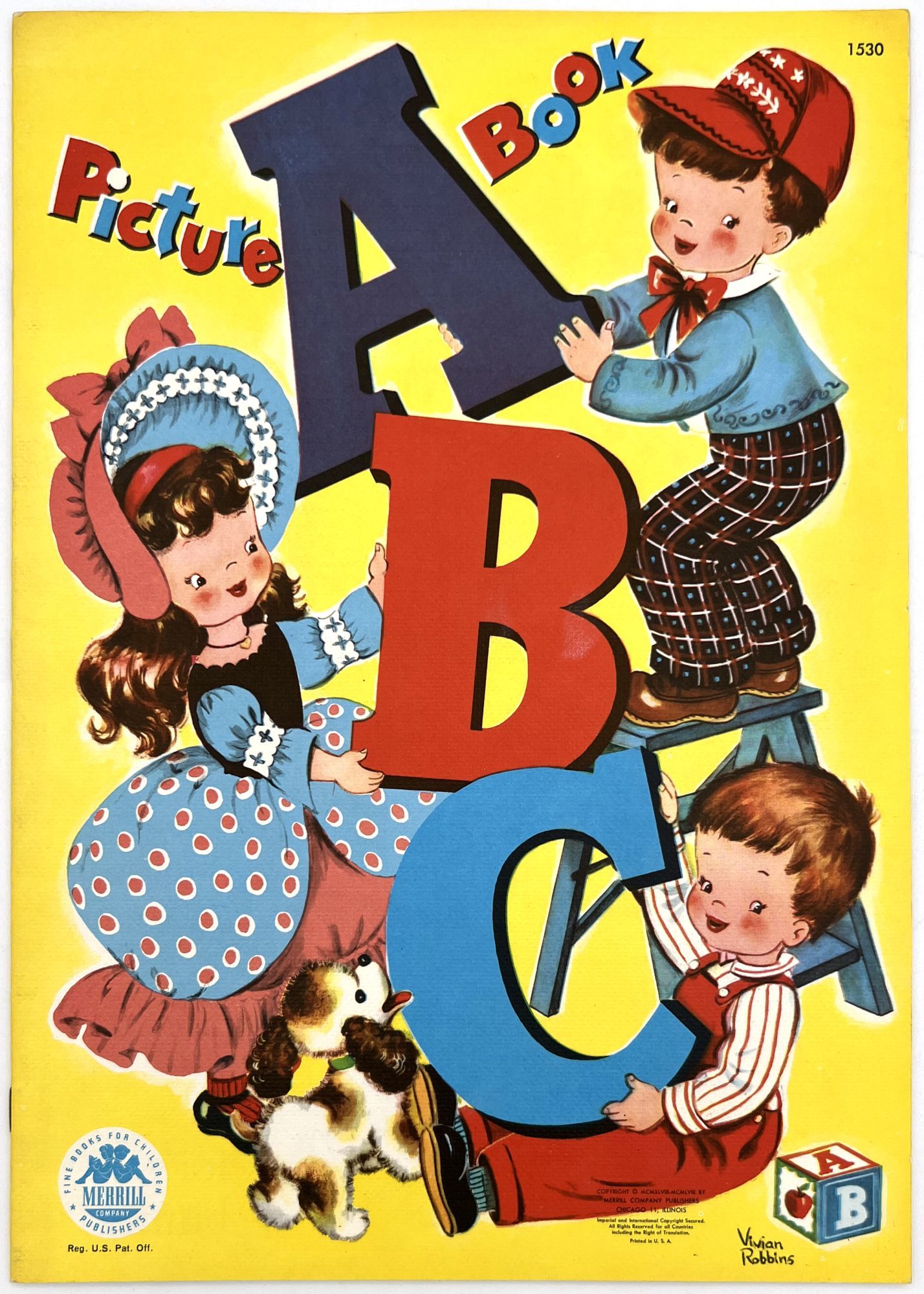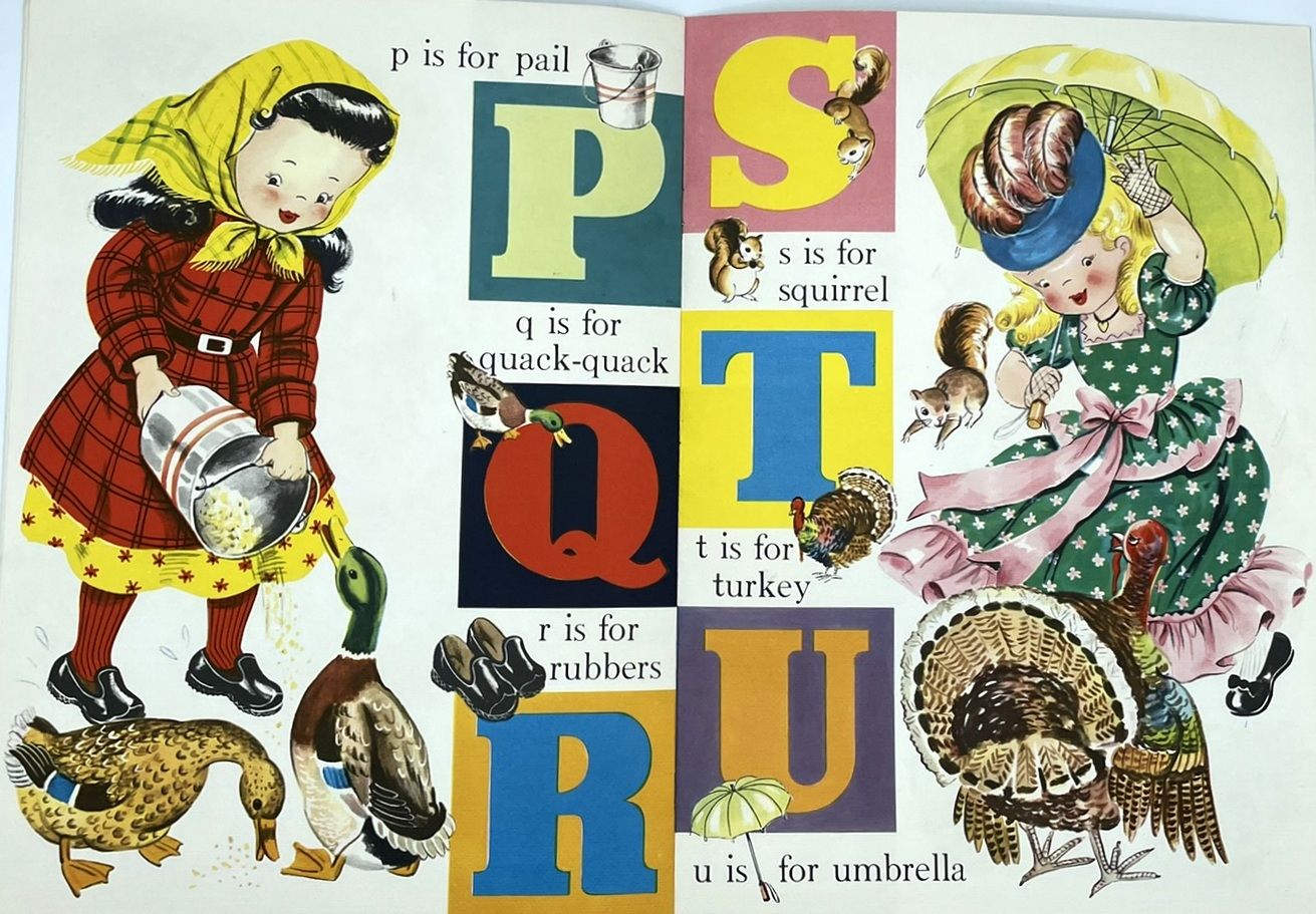 New York: Saalfield Publishing, 1916. 8 pp. Die-cut alphabet or ABC book illustrated by "Albert". The front cover depicts children on roller skates. Each of the alphabet letters depicts an anthropomorphic dog in different situations. A reads a book on title page. Antics of this same dog throughout with relevant rhyming verse and imagery. S is for Scare-crow. Printed in two colors on short pulp paper. Heavy card stock covers. Measures 8" x 5