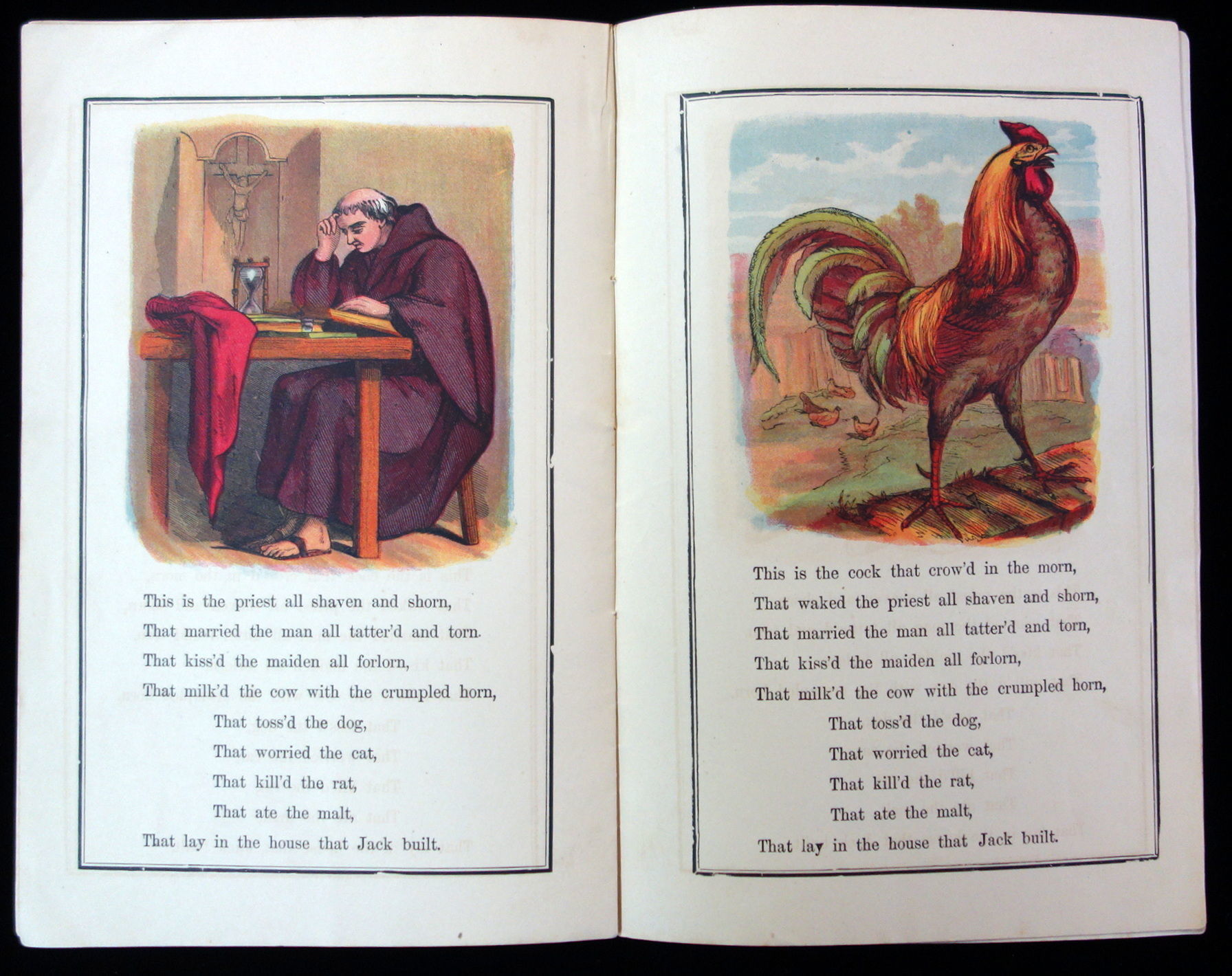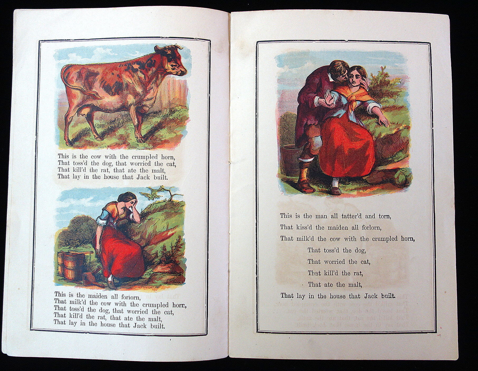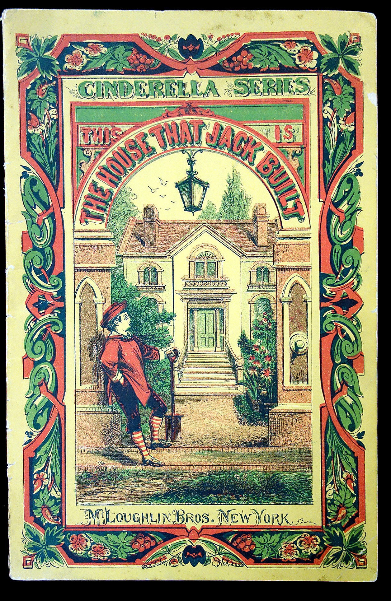 New York: McLoughlin Brothers, 1879. This book beautifully illustrates the classic and popular British nursery rhyme and cumulative tale, "The House that Jack Built." This is apart of the Cinderella Series, printed by the McLoughlin Brothers. The cover is printed on yellow wrappers, and the front cover depicts a boy standing at the gate of a house. The back cover has printed advertisements for other series offered by the publishers.