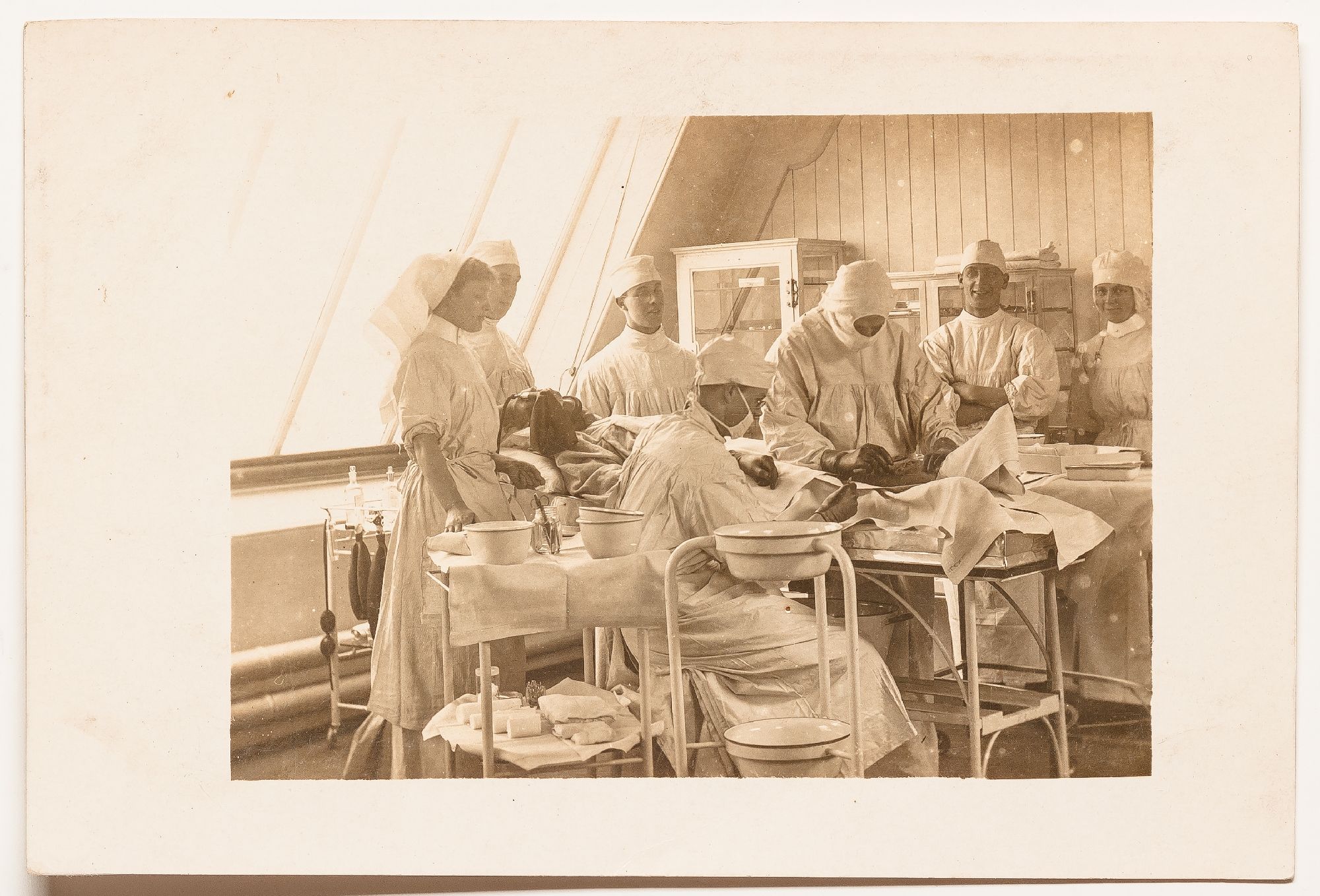 1940. Unbound. Near Fine. Two sepia-toned pictorial photographs measuring around 3.5" x 5.5". Near fine with some slight rubbing. Two pictorial photographs depicting doctors and nurses operating on two separate patient around 1940. One of the photos appears to be earlier than the other, but both show scrubbed doctors and nurses in the middle of a procedure with surgical masks and head coverings. An interesting pair of images capturing medical professionals mid-surgery.