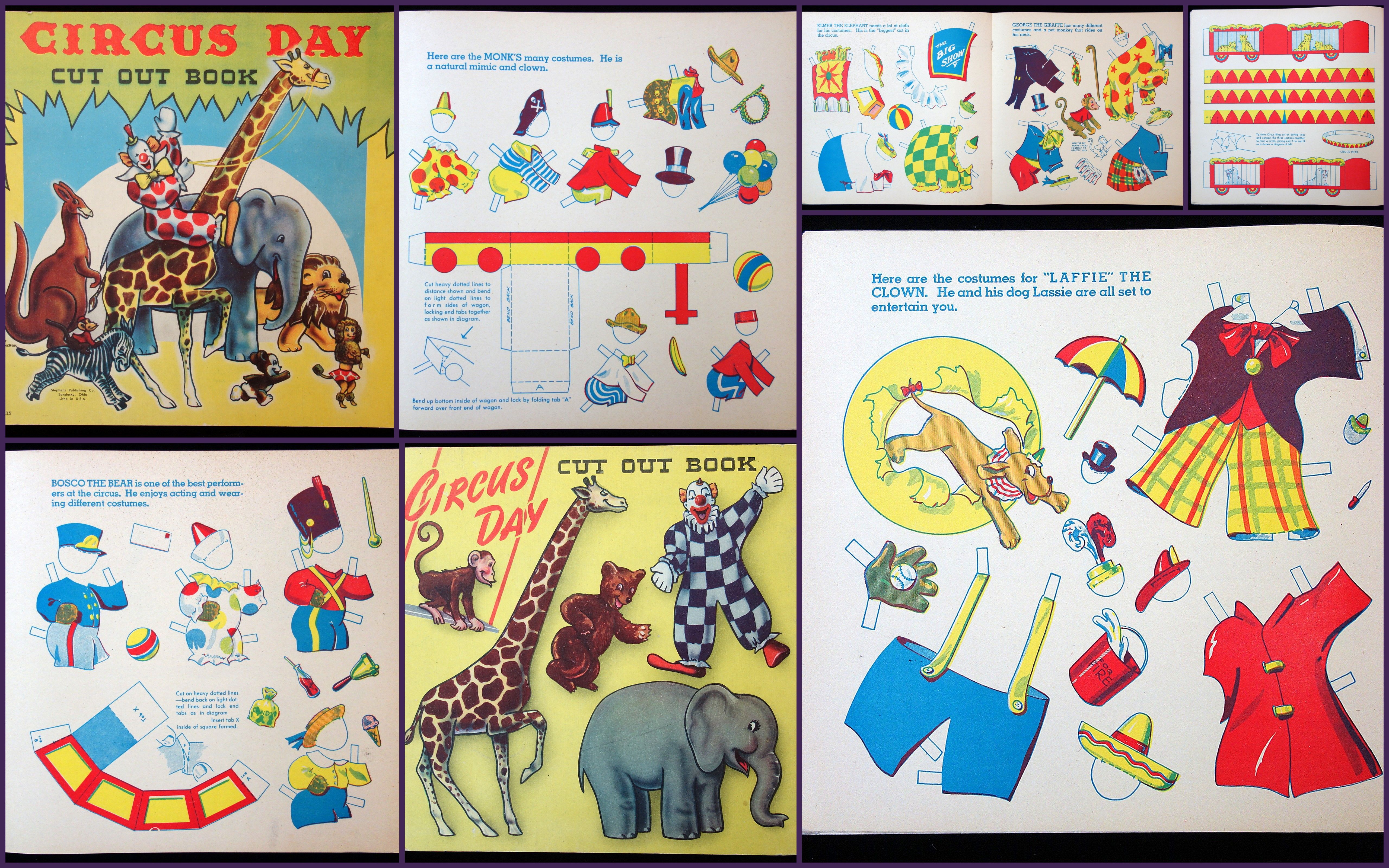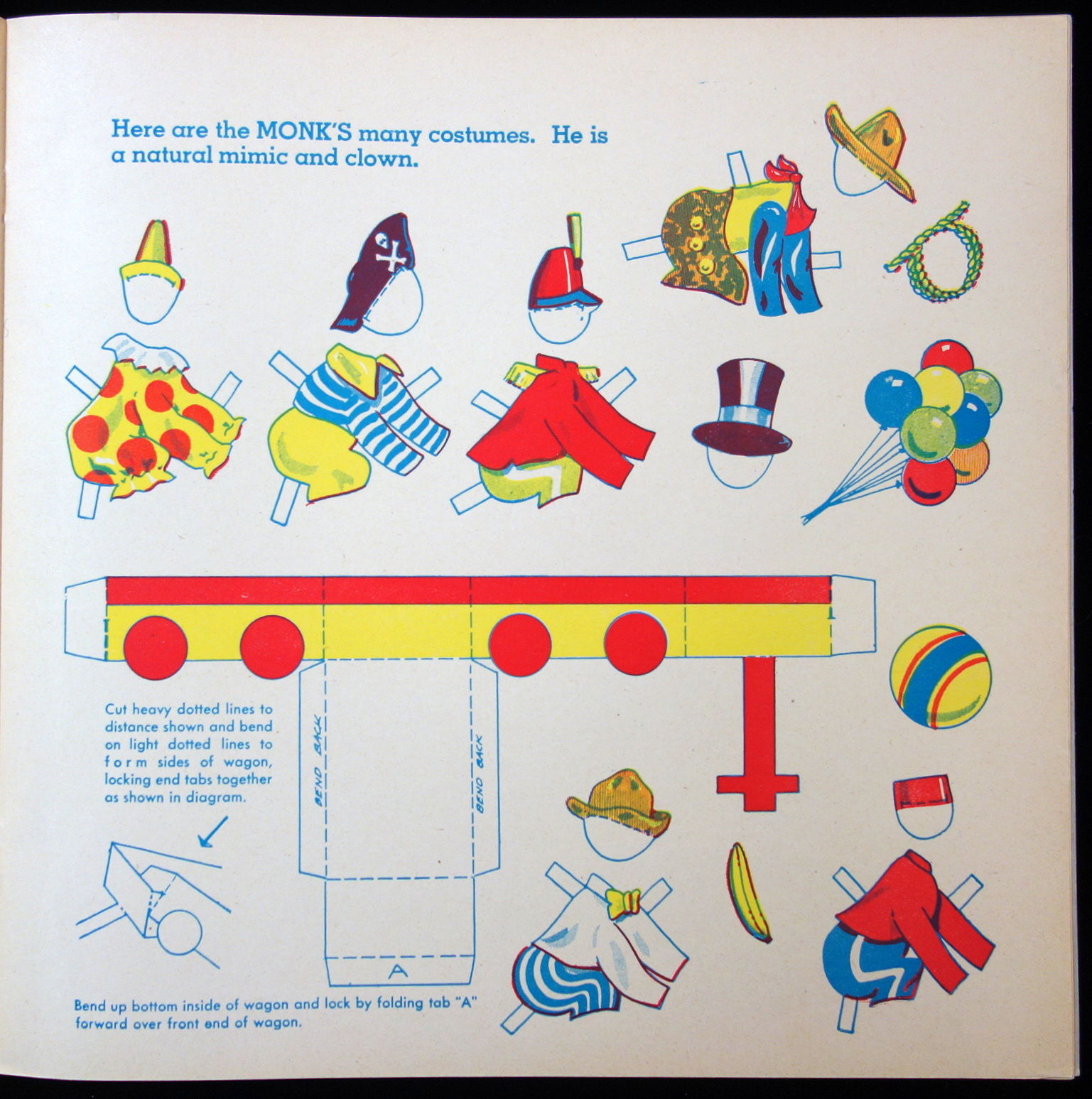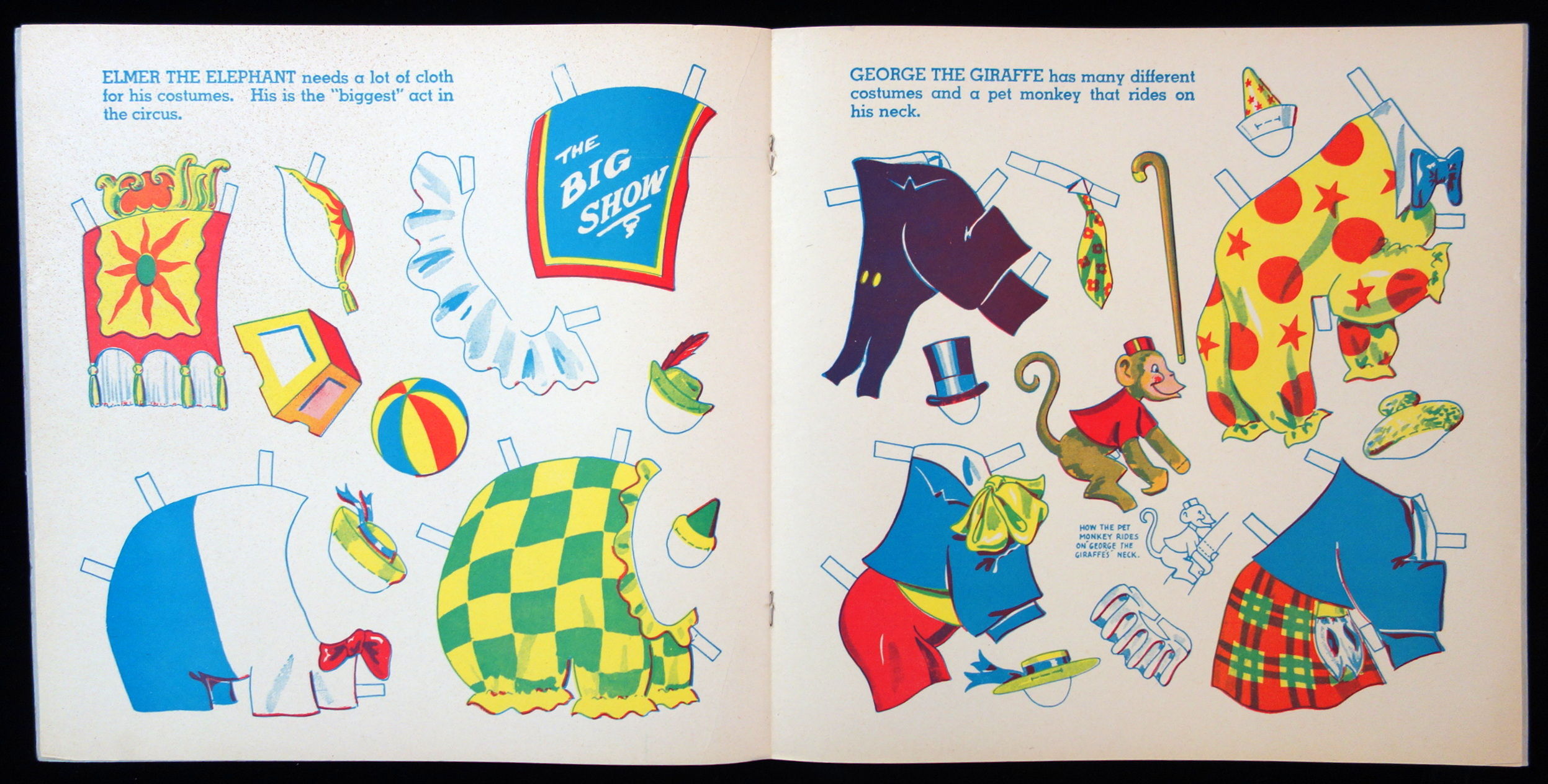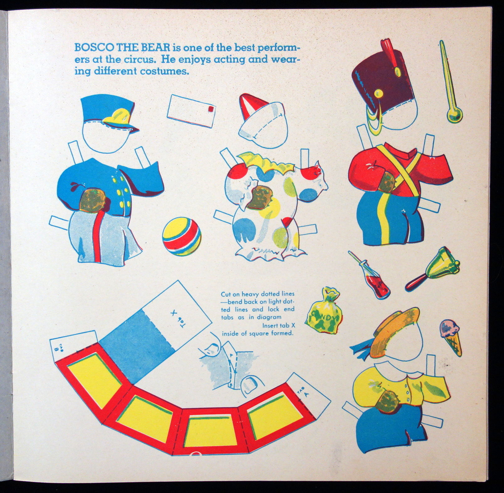 Sandusky, OH: Stephens Publishing, 1950. 6 page paper doll book with heavy stock covers. Paper dolls printed on back cover. Each character has a page of costumes and accessories. They include Bosco the Bear, Monk (monkey), Elmer the Elephant, George the Giraffe and Laffie "the Clown. The final costume page is the circus ring and animal cars. Measures 10 1/2" x 10 3/4
