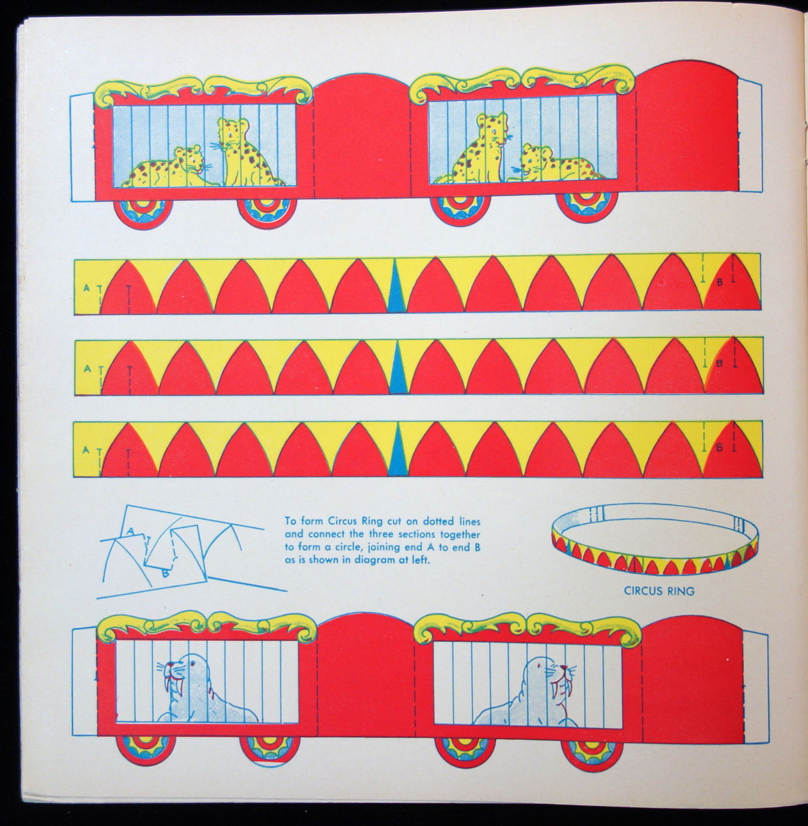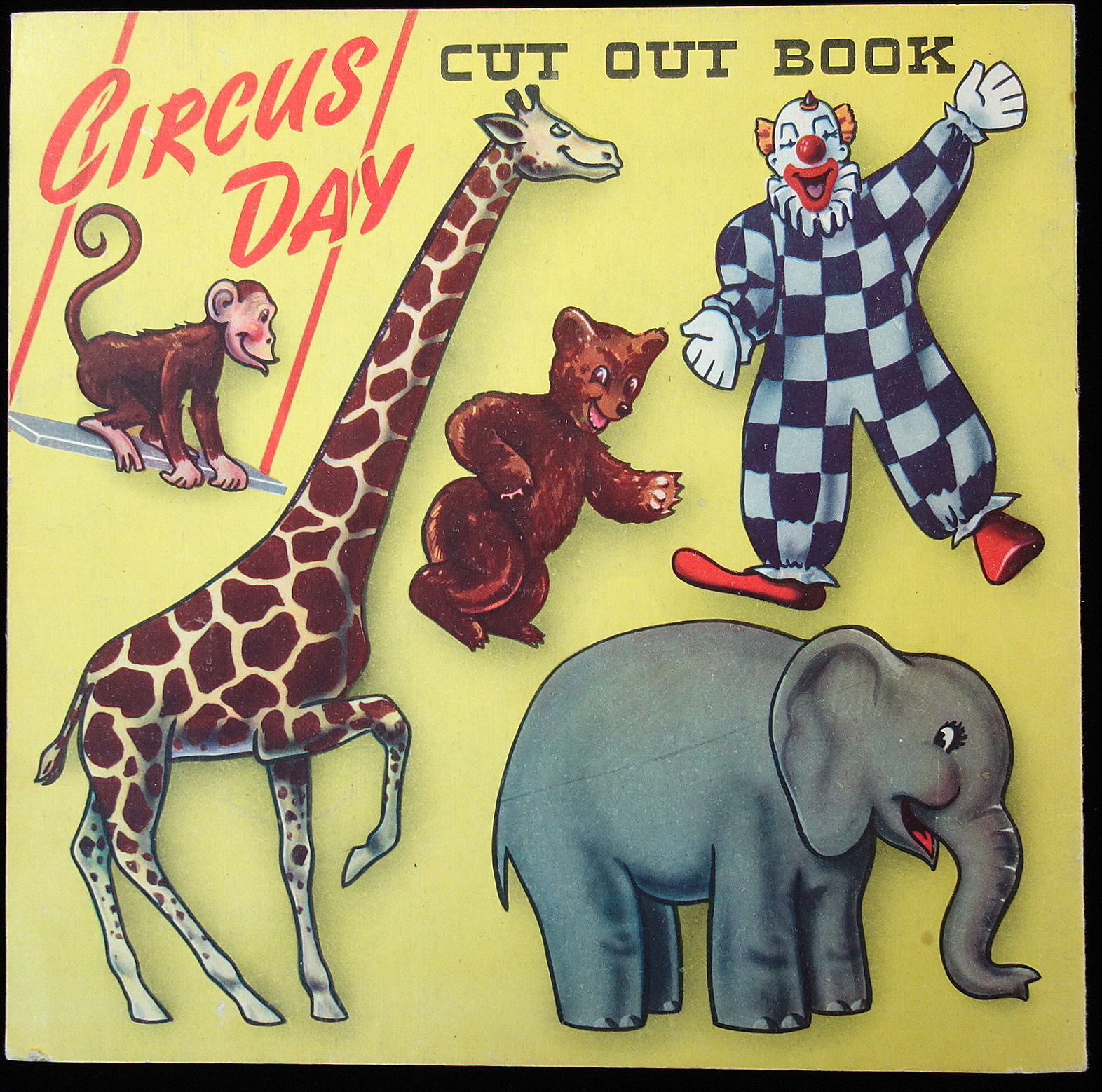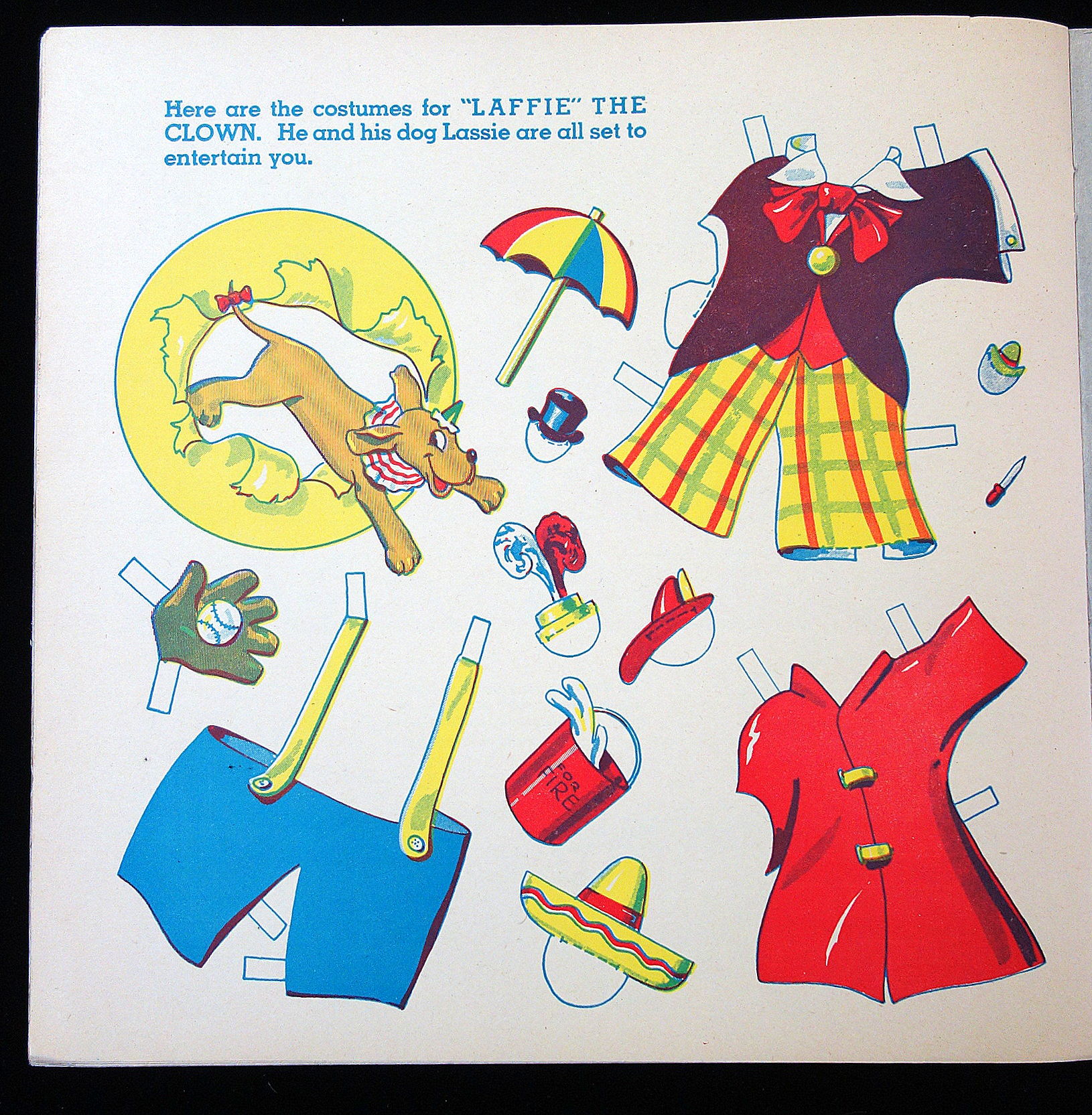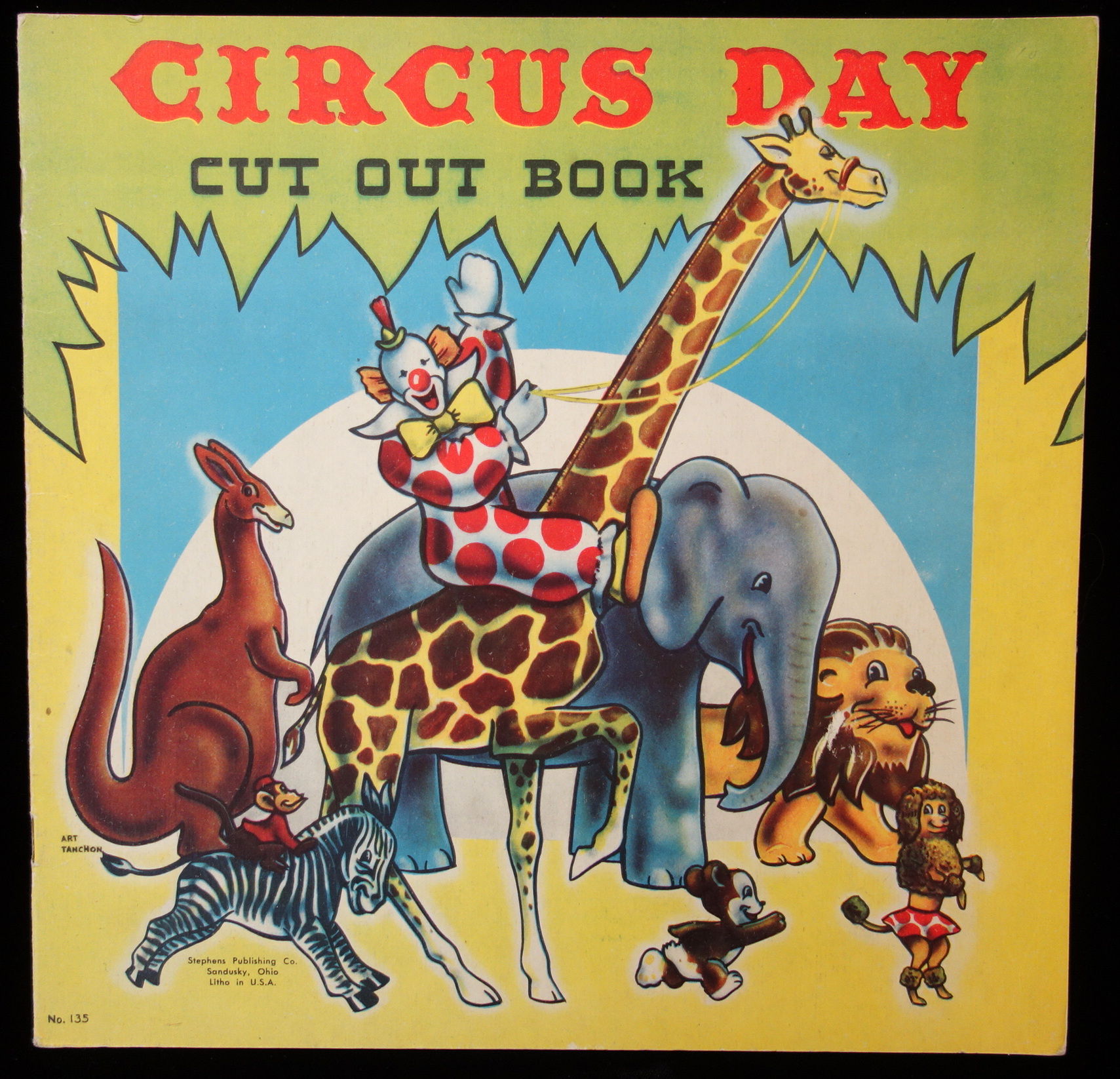 Sandusky, OH: Stephens Publishing, 1950. 6 page paper doll book with heavy stock covers. Paper dolls printed on back cover. Each character has a page of costumes and accessories. They include Bosco the Bear, Monk (monkey), Elmer the Elephant, George the Giraffe and Laffie "the Clown. The final costume page is the circus ring and animal cars. Measures 10 1/2" x 10 3/4